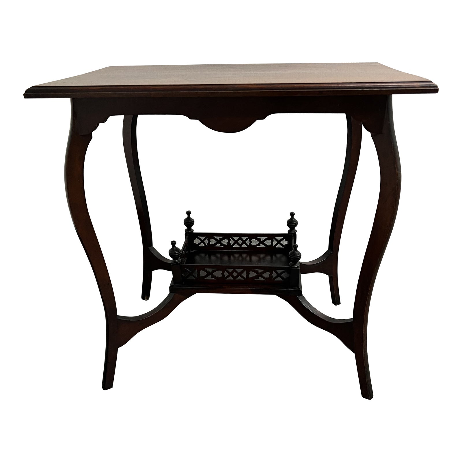 Design Plus Gallery presents the Antique Wood Side Table. Features a rectangular tabletop with convex curved edges, and a compact lower shelf decorated with a fence accent. This table is constructed with wood, and its legs display cabriole-style curves. Minor wear from age and use; table is in good condition.
