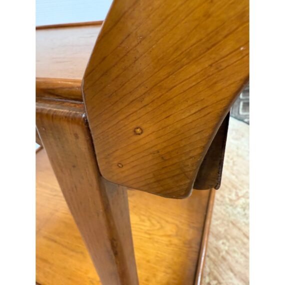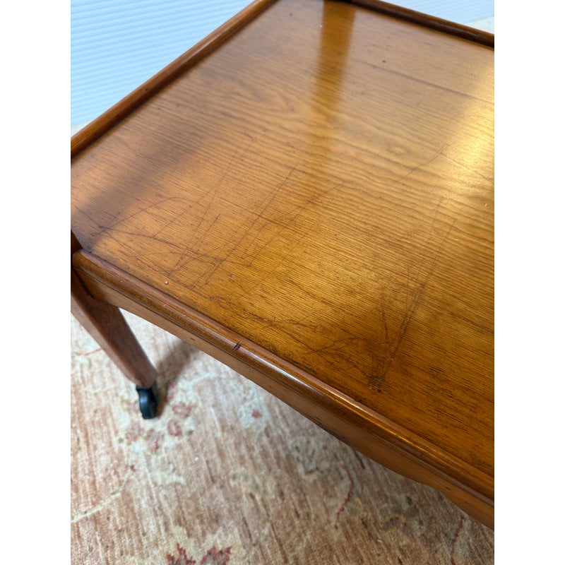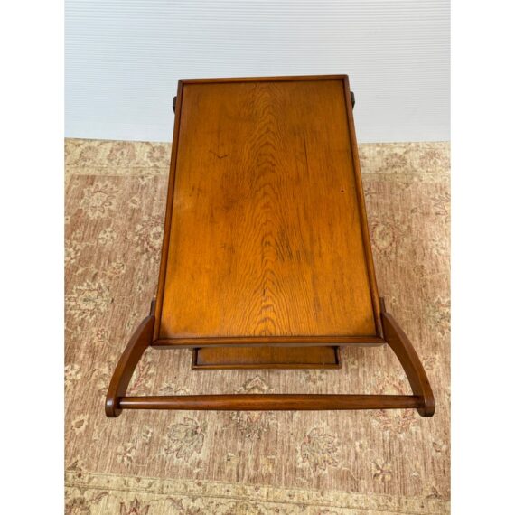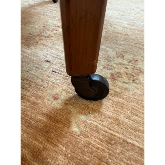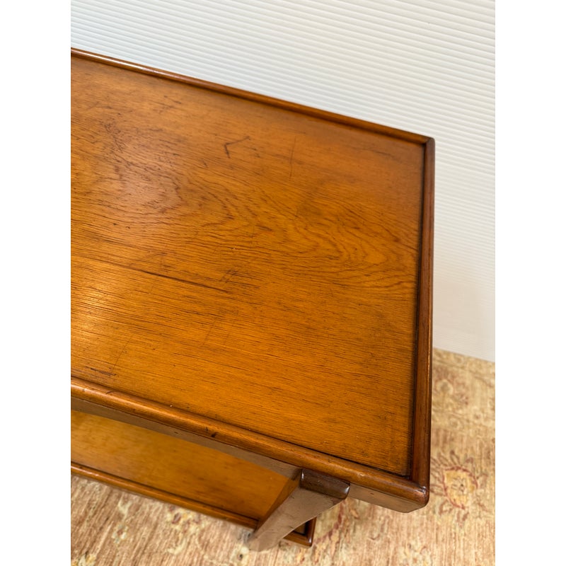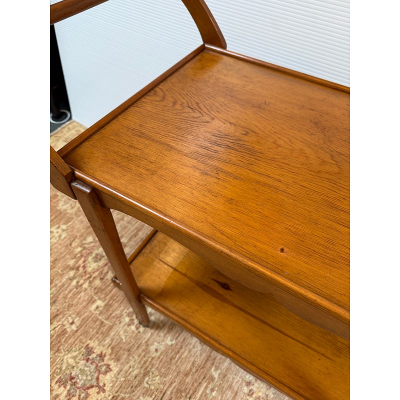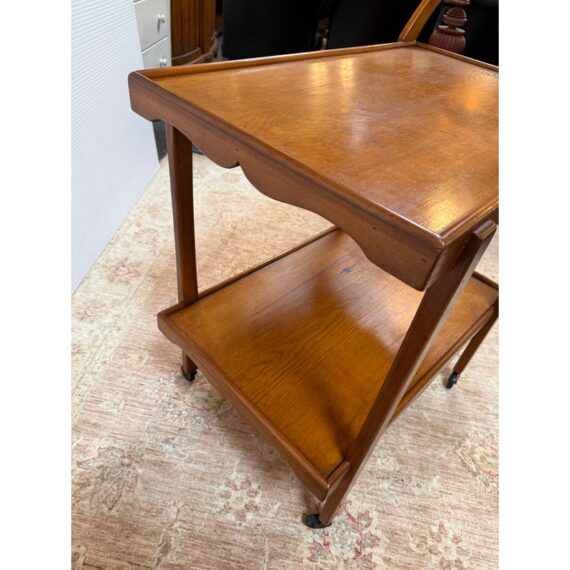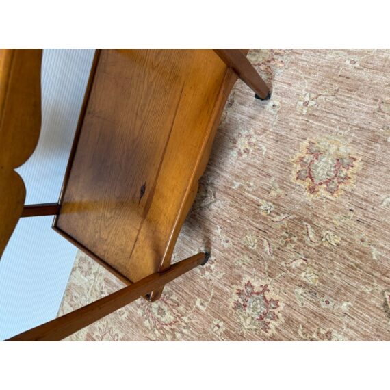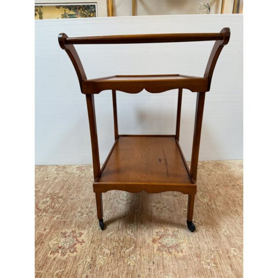 Design Plus Gallery presents an Antique Tea Cart. A sweet + functional cart that is decorated with the subtle hand carved apron to its top + bottom shelves. An elegantly curved handle and its small brass casters move the cart to exactly where needed when entertaining or relaxing. Light surface wear is consistent with age and use.