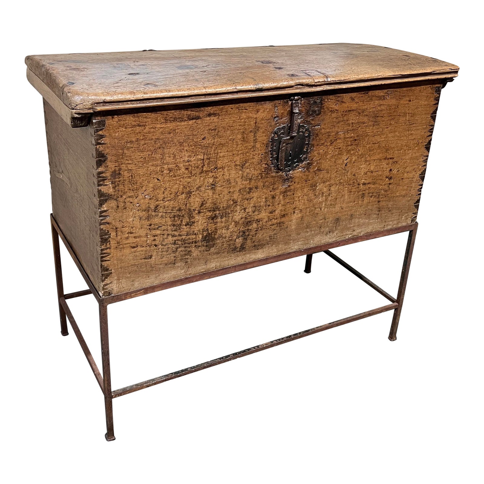 Design Plus Gallery presents an Antique Trunk + Metal Stands. The trunk is crafted from solid woods and the base is hand welded. Visible and natural distress + patina from age + usage. The hardware in iron. A small compartment on the inner left side.