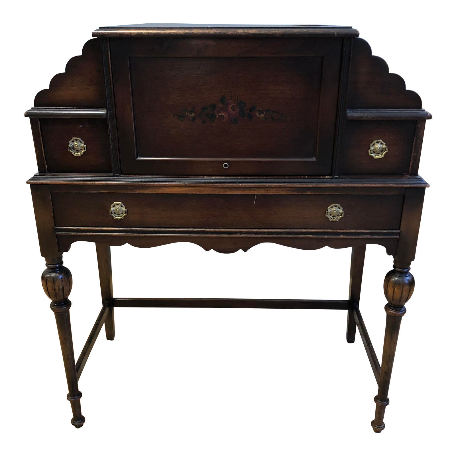 Design Plus Gallery presents an antique writing desk. Crafted of from woods, consist of drawers and multiple compartments and cubbies. The frame has a dark finish with an inner rustic red finish. Hand painted floral accent in the front. The top lift’s up with a mounted beveled edge mirror. Visible aging. Great for a writing desk and a vanity.