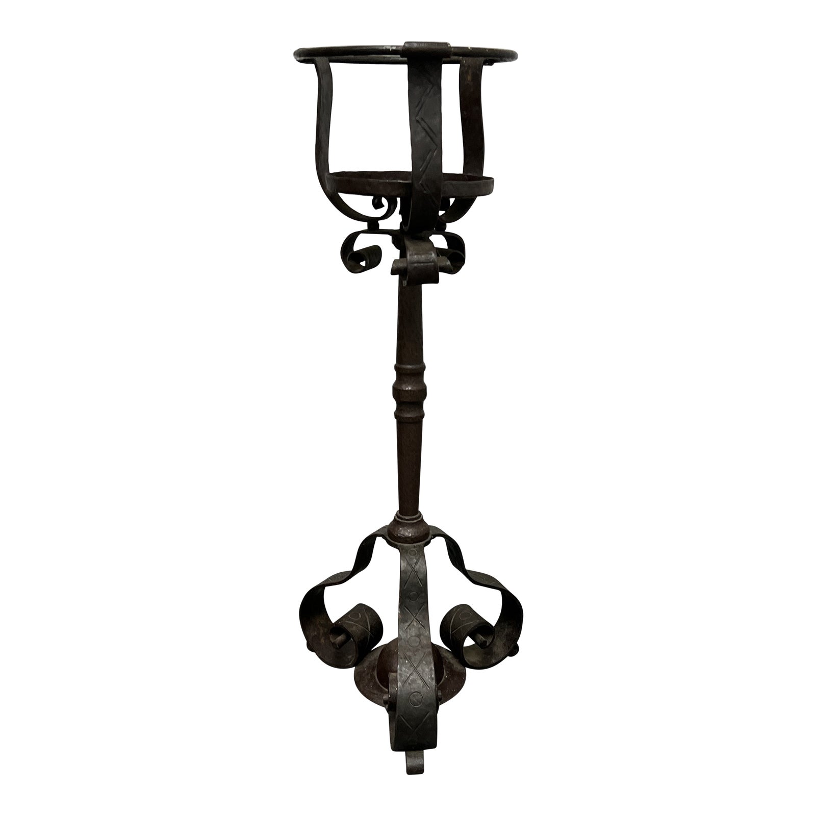 Design Plus Gallery presents a Antique Wrought Iron Candle Holder. Wrought iron is curled into an elegant silhouettes with a rustic patina. Forms are slightly hammered for a subtle reflection. There is visible wear through out, candle holder is in good condition.