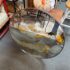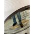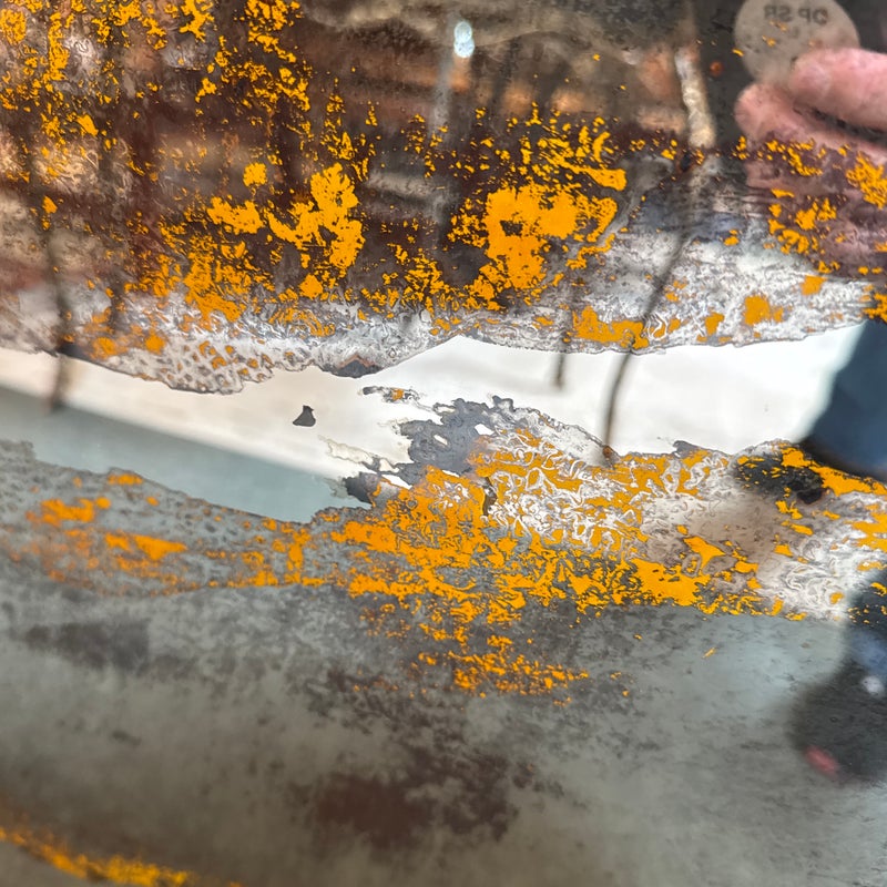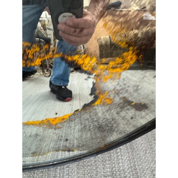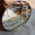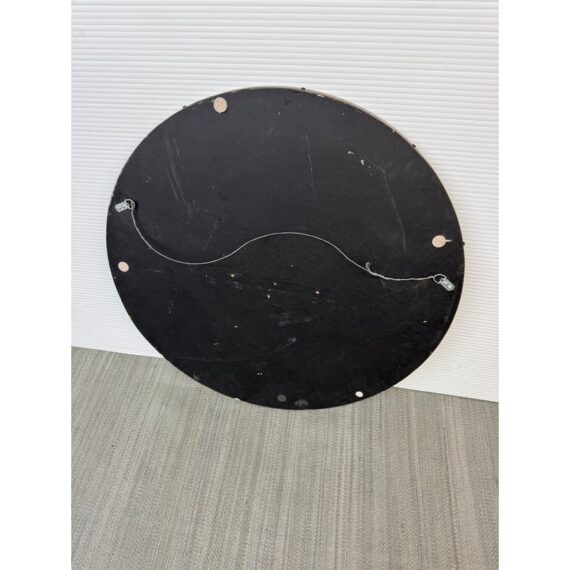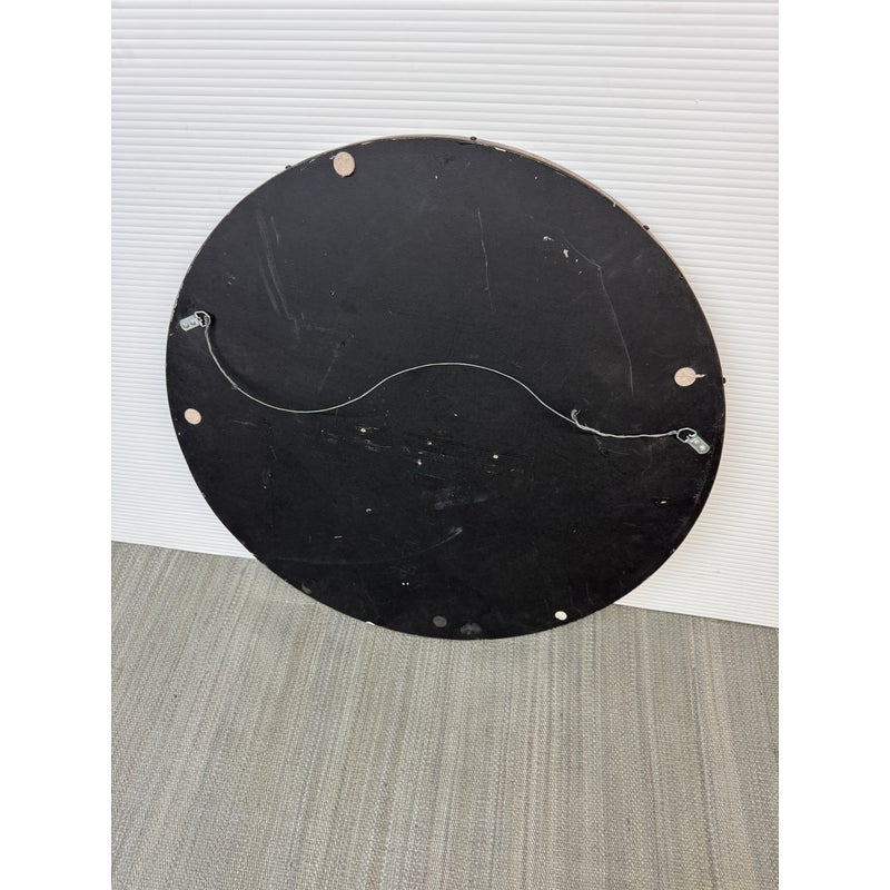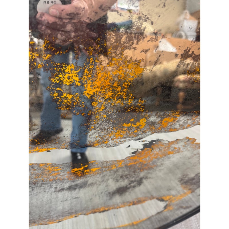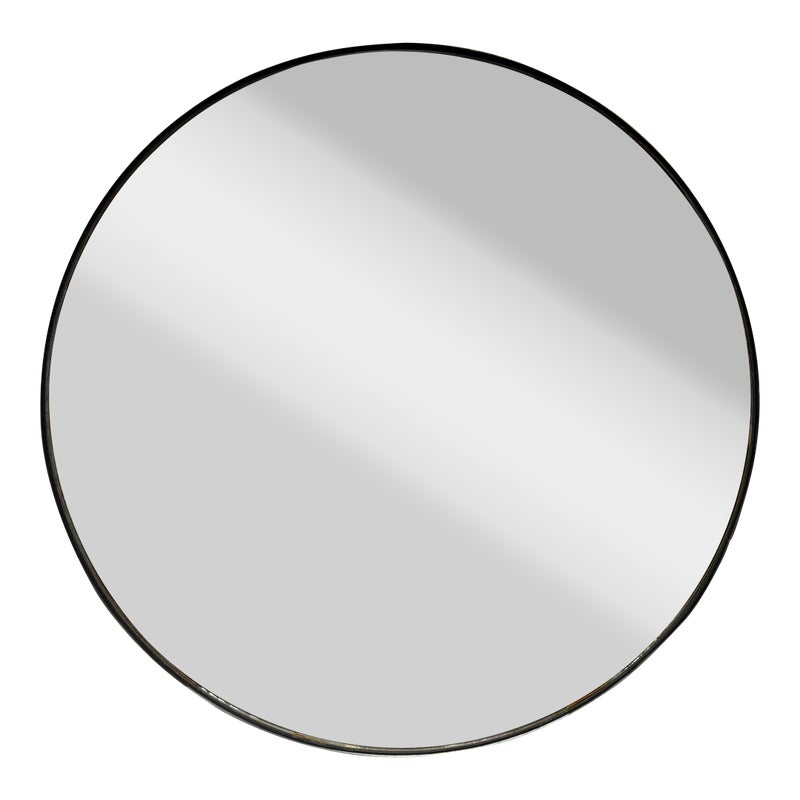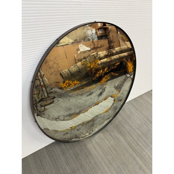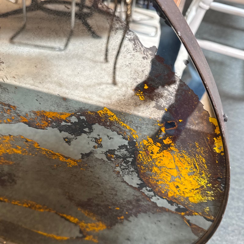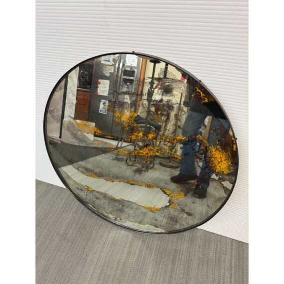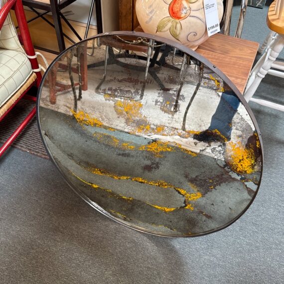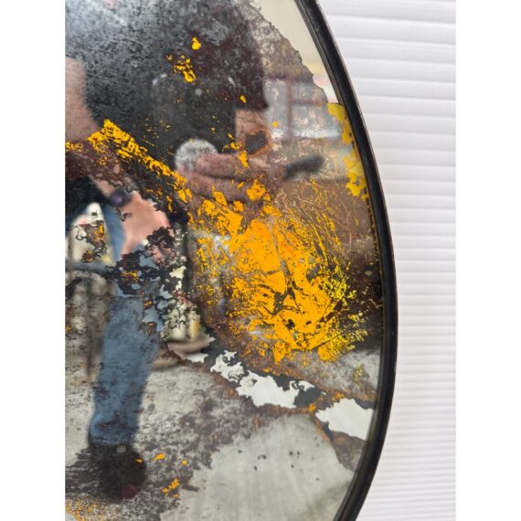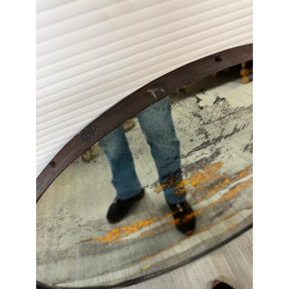 Design Plus Gallery presents a Golden Streaked Wall Mirror with Antiqued Finish The round mirror, finished to appear aged and weathered, is framed in a heavy band of iron. The aged look is with the use of gold metallic to appear as if this were mercury glass from the 18th Century. Modernized with wire on back for ease of installation. Wear shown on mirror surface and metal frame is intentional. Good condition, minimal wear.