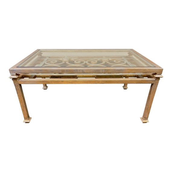 Design Plus Gallery presents an elegant glass topped metal coffee table. A unique crackled gilt finish gives the simple silhouette style. Classic swirls and details add to the glamour. Solid glass surface insert.
