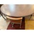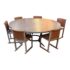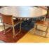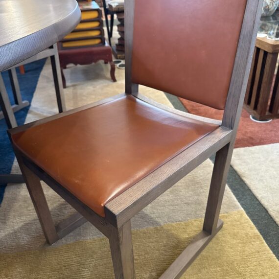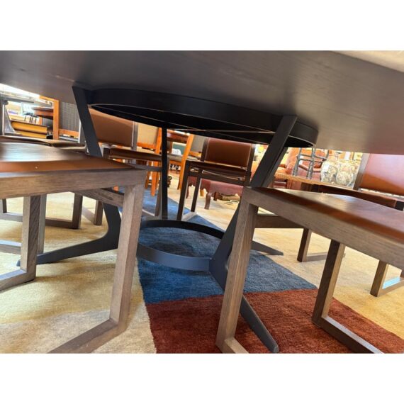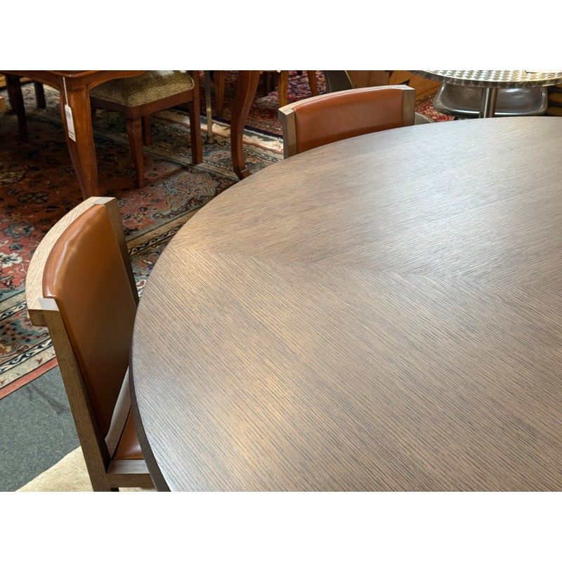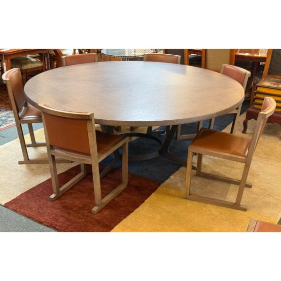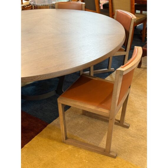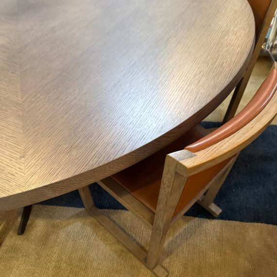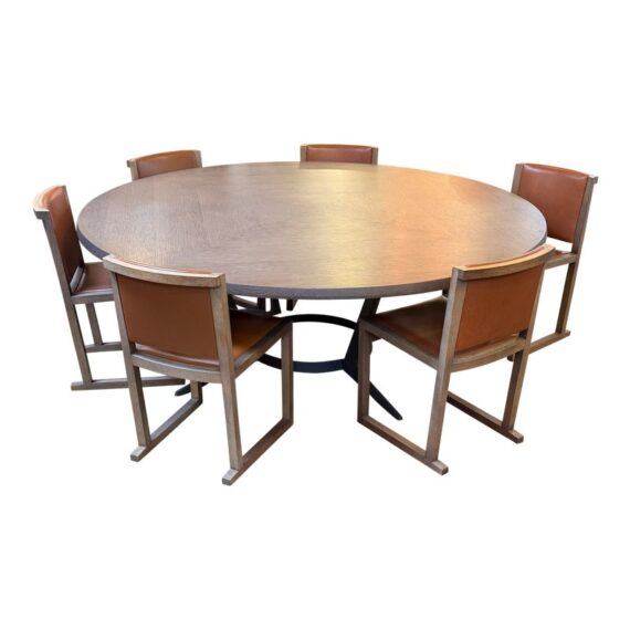 Design Plus Gallery presents the Astrum Dining Table designed by Antonio Citterio for Maxalto. Astrum is a large round table distinguished by a unique “sawhorse” base-frame made of painted die-cast aluminium support with painted finish. The triangular section of the center pedestal gives the structure both lightness and solidity. Thick solid wood and smoked veneer table top in diamond pattern has a slight bevel detail. Seats 8 easily. Made in Italy. Light surface wear, touch ups, condition is consistent with age and use. Set of 6 Musa Custom Dining Chairs by Maxalto. The Musa classic chair stands out for its solid wood frame in crisp, clean and timeless silhouette. Alfa 313 rich leather wraps the deeply cushioned seat and back. Light surface wear, two seat cushions have a scratch (shown); condition is consistent with age and use. Made in Italy.