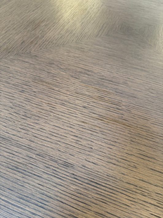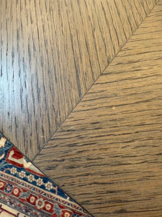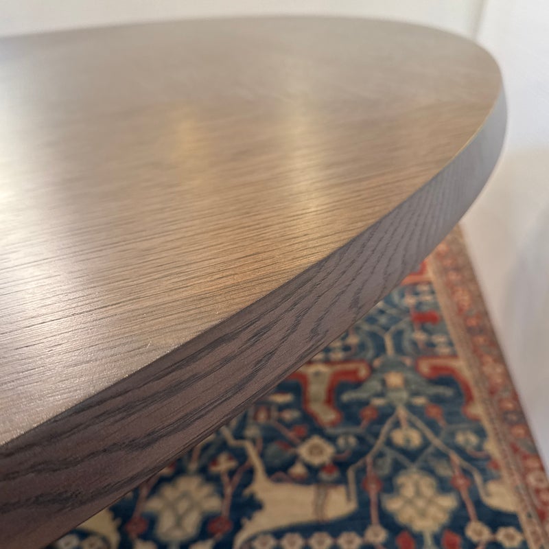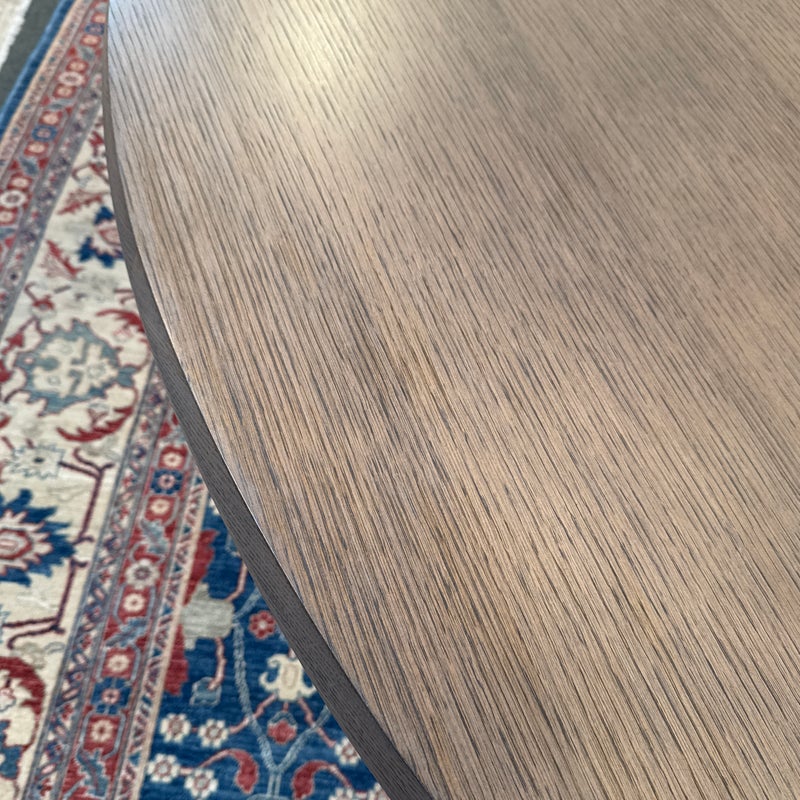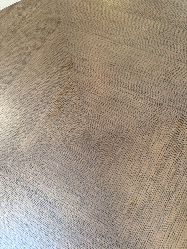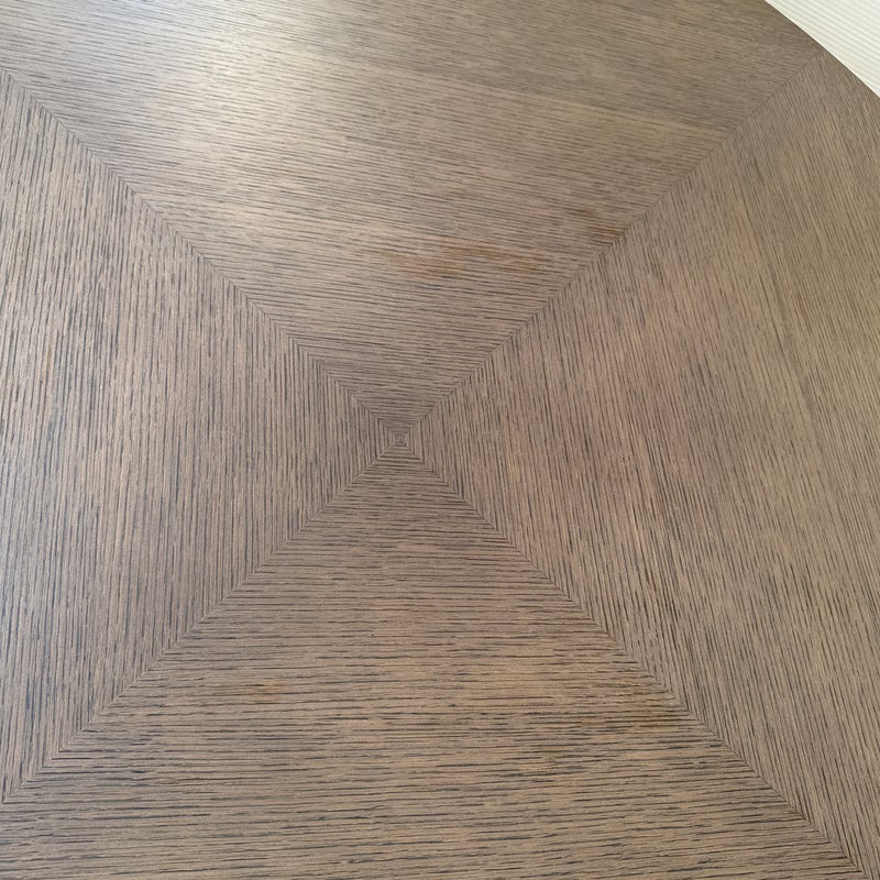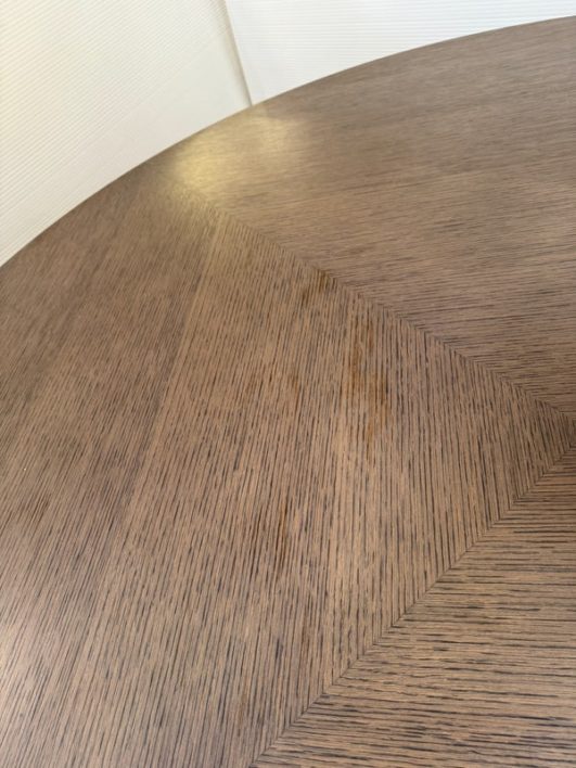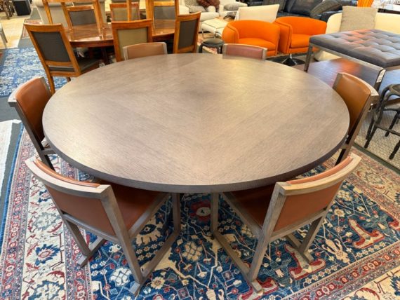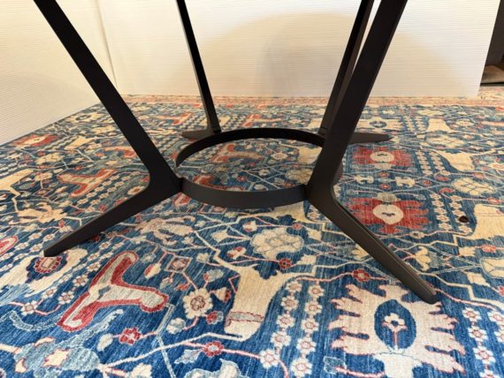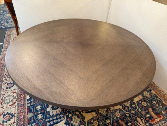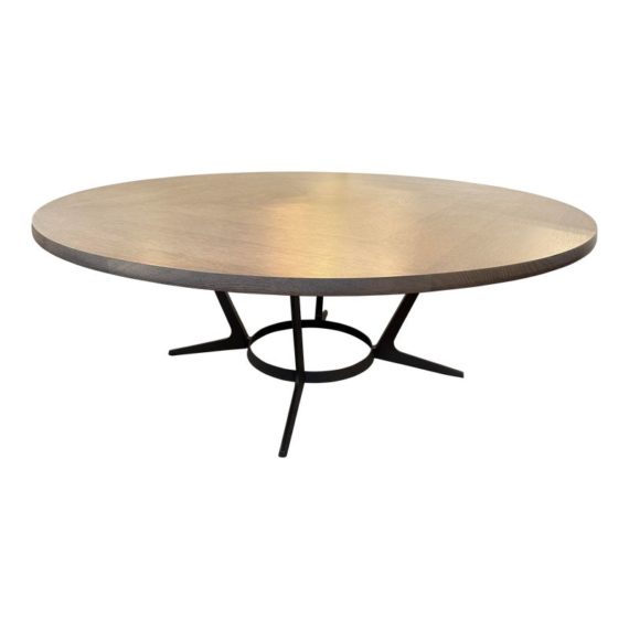 Design Plus Gallery presents the Astrum Dining Table designed by Antonio Citterio for Maxalto. Astrum is a large round table distinguished by a unique “sawhorse” base-frame made of painted die-cast aluminium support with painted finish. The triangular section of the center pedestal gives the structure both lightness and solidity. Thick solid wood and smoked veneer table top in diamond pattern has a slight bevel detail. Seats 8 easily. Made in Italy. Light surface wear, touch ups, condition is consistent with age and use.