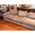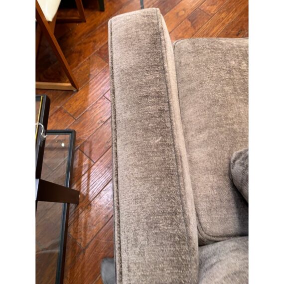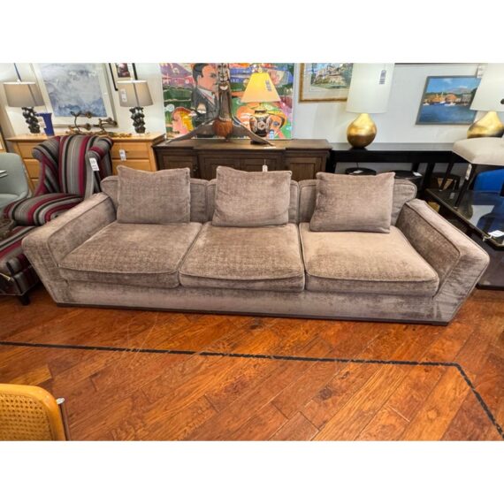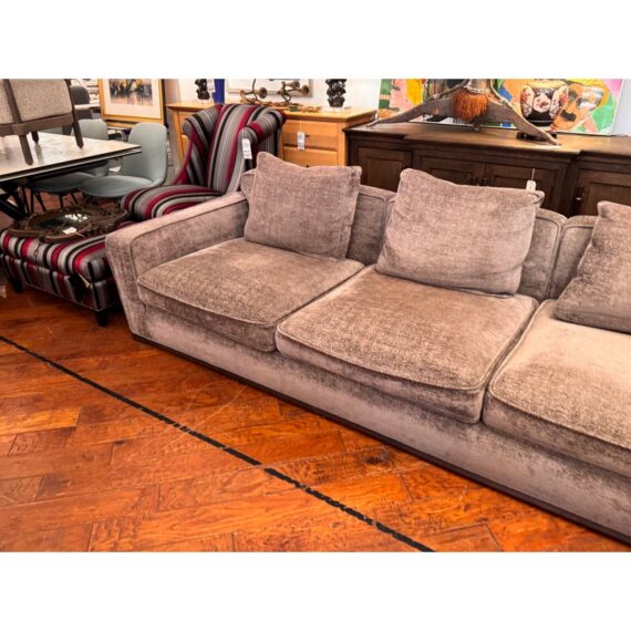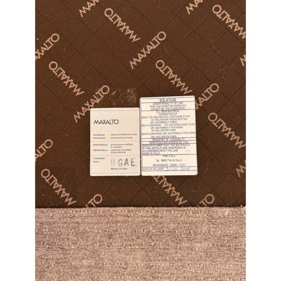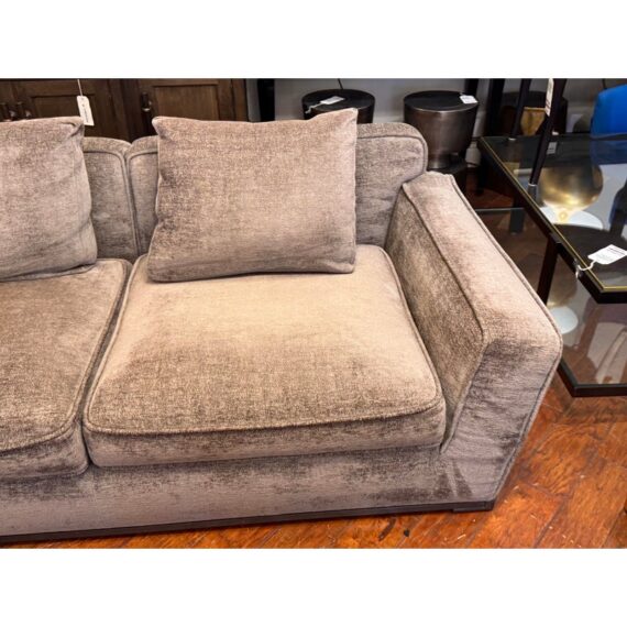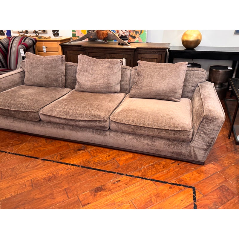 Design Plus Gallery presents the Solatium sofa by Antonio Citterio for Maxalto + B & B Italia. Upholstered in a brown sheen slipcover, this tailored three-seat design offers three loose back cushions and three loose seat cushions with structured lines and generous proportions. A low metal plinth base in a bronze tone adds a sleek foundation and emphasizes the sofa’s streamlined silhouette. This is a discontinued model with the brand. It is in good structural condition and would benefit with a professional cleaning due to evidence of fur. Visible and minimal wear from usage. Made in Italy.