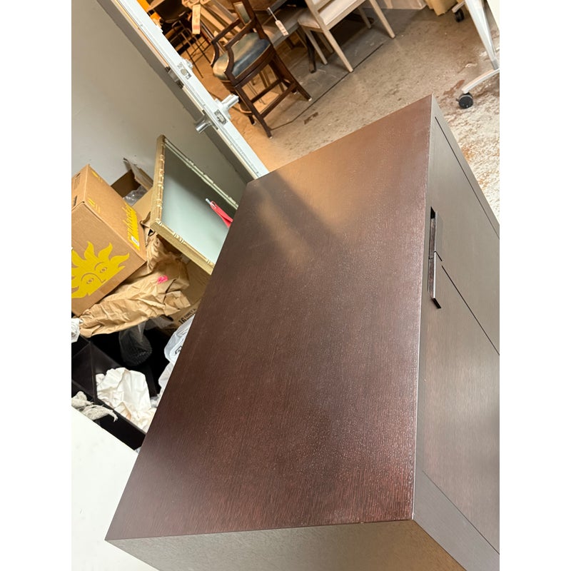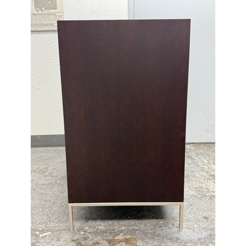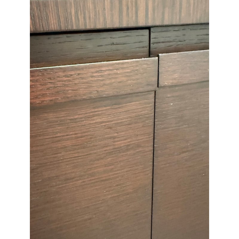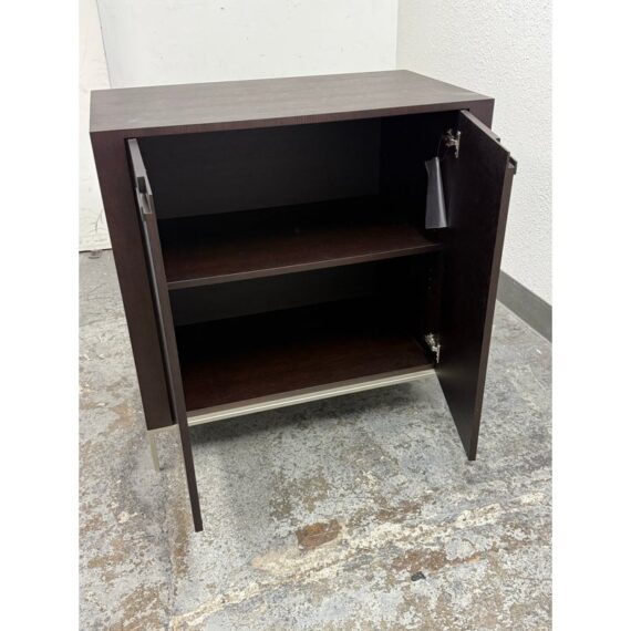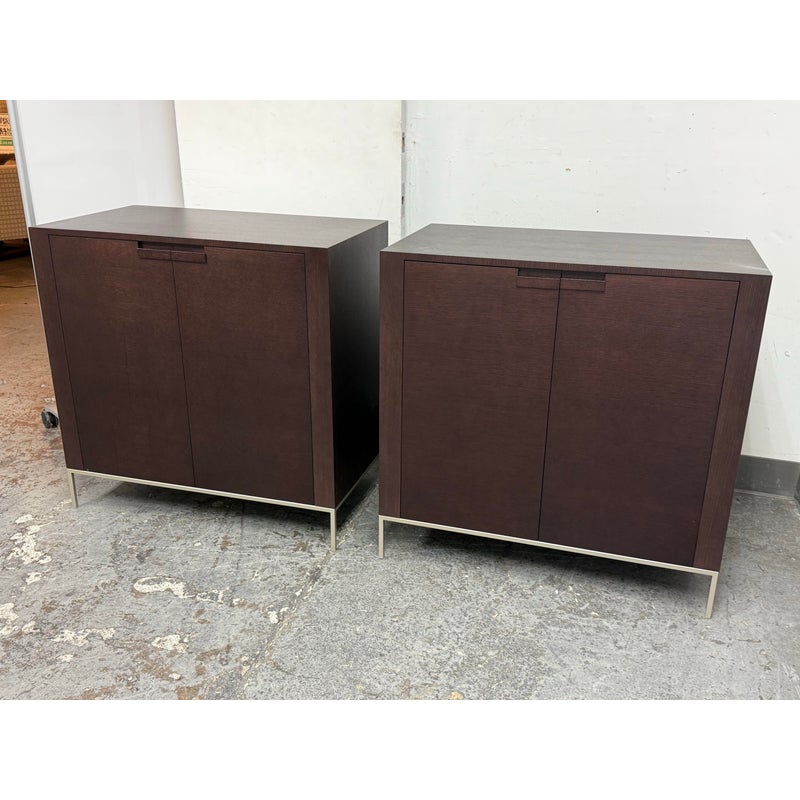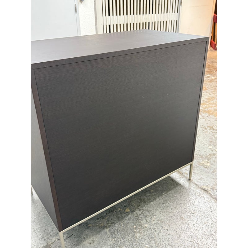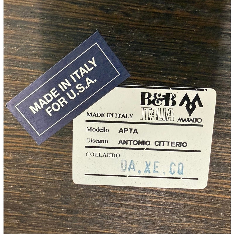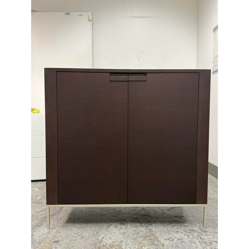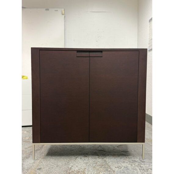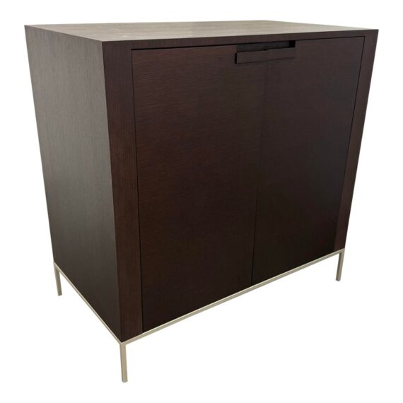 Design Plus Gallery presents an Apta Titanes Storage Cabinet from as Designed by Antonio Citterio of Maxalto for B&B Italia. The cabinet is offers a refined wenge wood finish of brown with subtle hints of purple and black. The cabinet presents a clean, rectilinear volume with two flush doors that open to reveal a single, full-width shelf—ideal for discreet, organized storage. Elevated on a slender steel base with four thin legs, it achieves a light, architectural stance that balances solidity and airiness. This is a discontinued model from the brand. In good condition, visible and minimal wear from usage. Made in Italy.