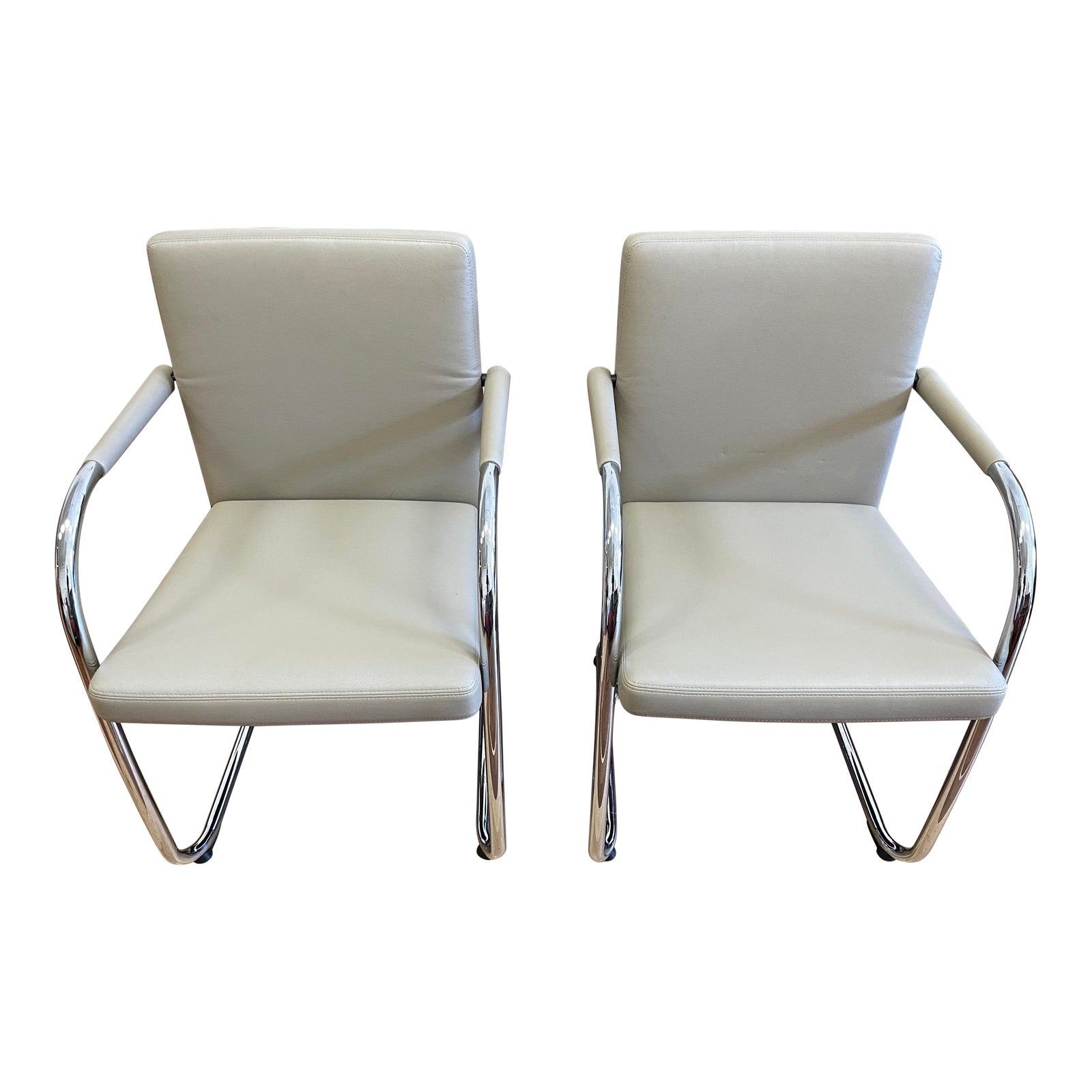 Design Plus Gallery presents a Pair of Antonio Citterio & Glen Oliver Löw for Vitra Arm Chairs. In the iconic style of Mies van der Rohe, the cantilevered frame adds a floating elegance. Leather is a putty tone and adds a soft neutral to any space with the sleek polished metal base. Visible wear through out, pair is in good condition. Produced in 2009.