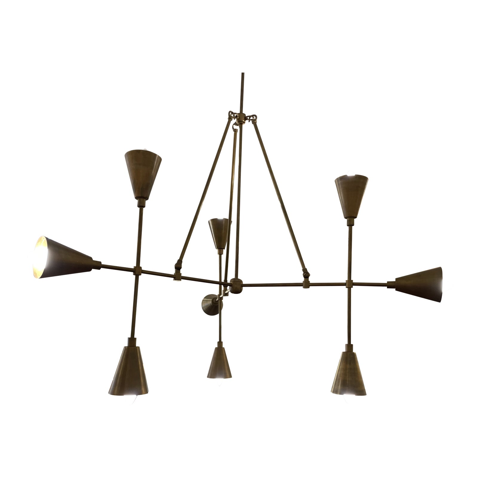 Design Plus Gallery presents a Custom Hand Finished Brass + Aged Brass Suspended Pendent by Apparatus. This Triad 9 pendant has a mix of materials which add to the warmth and richness of this piece. The canopy and stems are in brass while the joints and cones are in an aged brass finish. Cones emit a delicate glow. Finished and assembled by hand in NY from domestic and imported components. Drawing on trigonometric principles, this fixture is a study in repeating triangular and conical shapes.
