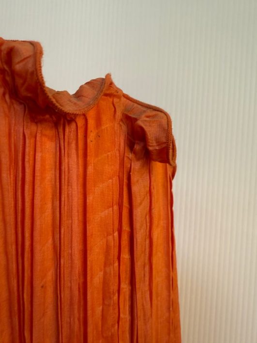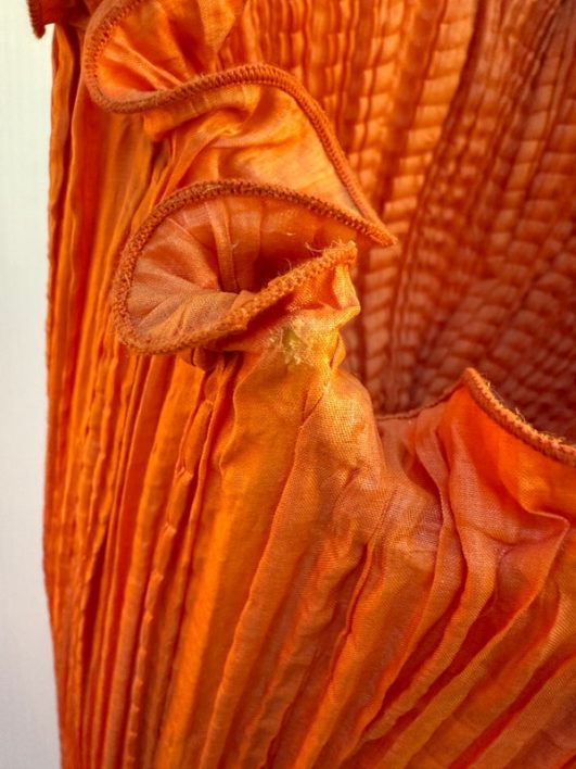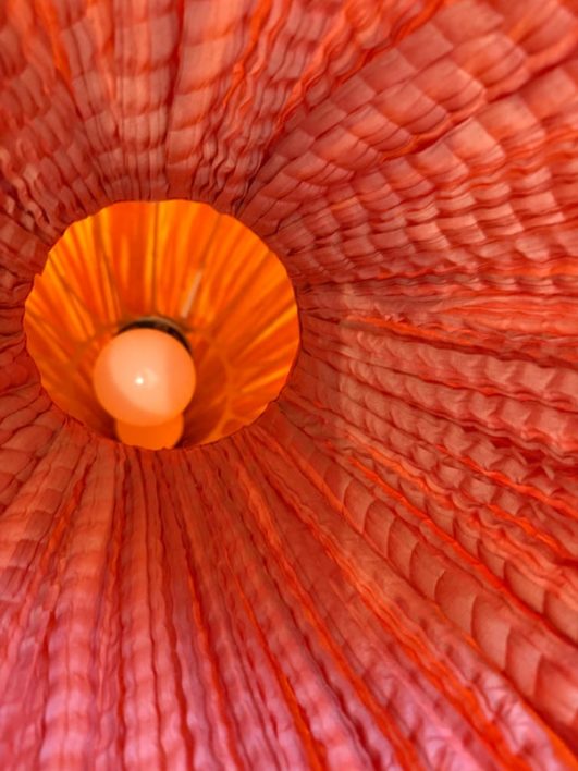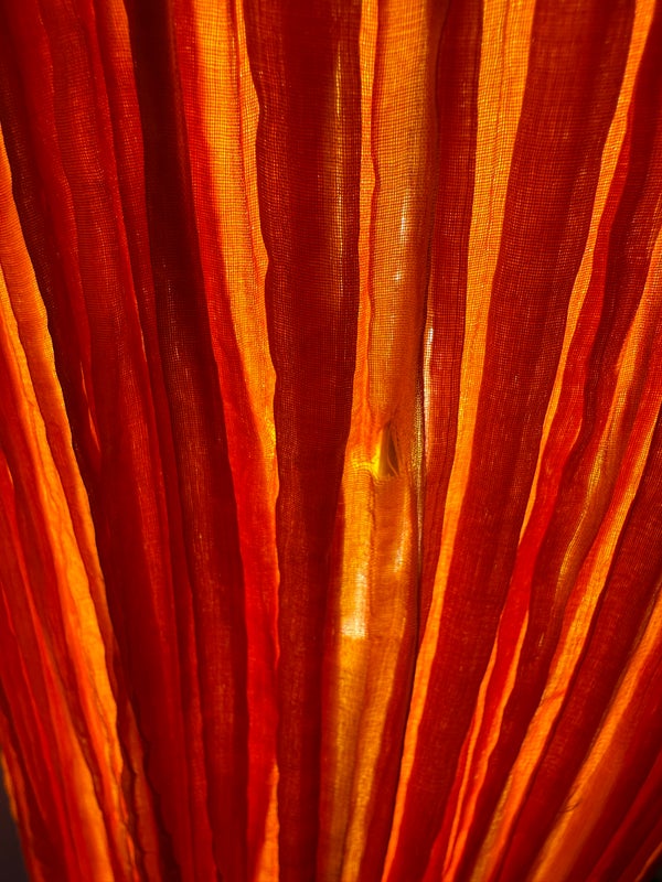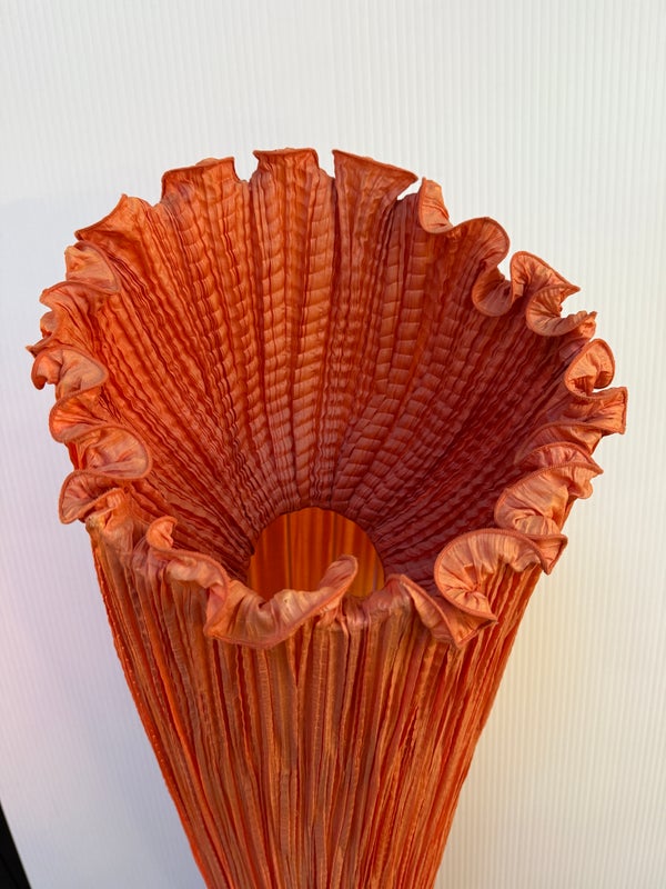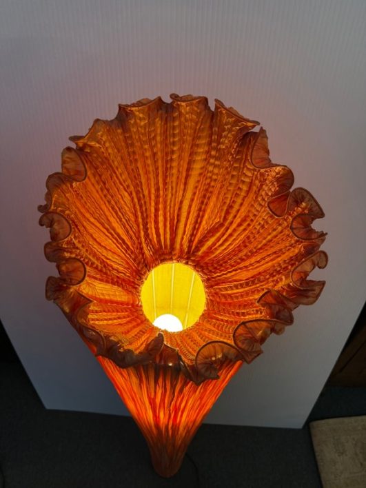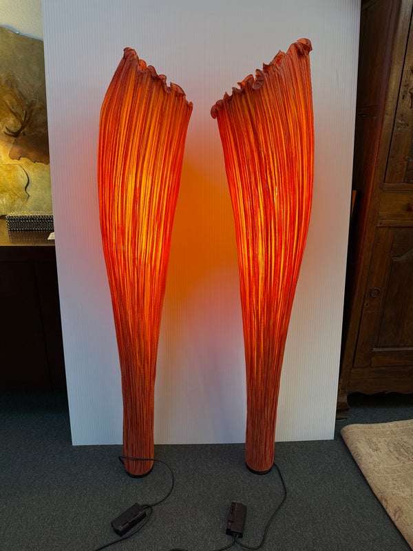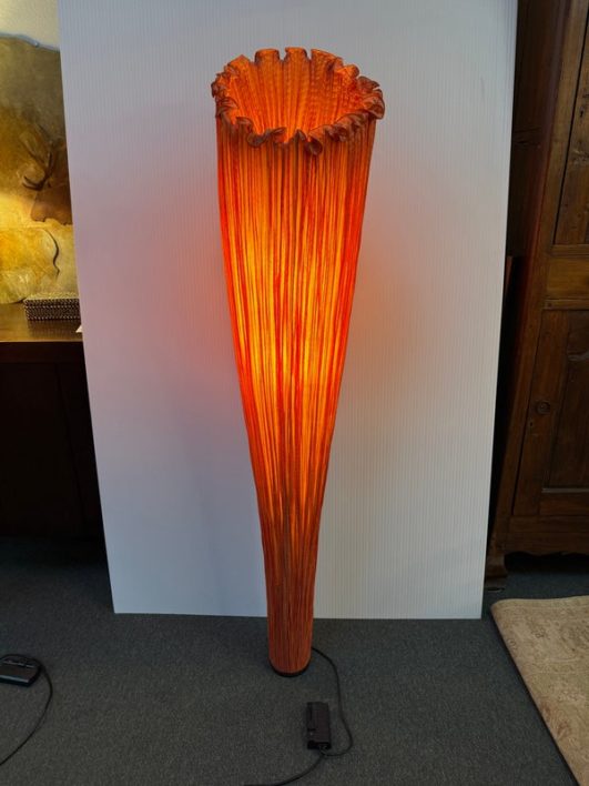 Design Plus Gallery presents a Horn Floor Lamp by Aqua Creations Luminary Design Studio. Featuring a hand-crafted silk fabric and metal frame, exquisite craftsmanship produces a stunning statement in any room. Sot pleated silk ascends to finish in a rippled bloom opening. Soft glowing ambient light creates a unique atmosphere. Small 1/4″ tears in several places; condition is good for age and use.