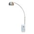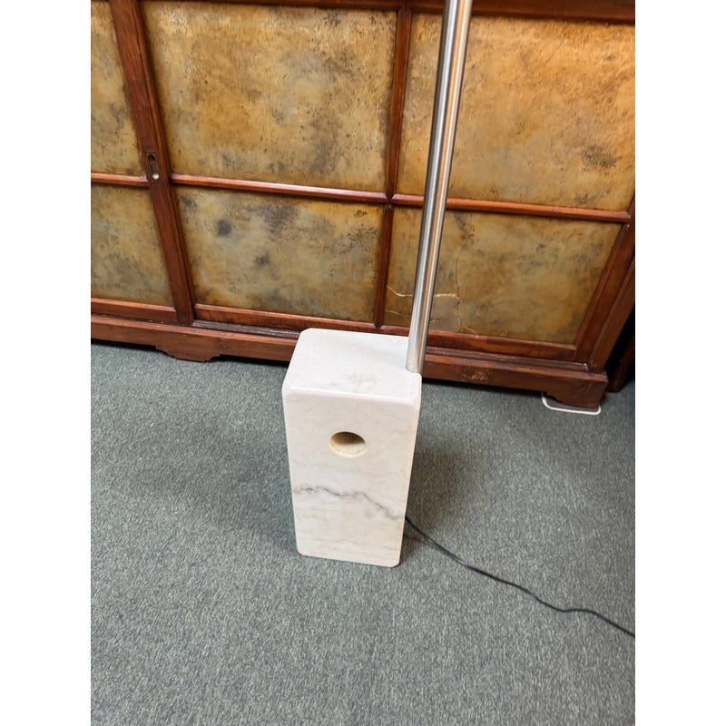 Design Plus Gallery presents an Italian Designed Arching Floor Lamp. The lamp was inspired the Flos Arco that was inspired by a streetlight that brothers Achille and Pier Castiglioni created called the Arco Floor Lamp (1962). This floor light provides overhead lighting with requiring ceiling suspension. It has a polished shade on a swiveling arm for precise lighting control. It is balanced on a solid plinth shaped marble base. It has a foot pedal to press for on/off. It is in good overall condition with visible wear to the medal.