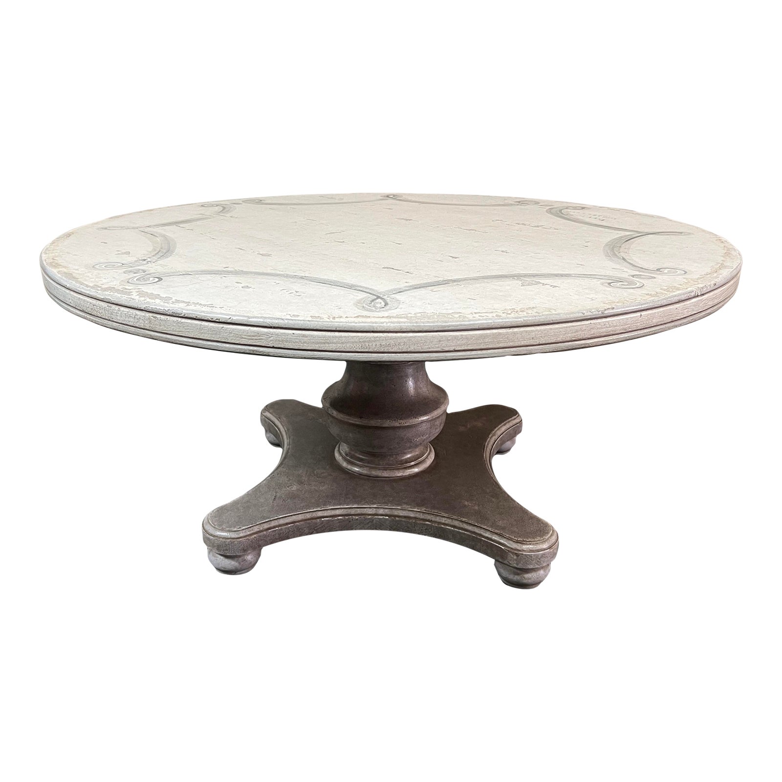 Design Plus Gallery presents an Antonia Belle Arte Coffee Table by Arhaus. Italian craftsman-built and made-to-order from solid populus tremula tulip wood, the lovely round table has been meticulously carved, white-washed and painted by hand. A subtle focal point in a seating arrangement, the artist-signed coffee table brings old world charm to your space. Light evidence of wear, overall good condition.