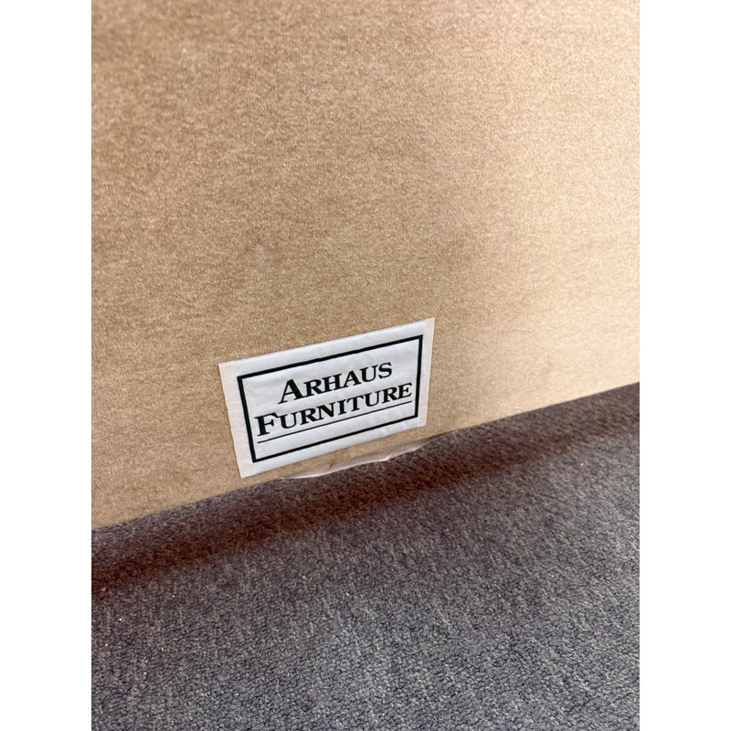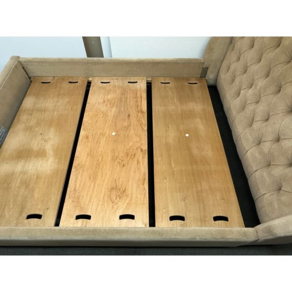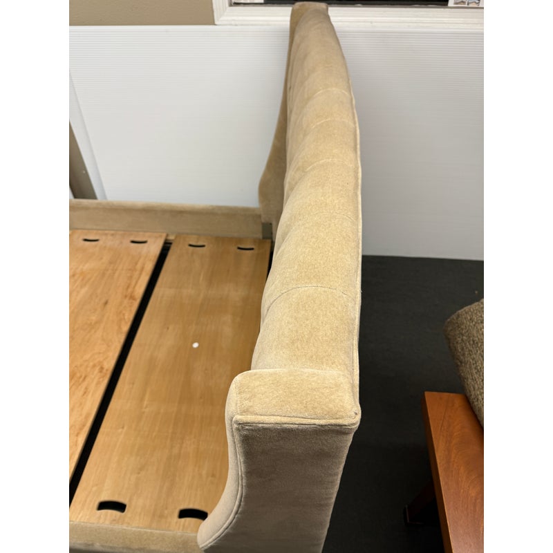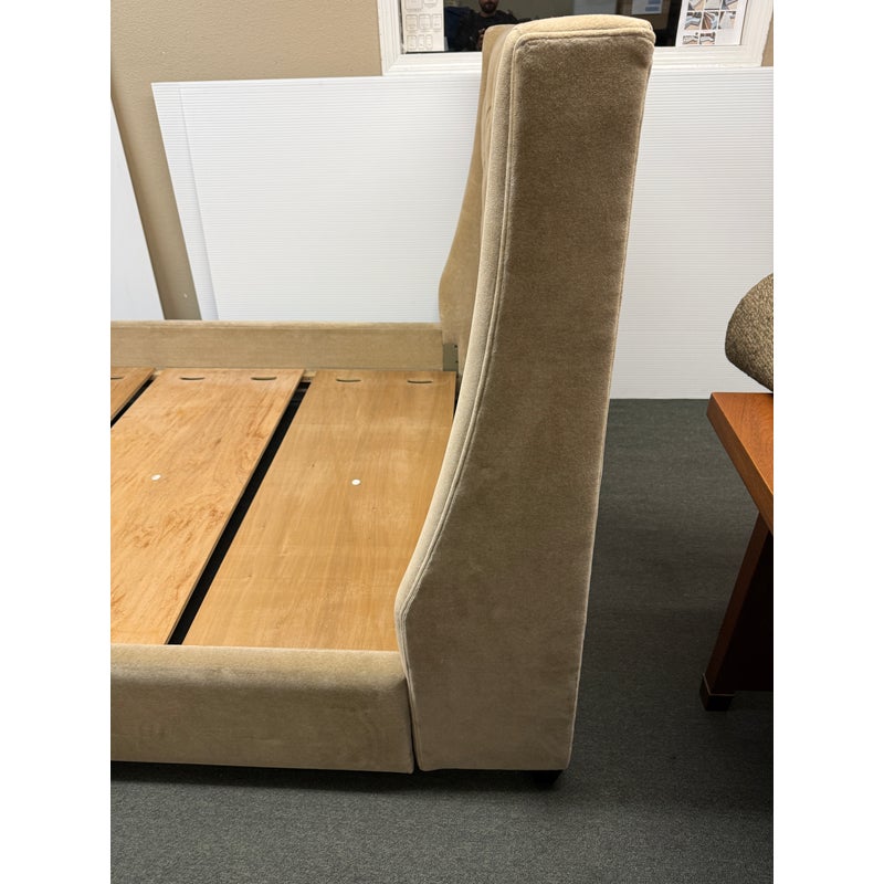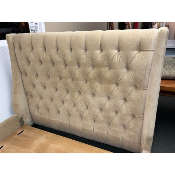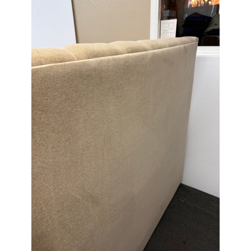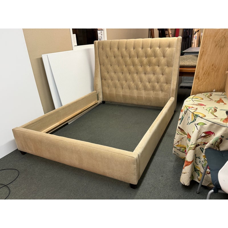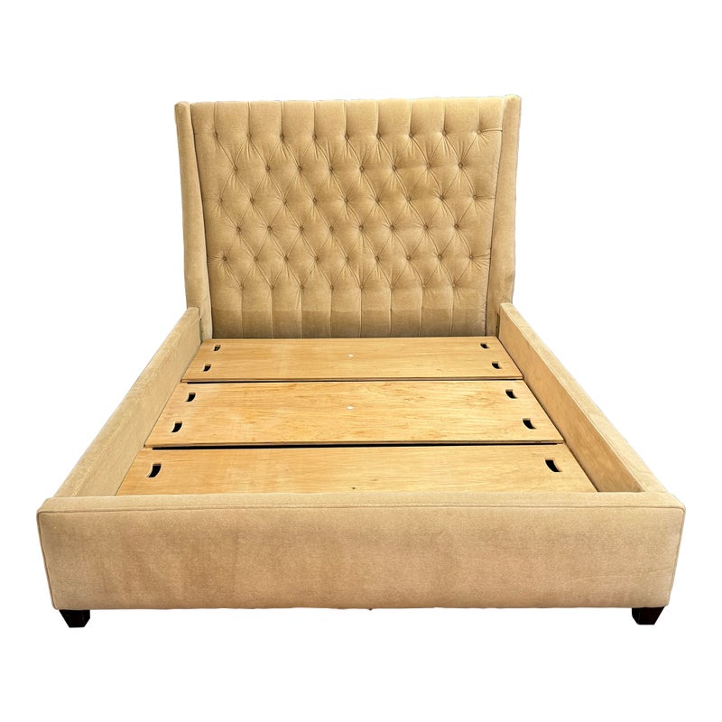Design Plus Gallery presents a Queen Size Tufted Bed Frame Arhaus. From the Camden collection, upholstered in a subtle goldenrod velvet yellow. In good condition, visible and minimal wear from usage.