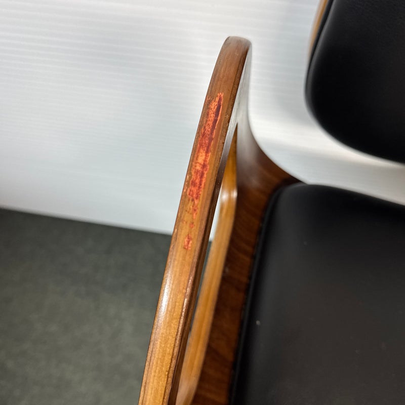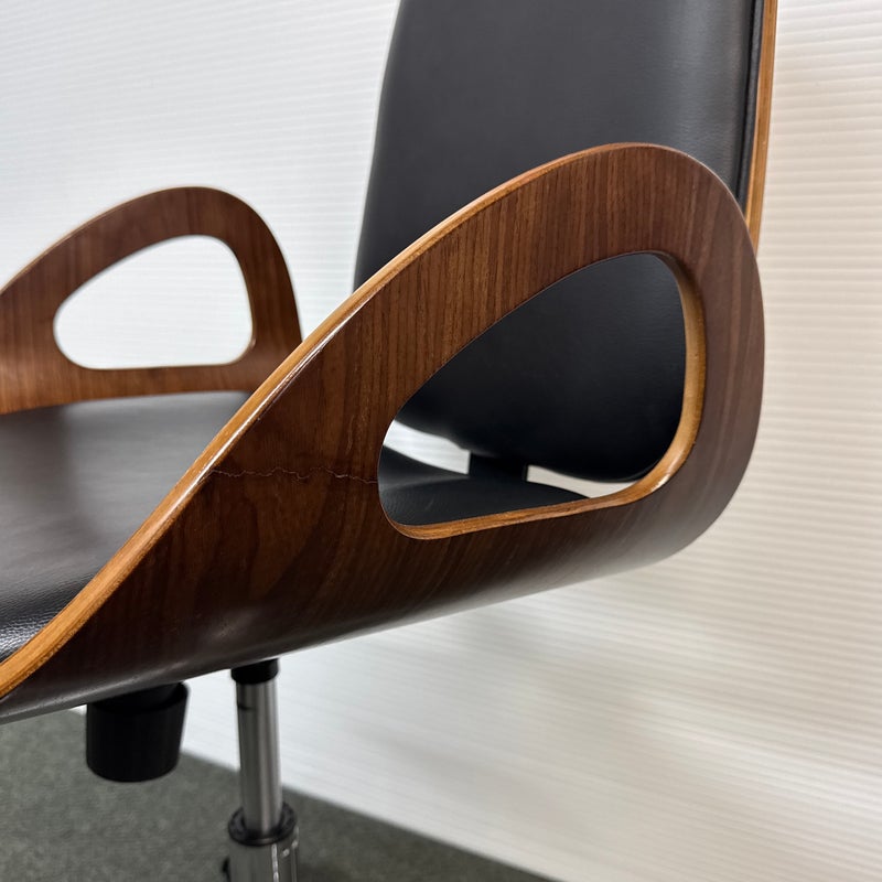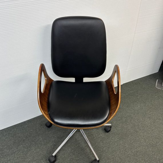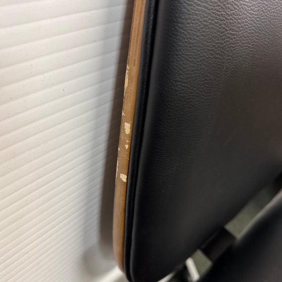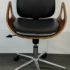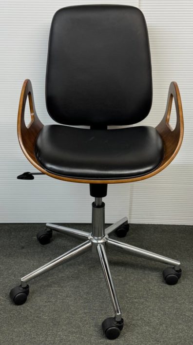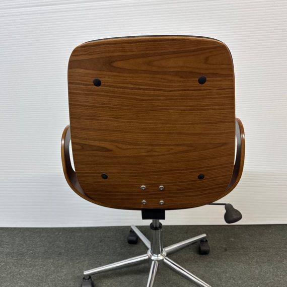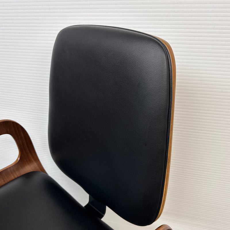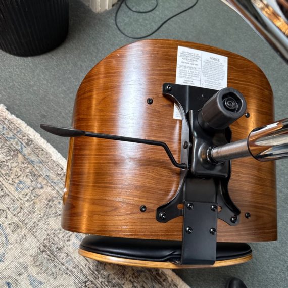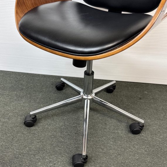 Design Plus Gallery presents a Wallace Mid-Century Office Chair by Armen Living. Beautifully black faux leather upholstered chair fit for the modern contemporary home or commercial office. The Wallace’s curved, cushioned seat allows for a level of comfort that is further accented by the chair’s plush back. The chrome base and wheels are durable and allow for a great deal of mobility while the gas lift mechanism allows for height adjustment. The Eames inspired design couple with the accented walnut back and chrome finish. In good condition, visible and minimal wear from usage + age.