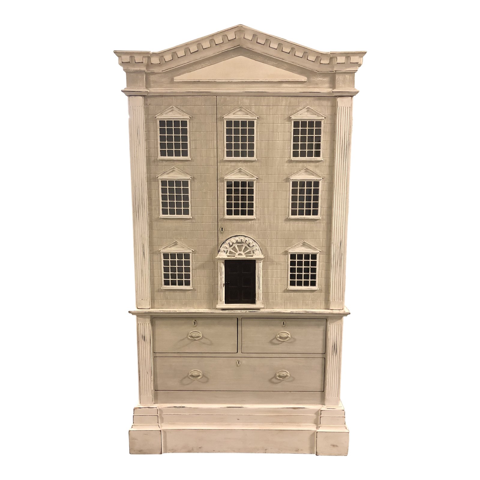 Finished by hand using an intensive, multistep finishing process that achieves the authentic texture of time with gently worn edges. Cabinet doors open with a faux key to reveal 2 adjustable shelves, set above 3 English-dovetailed drawers with dust panels and wood-on-wood glides; drawer glides should be waxed periodically to ensure smooth operation. Functional front door is fitted with a small knob. Vintage-inspired hardware and faux keyhole details have a distressed finish for the patina of age. The finish is Brushed Taupe. Everyone loves the miniature sizing and fascinating detail of a dollhouse.