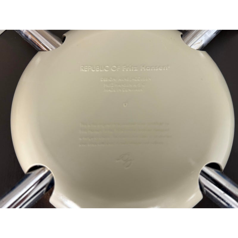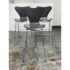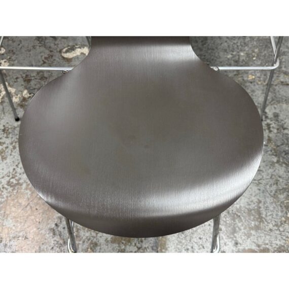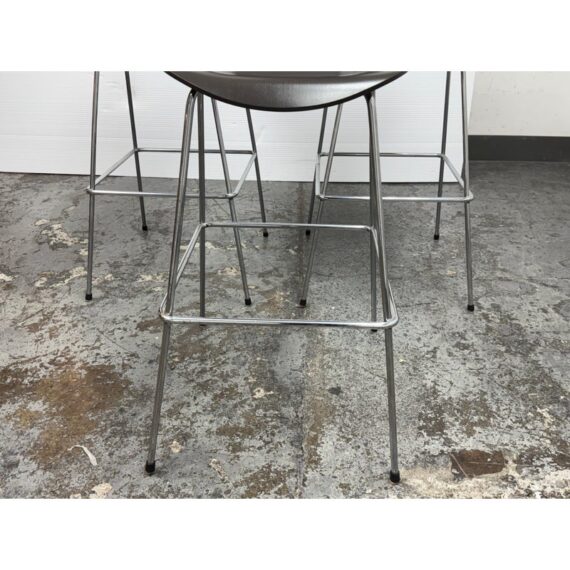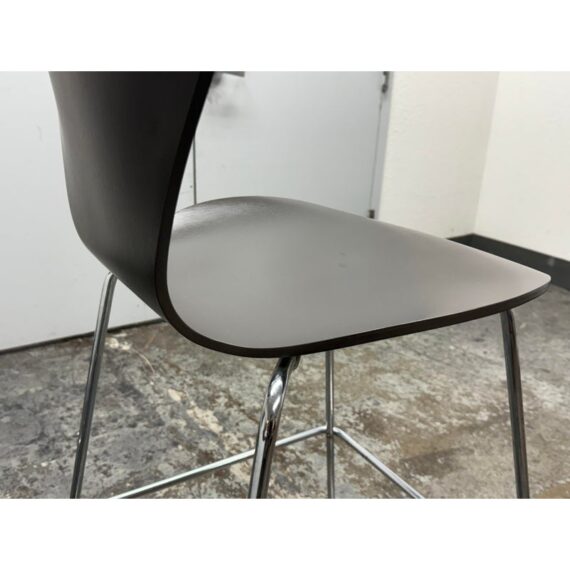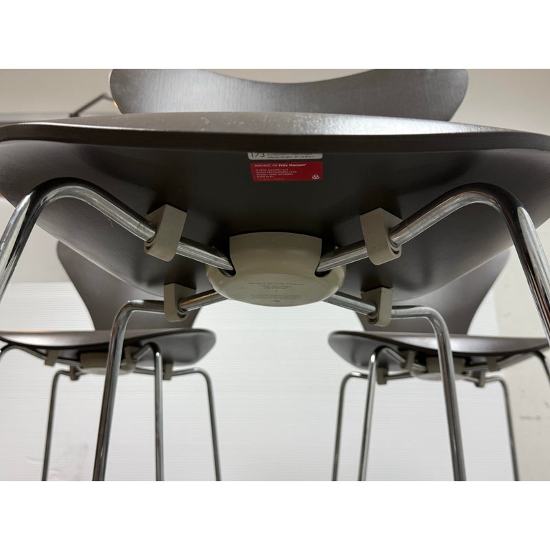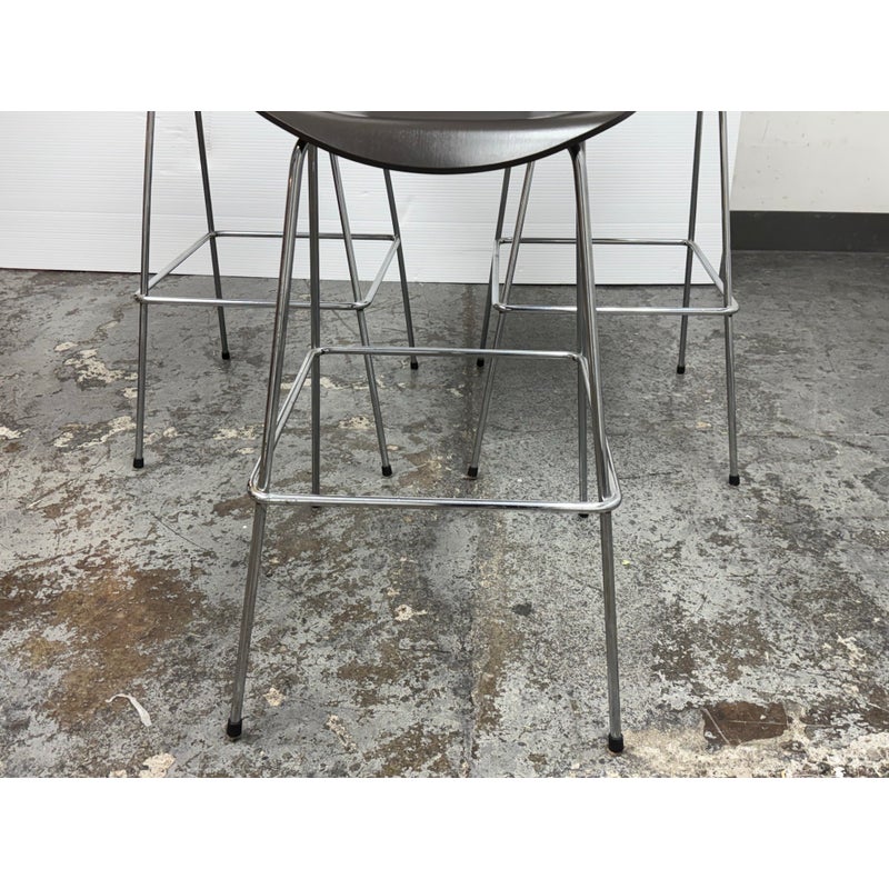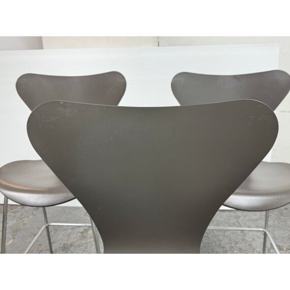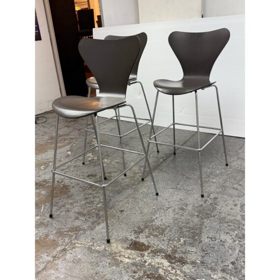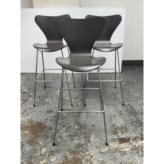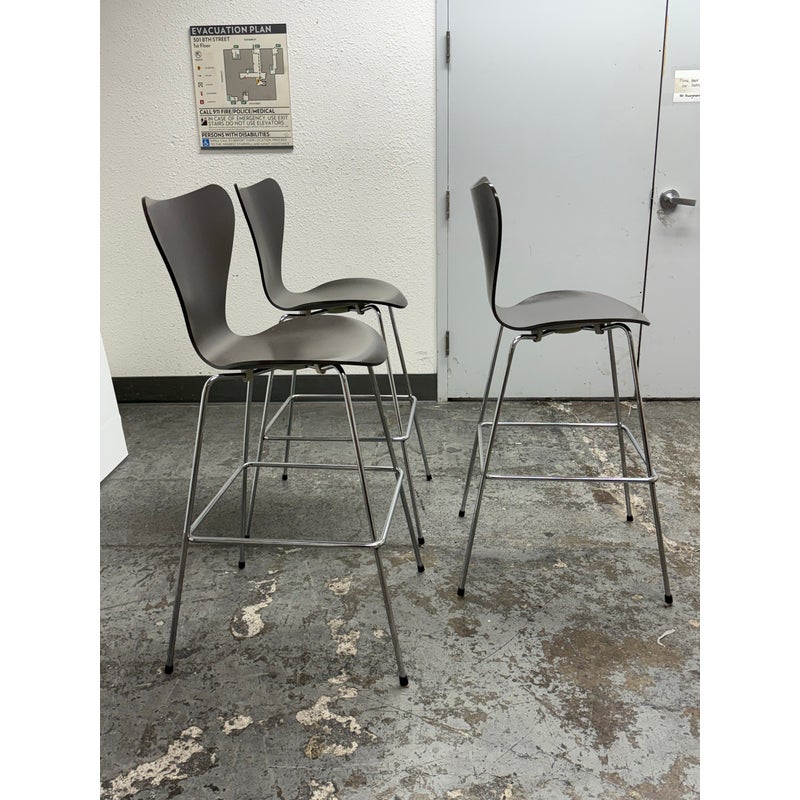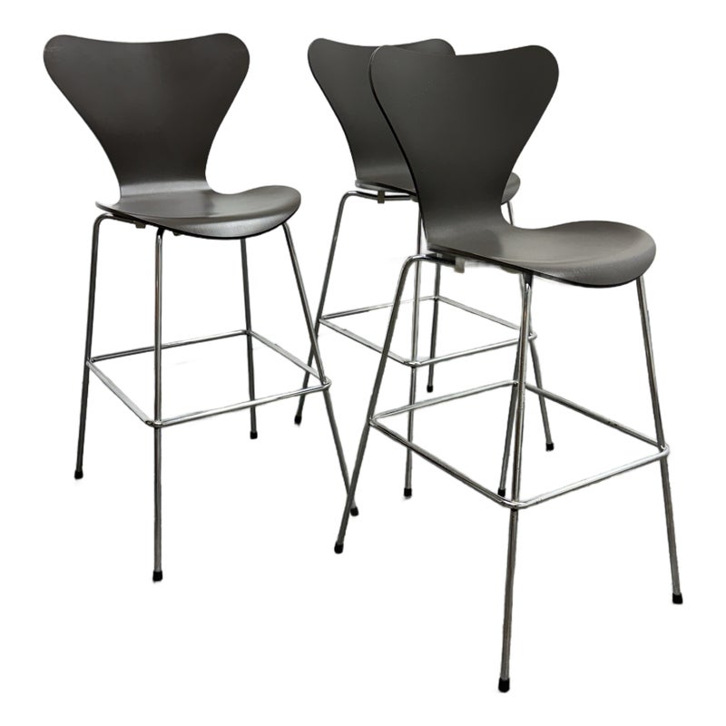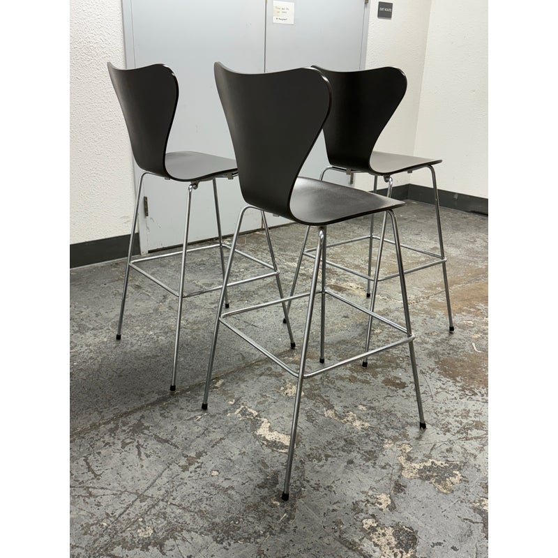 Design Plus Gallery presents a Set of Three Series 7 Barstools from the Republic of Fritz Hansen. Designed by Arne Jacobsen. An icon of modern furniture since 1955, the Series 7 is celebrated for its sculptural silhouette and extraordinary comfort. This 3197 barstool variant honors the original design with a slender yet resilient Dark Gray finish shell made from nine layers of pressure-moulded veneer, paired with a streamlined chrome base. The 3197’s extended legs integrate a four‑sided tubular steel footrest, preserving the chair’s clean, harmonious lines while offering stable, all-around support. Launched in 2005 for the Series 7’s 50th anniversary, this bar-height interpretation is equally at home in contemporary kitchens, dining bars, and hospitality settings. In good condition, visible and minimal wear from usage. Made in EU.