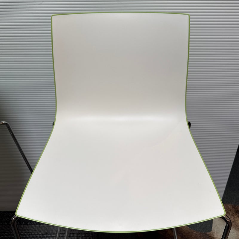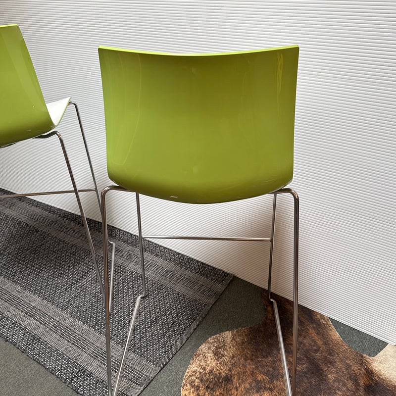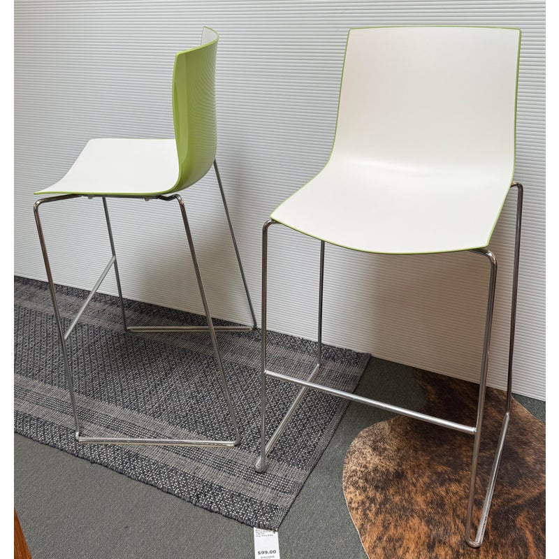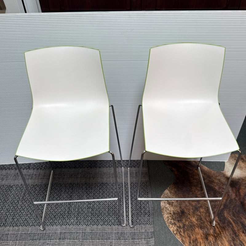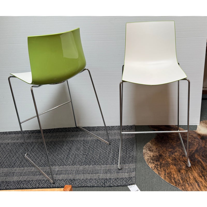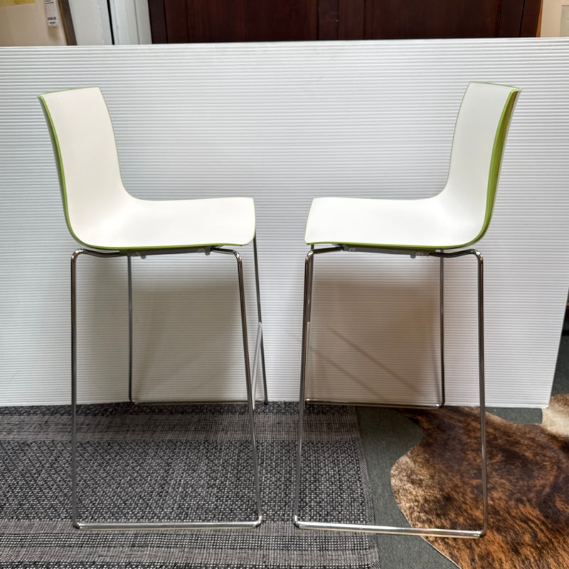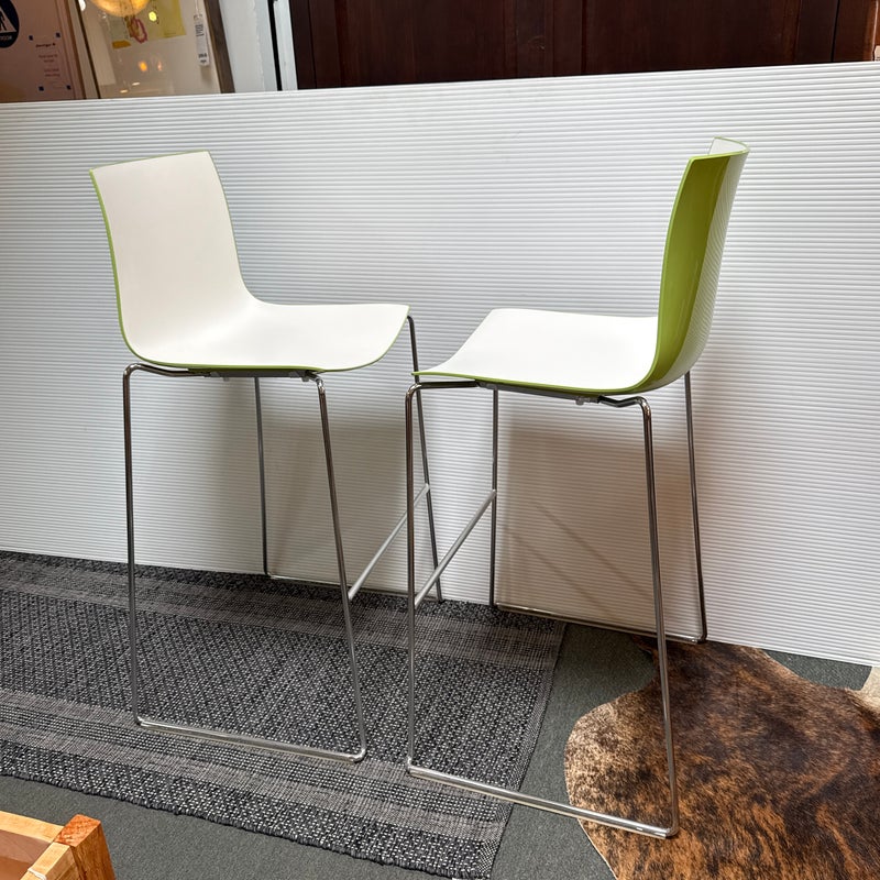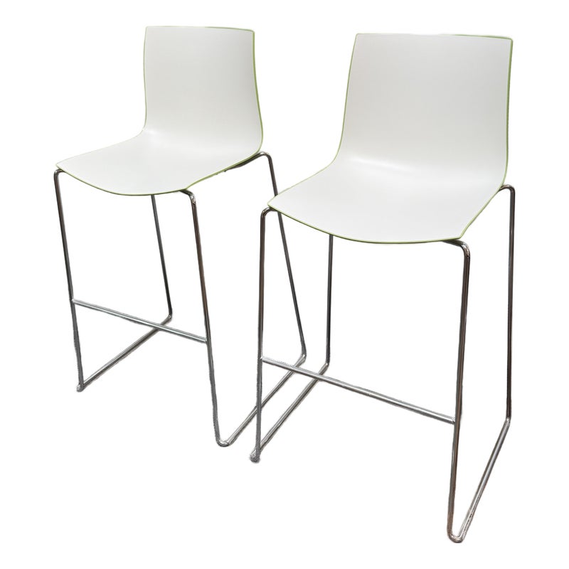 Design Plus Gallery presents a Pair of Catifa 46 Bar Stools Designed by Lievore Altherr Molina for Arper. The stools offer a sleek profile with a crisp, casual efficiency that is designed for contract use and spaces that require a slightly smaller scale. This set of stools offer a white finish with a Lime underside and back for visual interest and straight up fun! They have steel bases in chrome finish in a sled style, making them great on hard floors or with rug alike. They are both in good condition for their usage with minimal visible wear. Made in Italy.