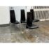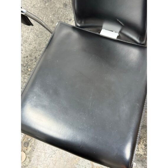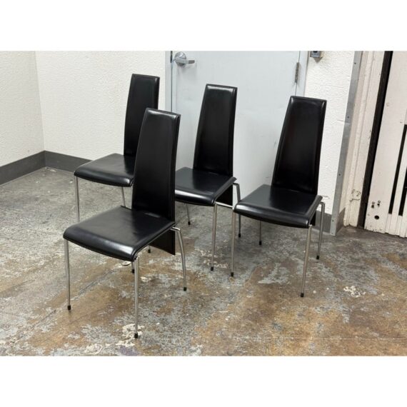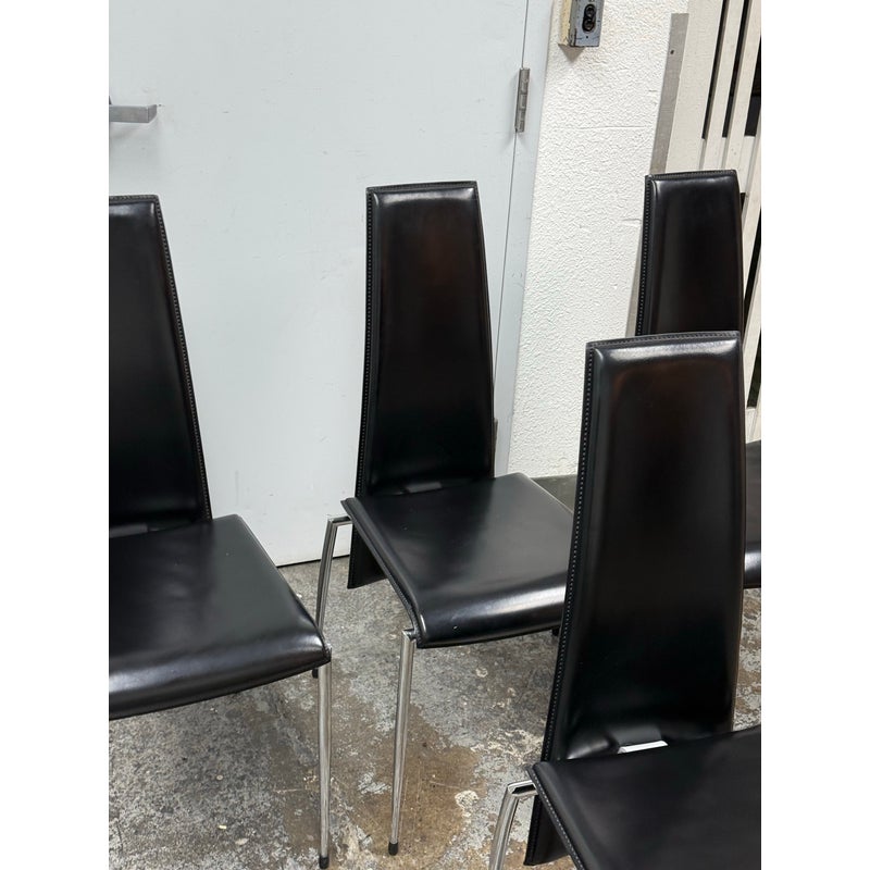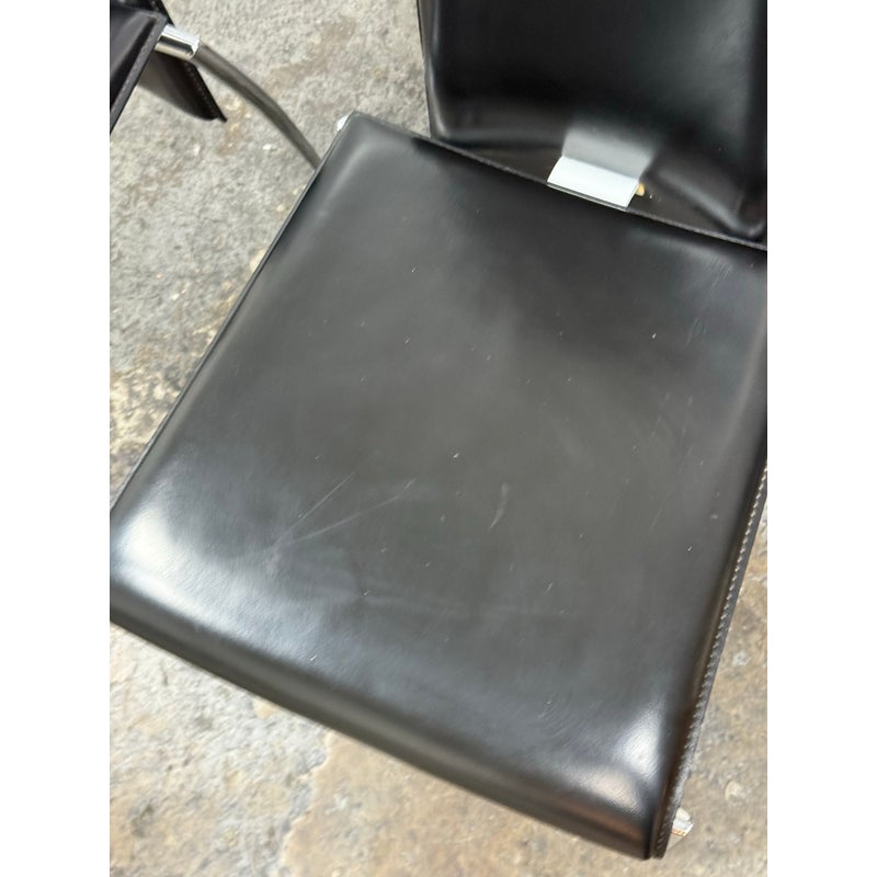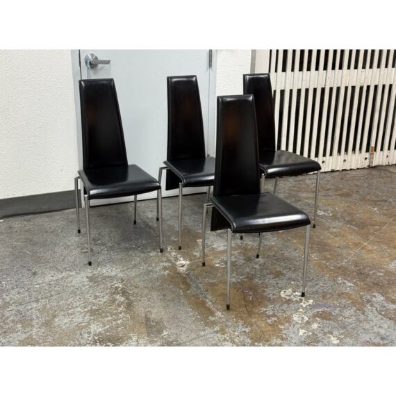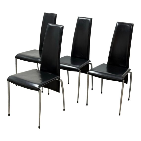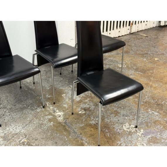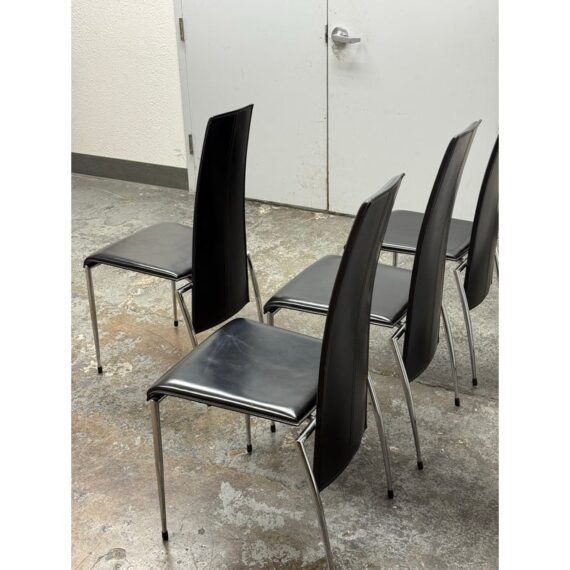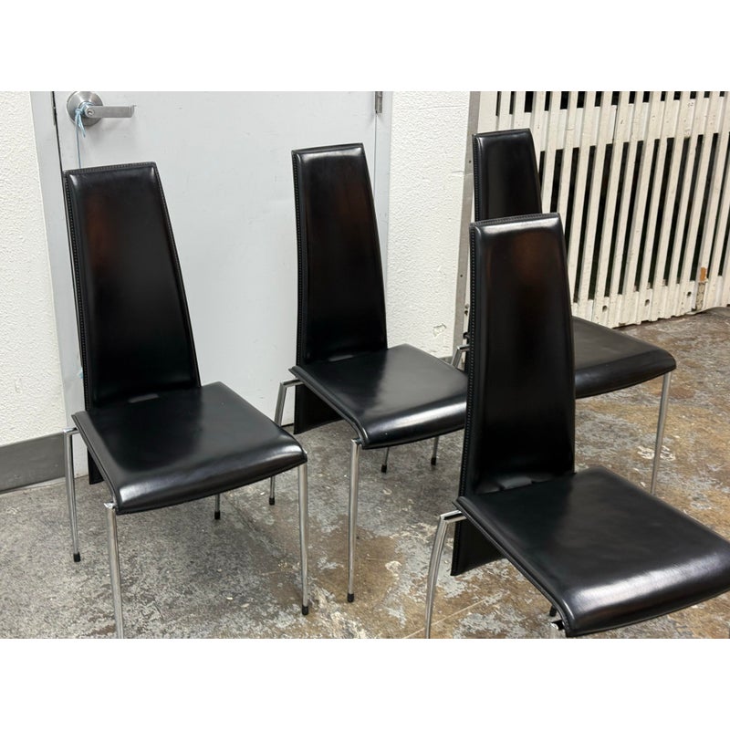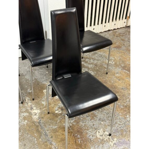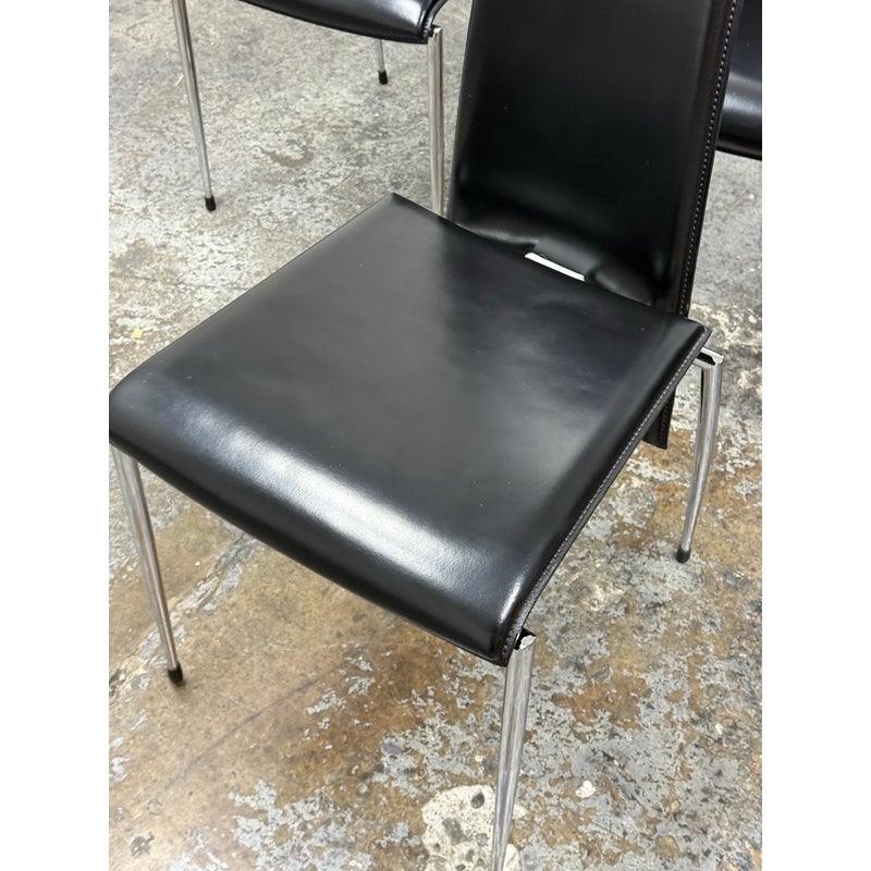 Design Plus Gallery presents a Set of Four Vintage Dining Chairs from Arper, Italy. Their modern silhouettes are framed in chrome plated steel, cushioned and then wrapped in full hide black leather. The leather has a cool look especially with their exposed back seam stitching. They are in good condition, visible and minimal wear from usage. Made in Italy.