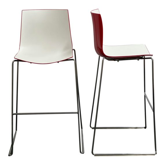 Design Plus Gallery presents a pair of Catifa 46 Barstools by Arper. Designed in 2004 by Lievore Altherr Molina, Italy. A sleek profile designed for constant use in smaller spaces. The body is made of plastic in two colors, white with an orange back, elevated on polished tubular steel sled base. Stackable and suitable for both indoors and outdoors. Light evidence of wear, good condition.