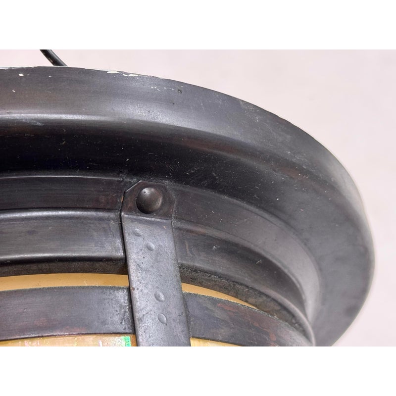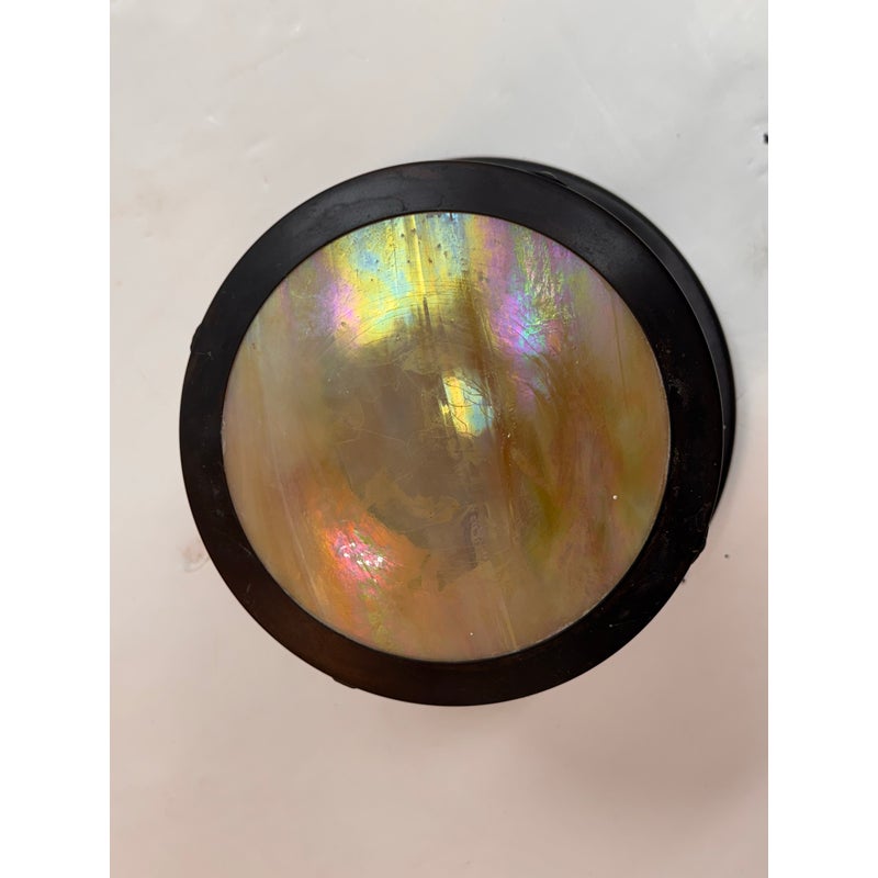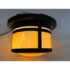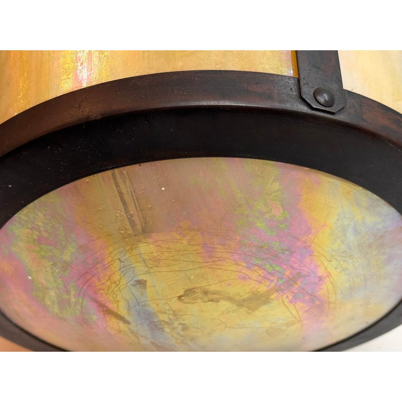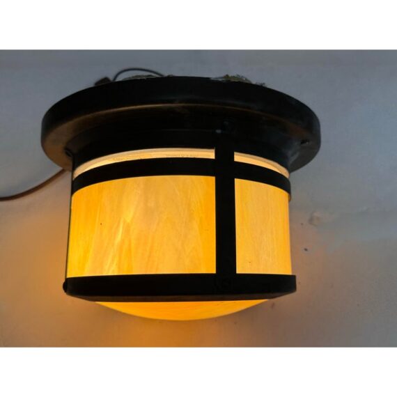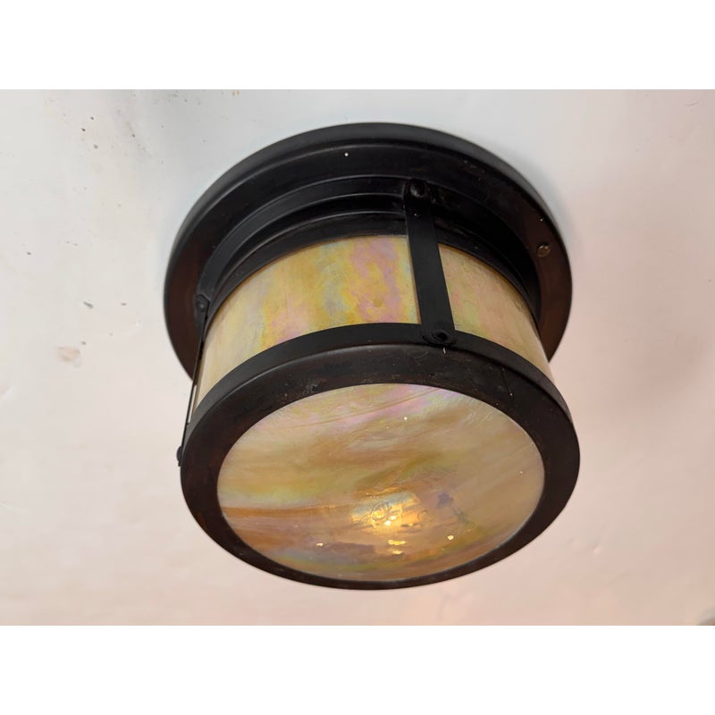 Design Plus Gallery presents the Berkeley Indoor/Outdoor Flush Mount from Arroyo Craftsman. The mixture will bring warmth and craftsman style in your home or on your patio. It is a satin black stain with gold iridescent glass panels for an artistic flourish that is always captivating to the eye. The fixture is in good condition for its usage with minimal wear. Made in the USA.