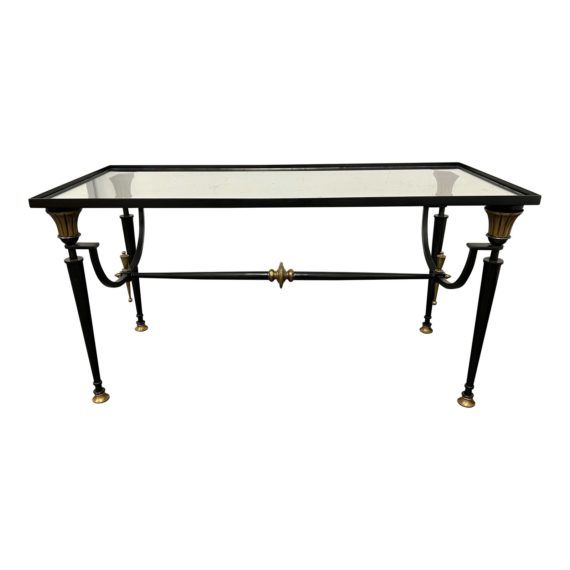 Design PLus Gallery presents a Art Deco Karl Kemp & A. French Coffee Table. Art Deco rectangular cocktail table is attributed to Gilbert Poillerat. Wrought iron is finished with patinated bronze details and original glass top with mirrored edges. The edges do show wear, coffee table is in good condition. Made in France in the 1930’s.