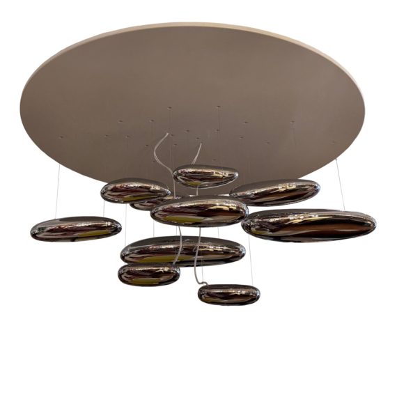 Design Plus Gallery presents a Space Age Mercury Floating Chandelier by Artemide. Design by Ross Lovegrove, the ceiling lamp has a circular aluminum anchoring plate. The diffusers are floating ‘pebbles’ in chrome that appear to be floating from the base. LED light source has shadows cast off the pebbles that beam down but also cast shadows above the plate. Is in good condition with visible and minimal wear. Made in Italy.
