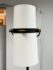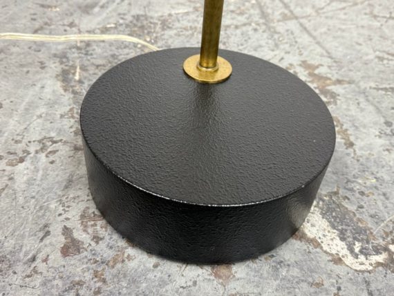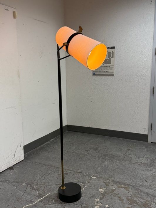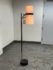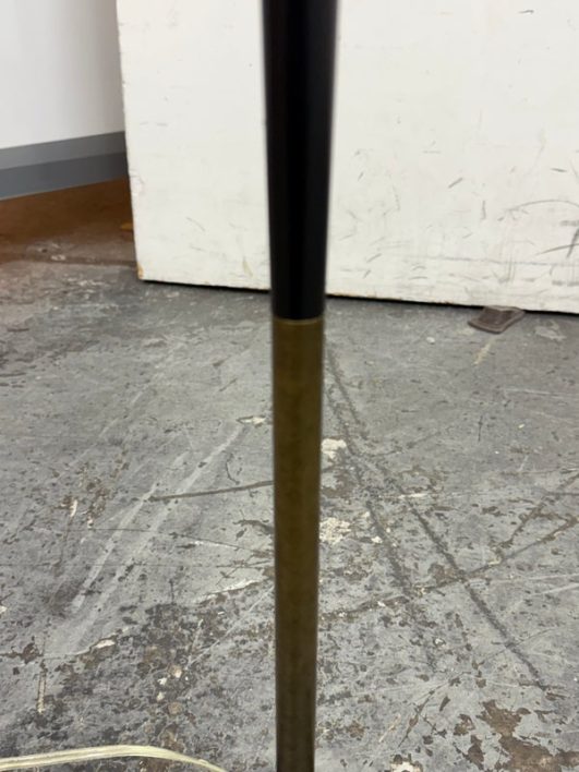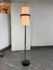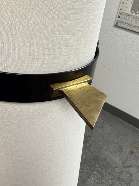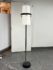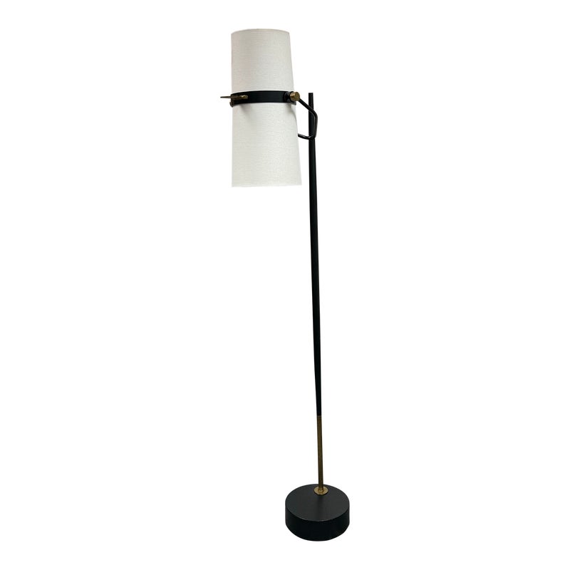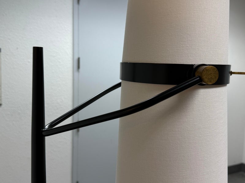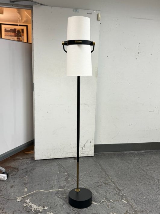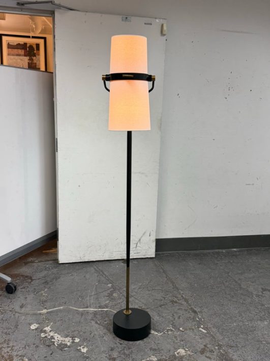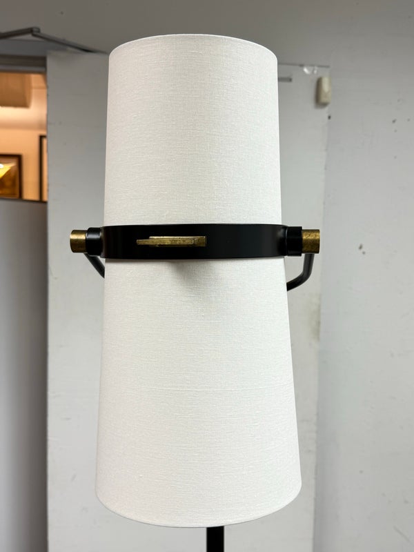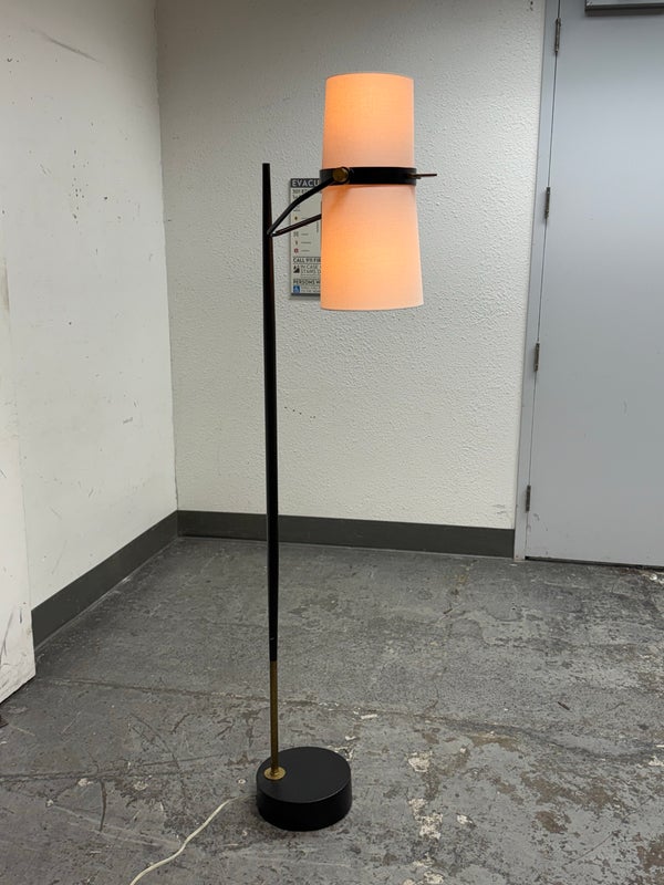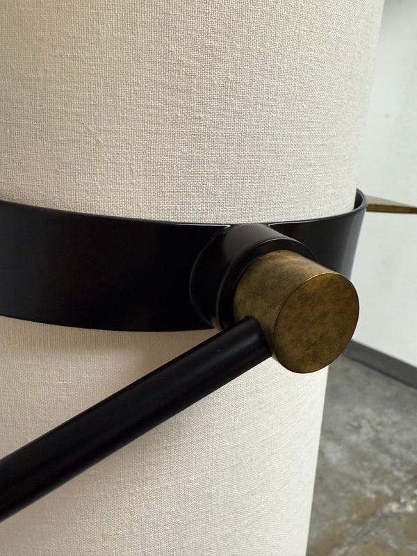 Design Plus Gallery presents a Asmin Floor Lamp by Arteriors. A modern floor lamp with a black iron tapered slender vertical rod. A white linen cylindrical double shade with an off-white corn lining allows for the direction task lighting. In good condition, minimal wear. Missing the finial.
