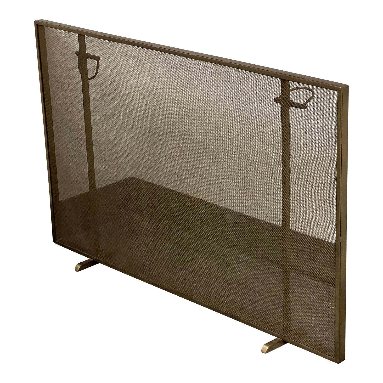 Design Plus Gallery presents the Brooklyn Panel Fireplace Screen by Arteriors. Quite a sleek and sophisticated addition that is made from iron with a matte brass finish. This screen features clean lines and a minimalist design that effortlessly blends with both traditional and modern décor. The screen is framed with exposed decorative rivets of a horse bridle, an always desired equestrian flare for those who know. Overall the screen is in good condition with some surface wear that doesn’t take away from its simple quiet luxury appeal. Visible and minor wear from usage + age. .