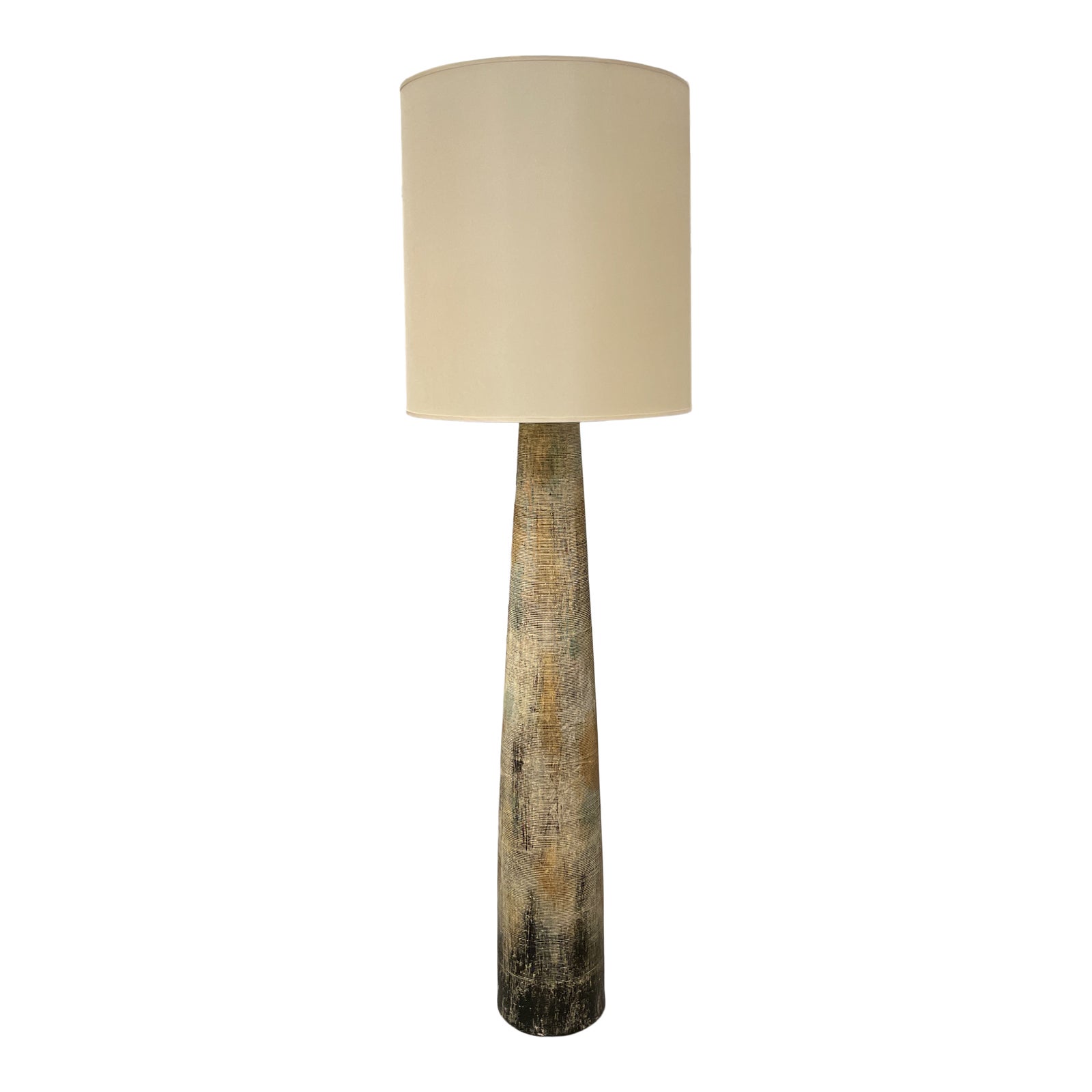 Design Plus Gallery presents a Arteriors Derrick Ombre Ceramic Textured Floor Lamp. Ceramic drum form is a narrow etched conical form with large oversized champagne shade. Hammered texture is hand painted with an array of earth tones starting at the base with dark umber. Minor wear through out, floor lamp is in good condition.