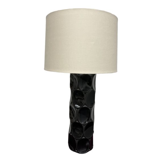 Design Plus Gallery presents a Arteriors Gunderson Charcoal Table Lamp. The sculptural ceramic form is reminiscent of the funky and brutalist forms of mid century design. The polished black base is crisp in contrast to the ivory linen barrel shade. Minor wear, table lamp is in good condition. Discontinued style from Arteriors.