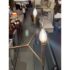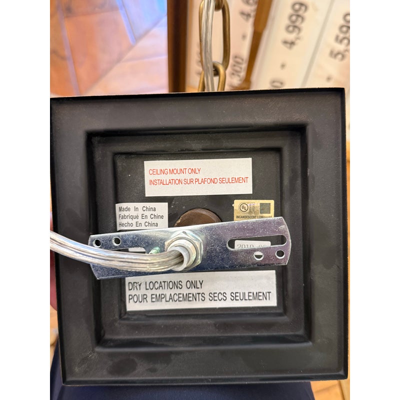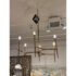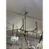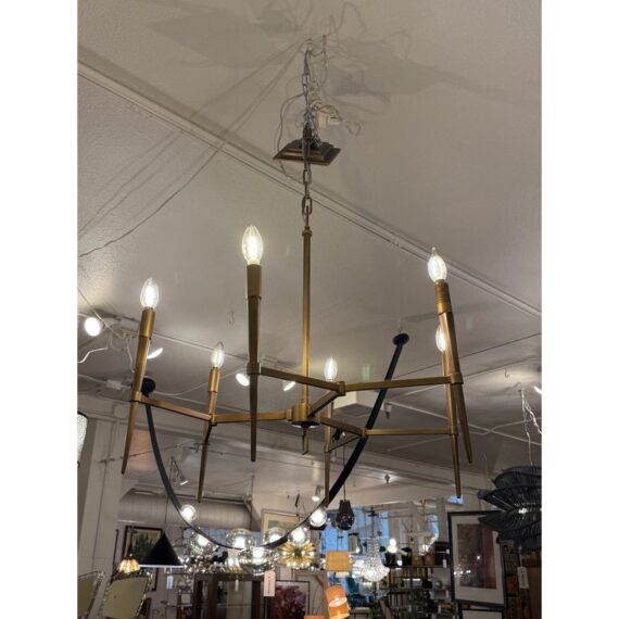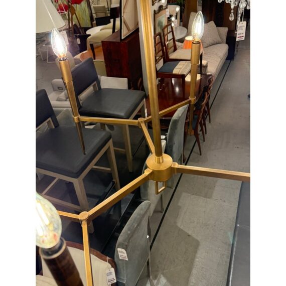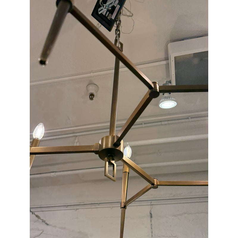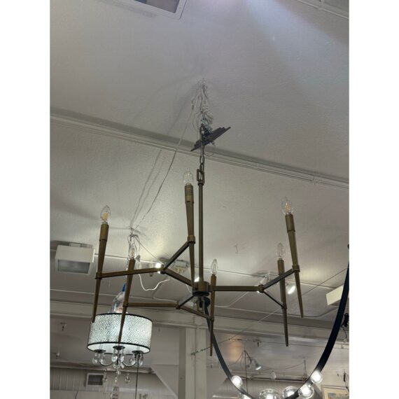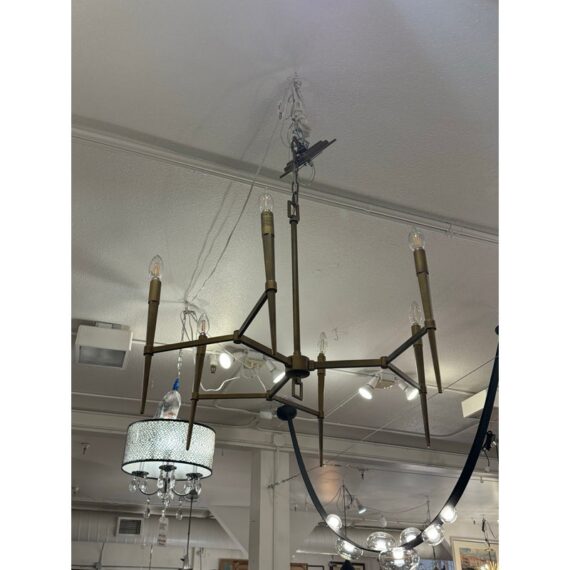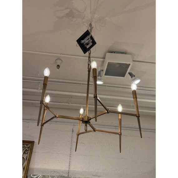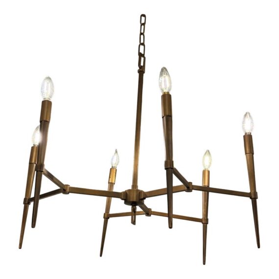 Design Plus Gallery presents the Auburn Chandelier from Arteriors. This modern six light chandelier showcases a geometrically inspired silhouette with torch-like tapered arms and an antique brass finish. The linear framework and balanced proportions give the piece a strong architectural presence, while the elongated candle-style sockets and slender arms emphasize its sculptural profile. This is a discontinued model with the brand and is in good condition with visible and minimal wear from usage.
