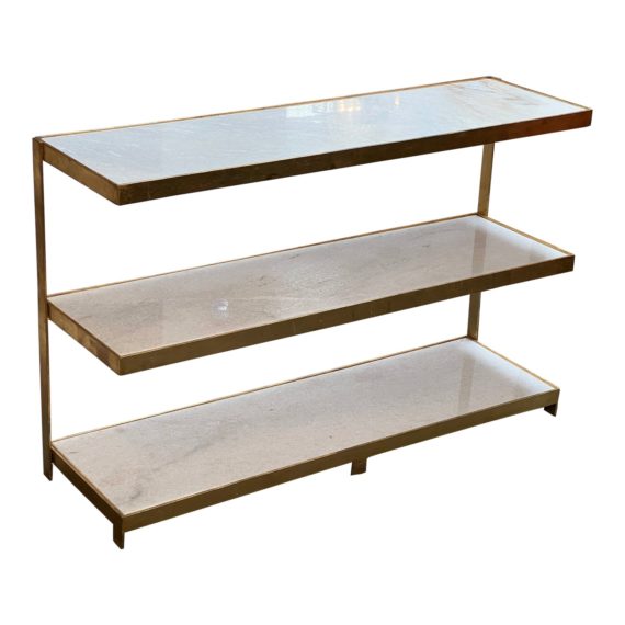Design Plus Gallery presents a Hattie Marble Top + Iron Console by Arteriors Home. From the Hattie Collection. A hand applied gold leaf finish over the durable iron base is inset with white marble cantilevered shelves. Light evidence of surface wear; condition is consistent with age and use.