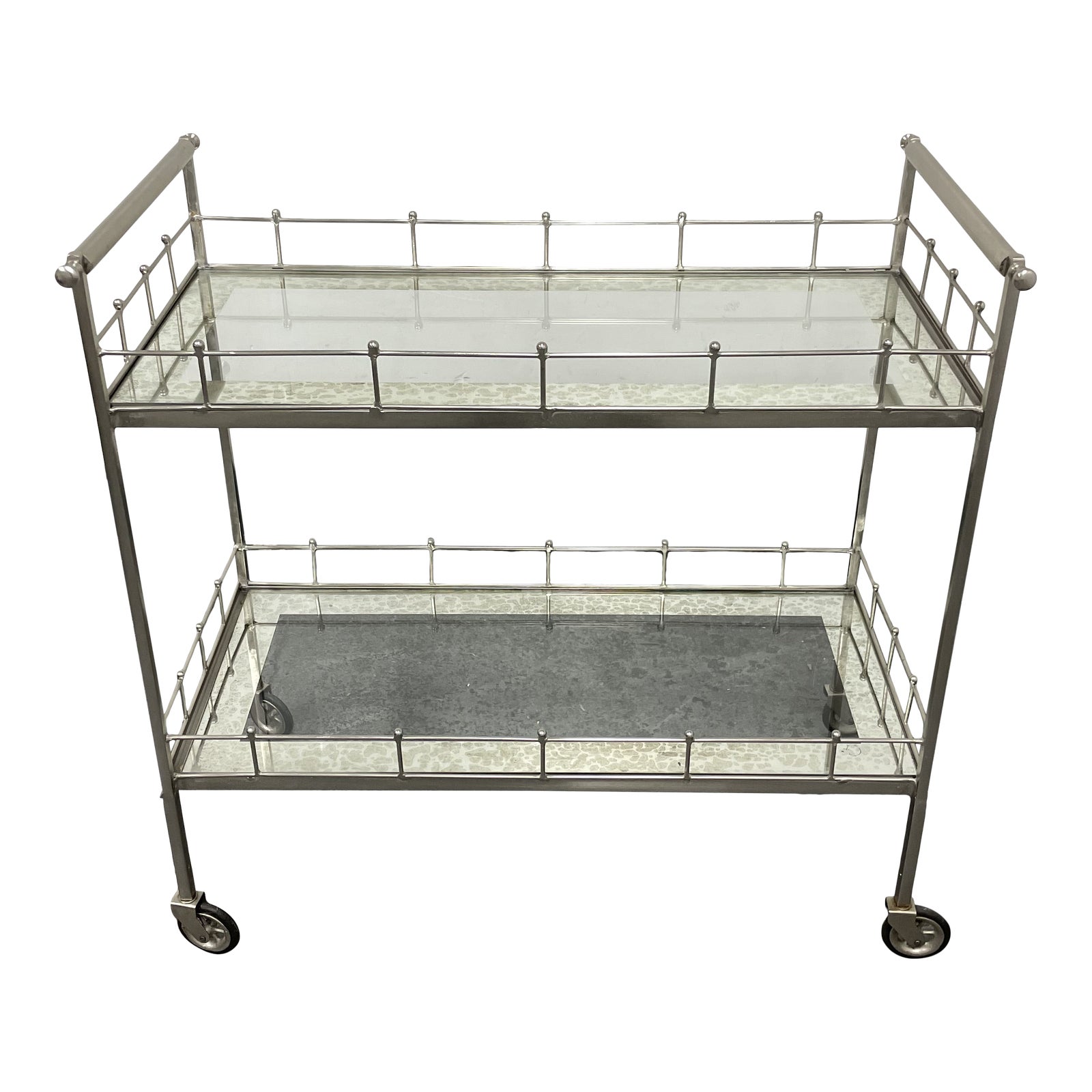 Design Plus Gallery presents a Kingston Brass Bar Cart Arteriors. A two-tiered metal frame storage cart. Two antiqued-mirror framed glass shelves. Casters for mobility. Minor wear from usage.