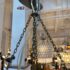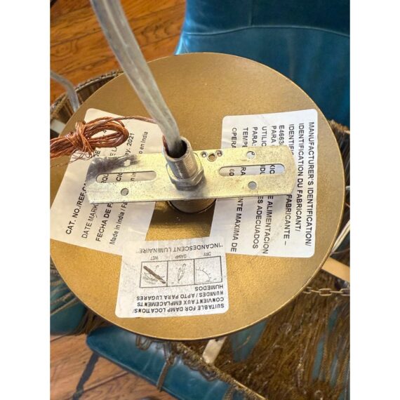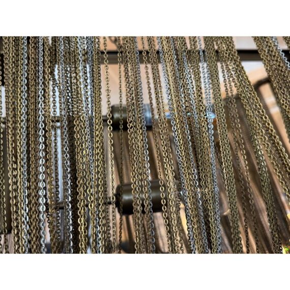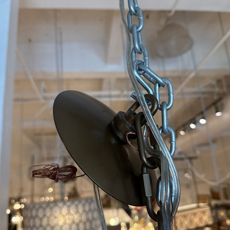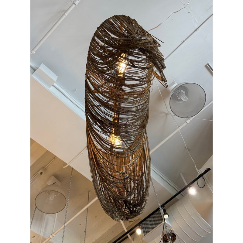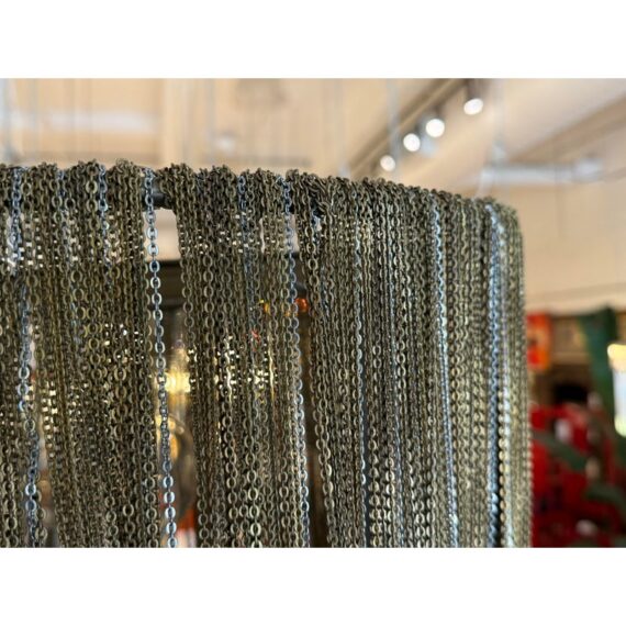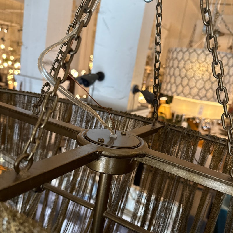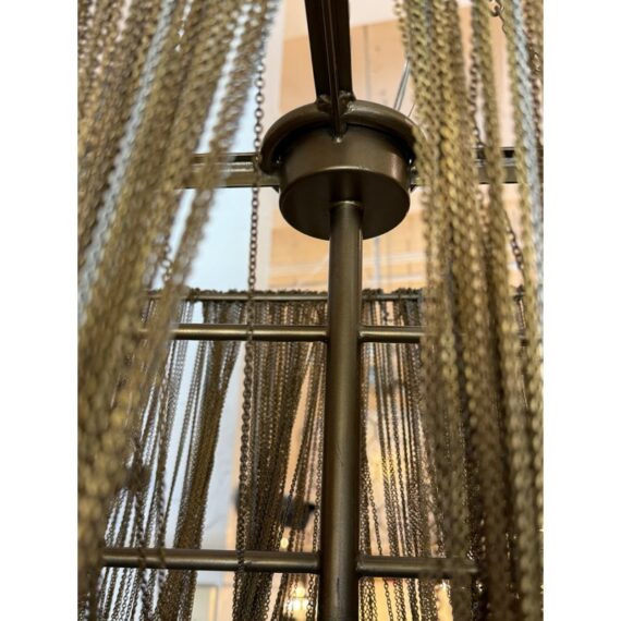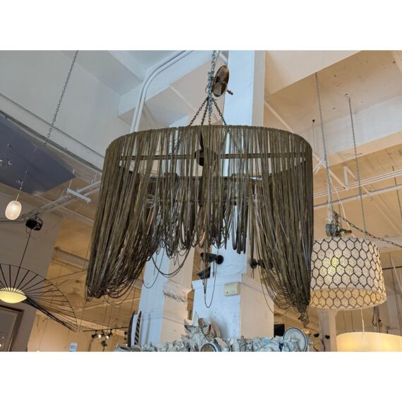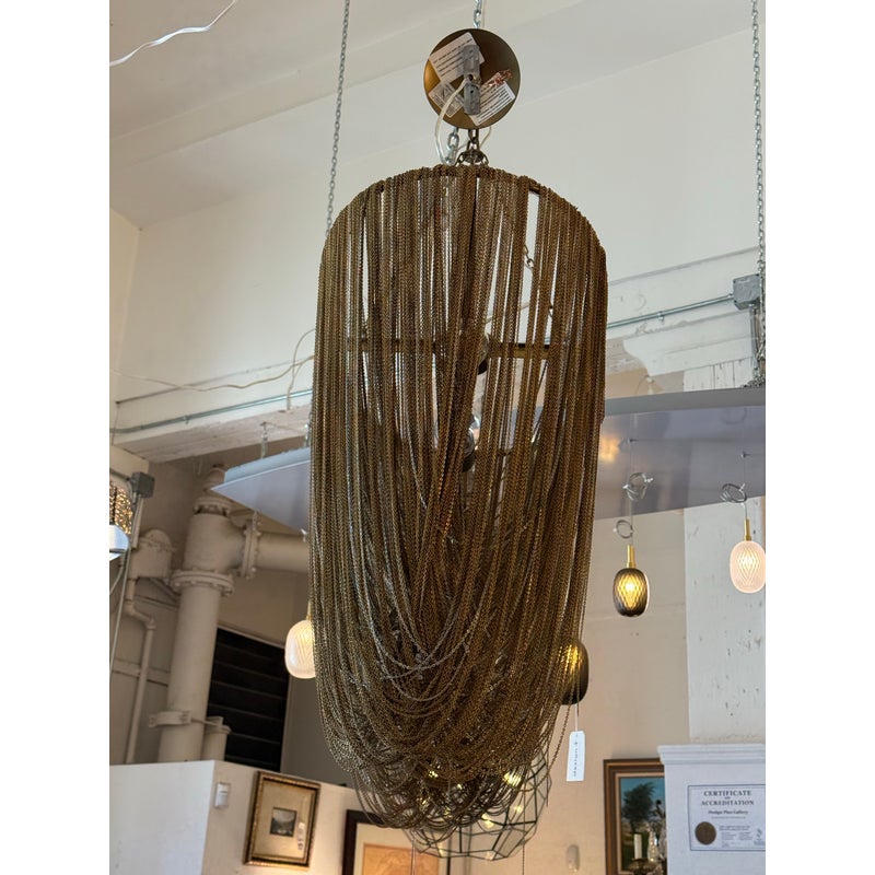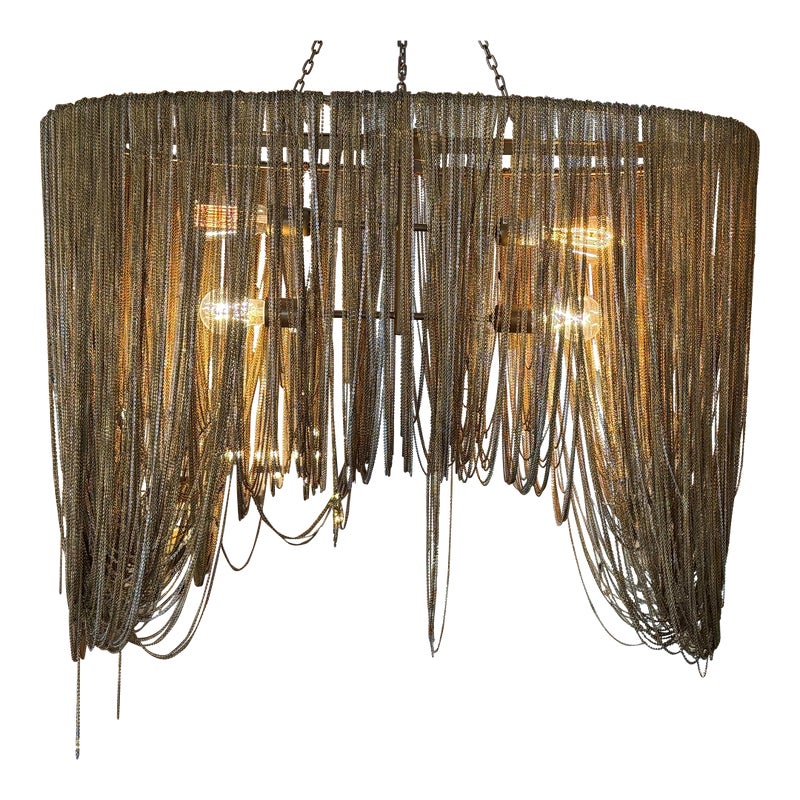 Design Plus Gallery presents the Layla Chandelier from Arteriors Home. A delicate handmade lighting option composed of many fine brass chains draped in a lethargic manner over a frame. The tangled look + uneven slopes of the chain add to its unique elegance. Four bulbs illuminate from the center, with two horizontal rows of two bulbs each. In good condition, minor wear from usage. Made in China.