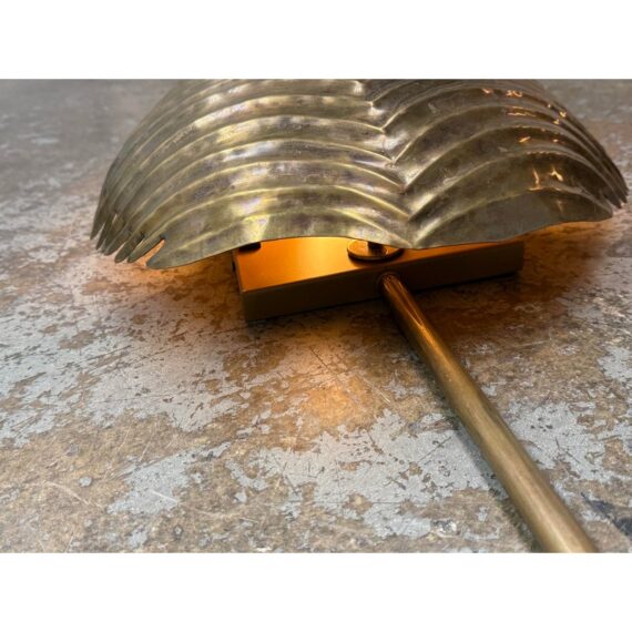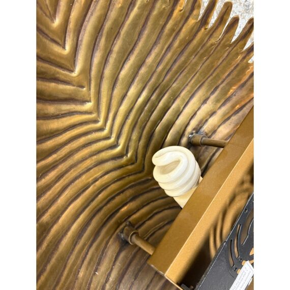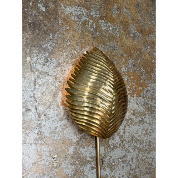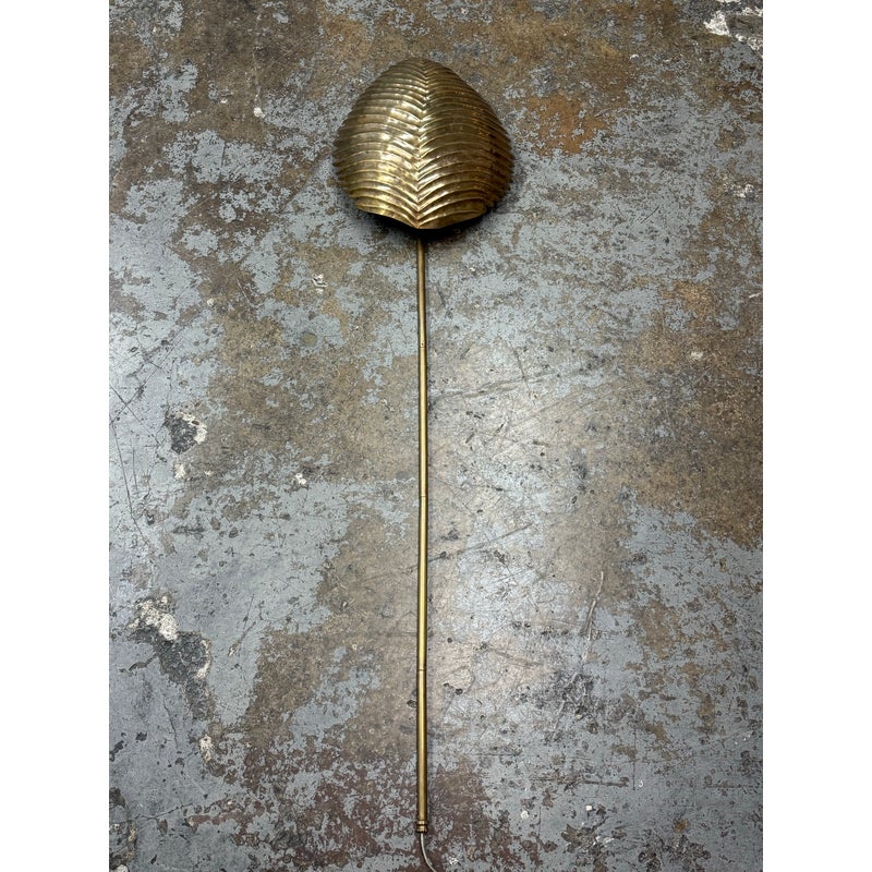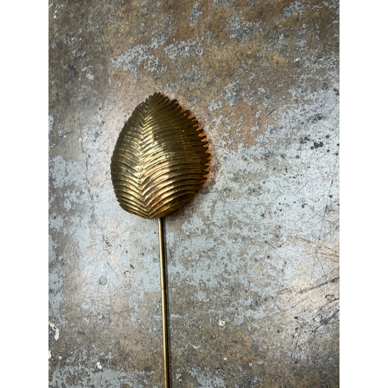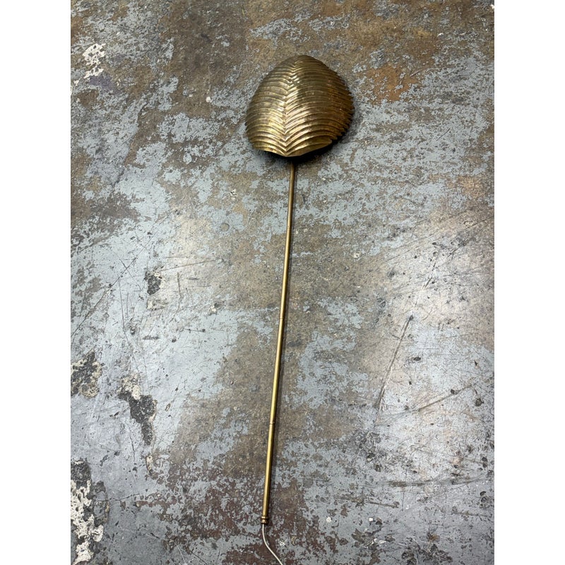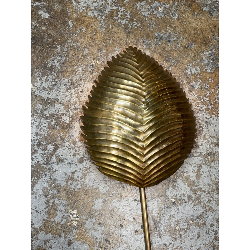 Design Plus Gallery presents the Myrtle Wall Sconce in Brass from Arteriors Home. Foliage Incorporate a tropical vibe into your lighting scheme by decorating with the Myrtle Wall Sconce by Arteriors. A unique piece with handcrafted features, this wall lamp is shaped like a large exotic leaf complete with ridges, intricate lines and a stem. It will provide a soft ambient glow and is ideal for mounting on narrow walls on either side of a window, fireplace or bed. It is in good overall condition with wear that is consistent with usage.