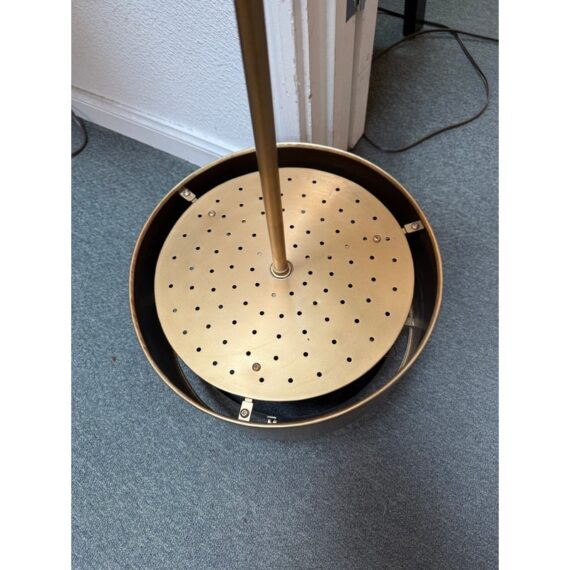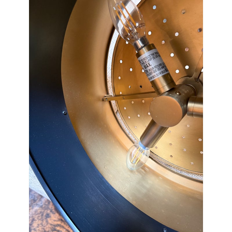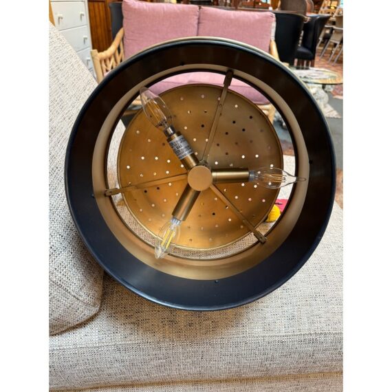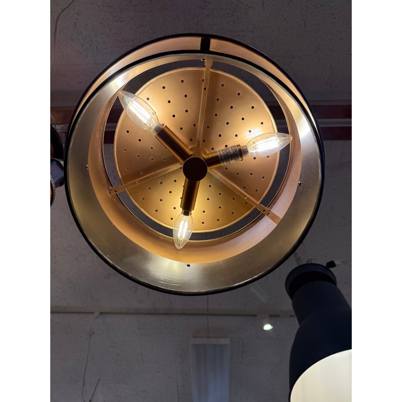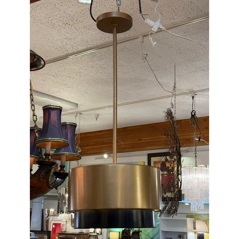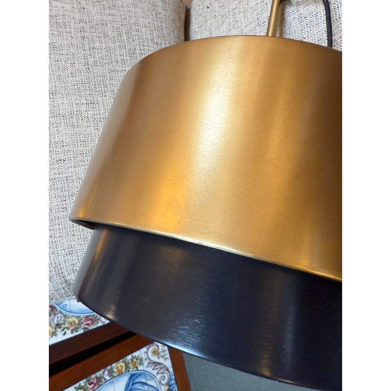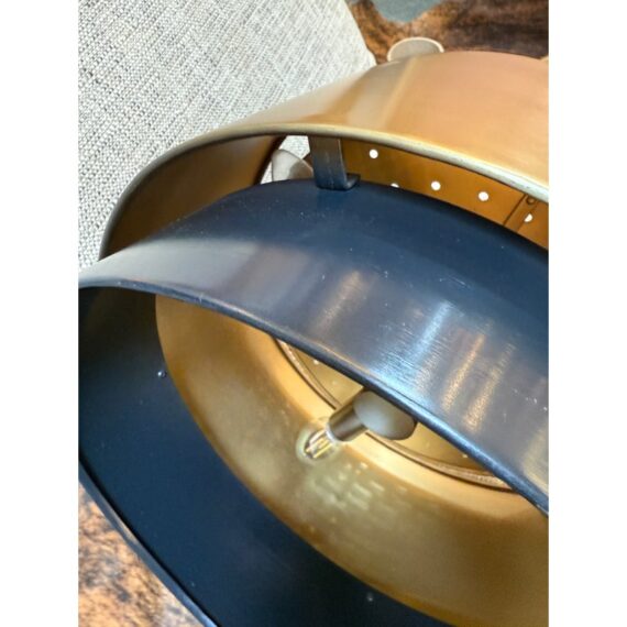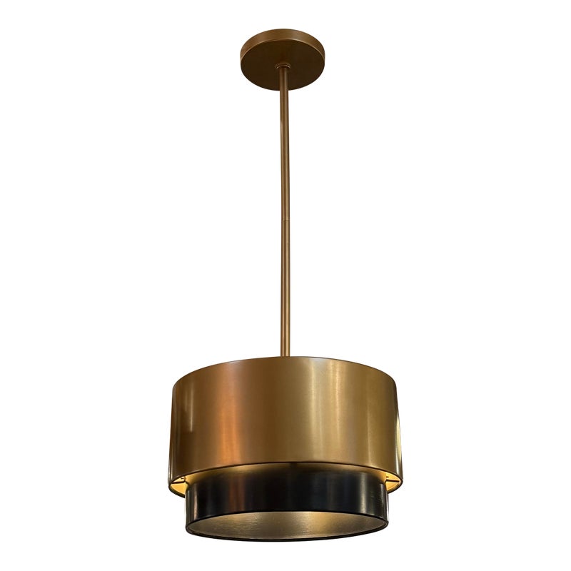 Design Plus Gallery presents the Nolan Pendant from Arteriors Home. This iron, mid-century-inspired, one-light antique brass-finished pendant is the perfect light to hang over your dining table. The dark bronze floating band adds contrast and dimensionality to the simple elegant design. The pendant is in good condition for its usage.
