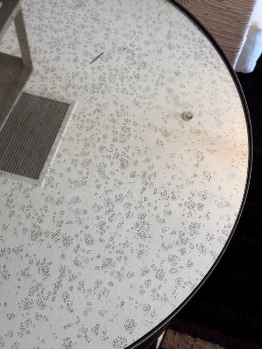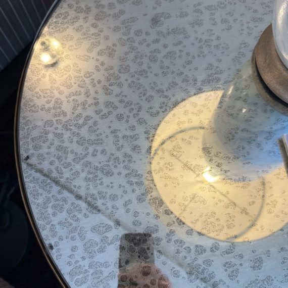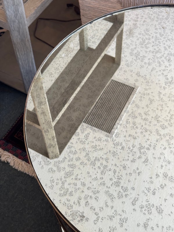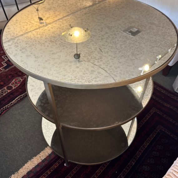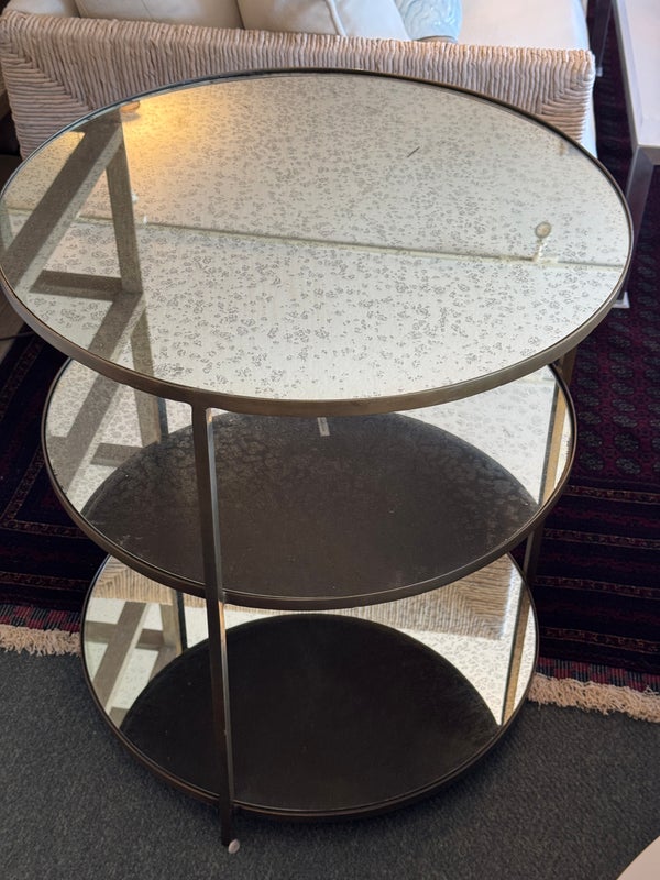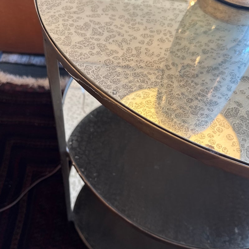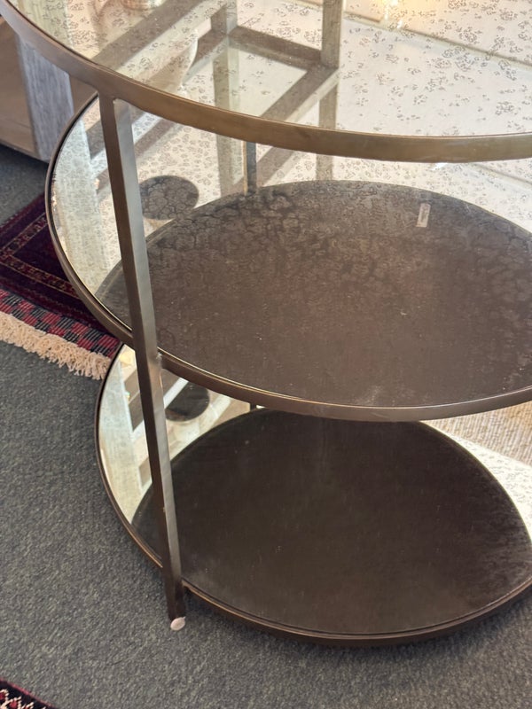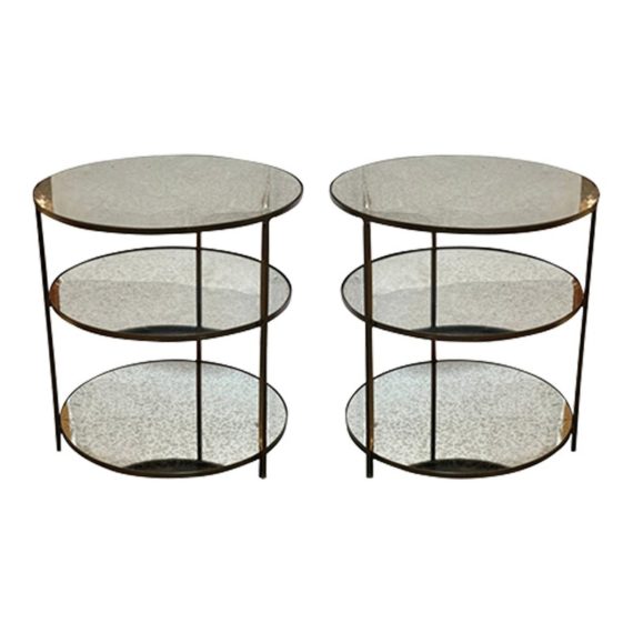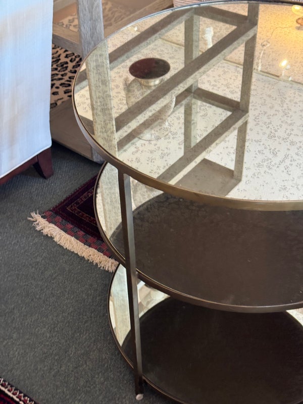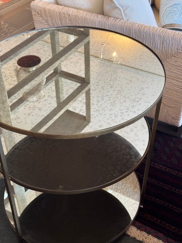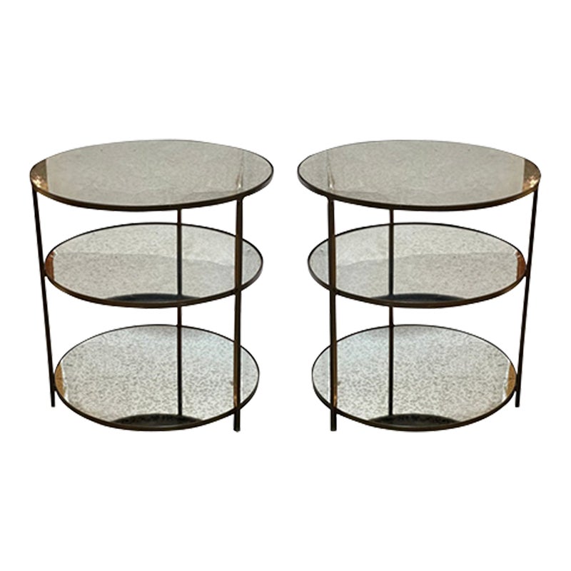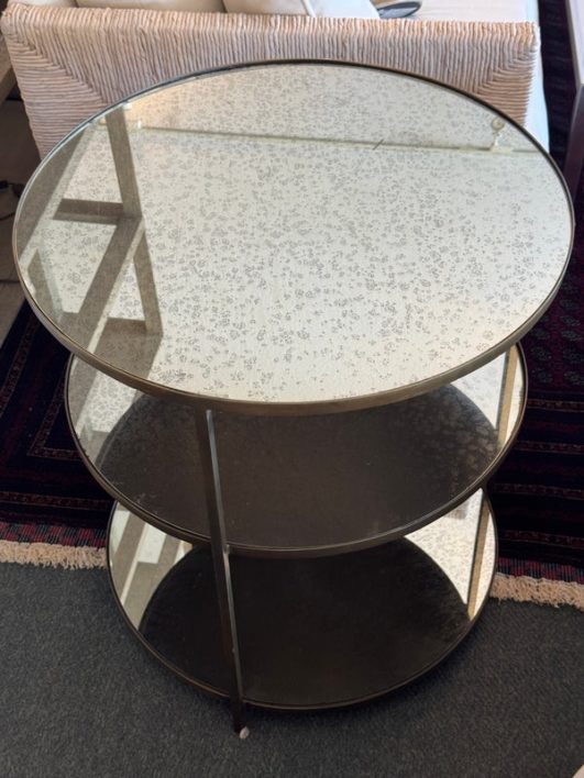 Design Plus Gallery presents a Percy Antique Brass + Mirror Side Tables by Arteriors Home. An antique feel with a clean, streamlined construction built for the 21st century. Its metal base is a slender layered piece. Three extended legs add a nice vertical and linear touch. Layers of inlaid glass have a subtle antique and elegant reflective quality. It makes for the perfect reading buddy. Rest a neat table lamp atop of it and store your favorite books in the shelves below. In good condition, minor wear from usage.
