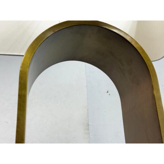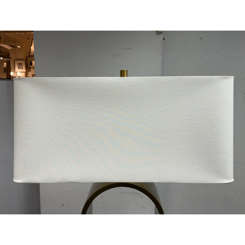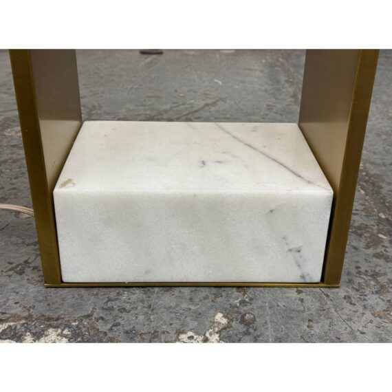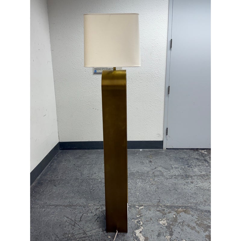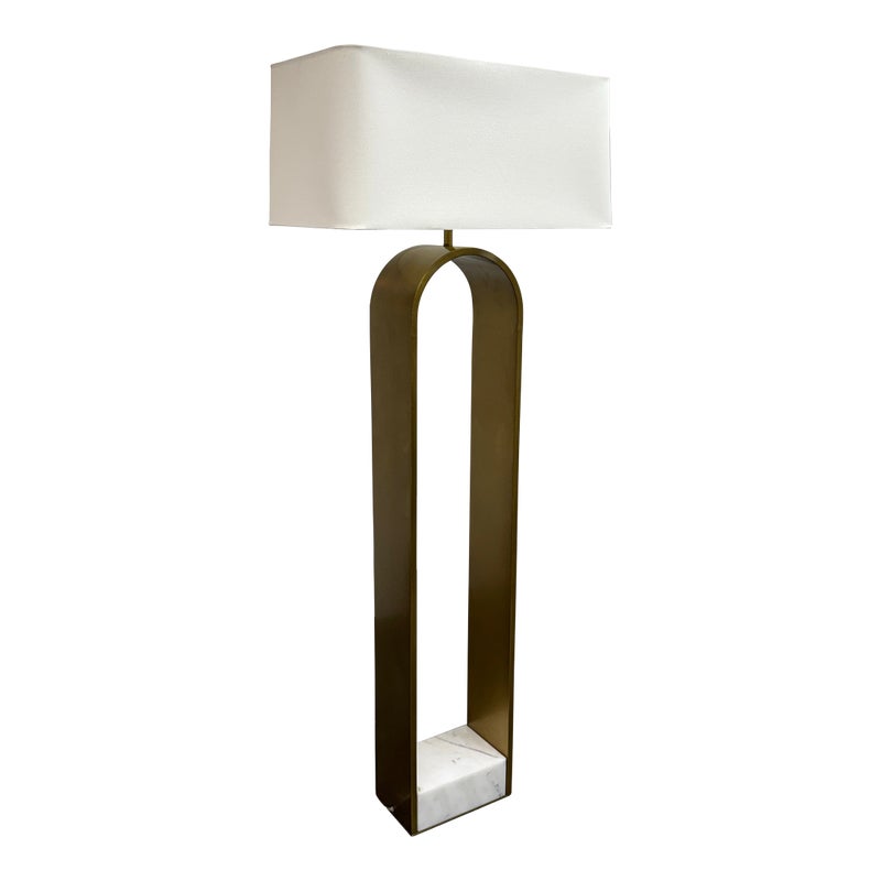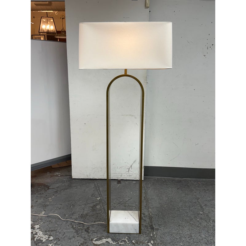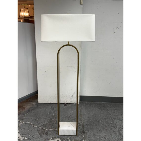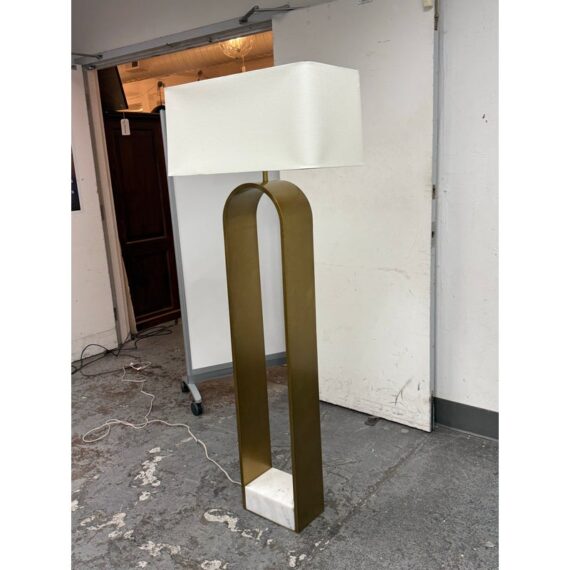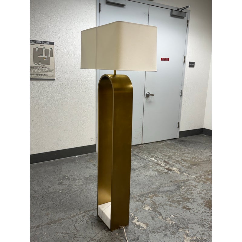 Design Plus Gallery presents the Rylan Floor Lamp from Arteriors Home. This floor lamp is simple, charming, and effortlessly refined with its tall, slender frame in antique brass that arches upward with graceful ease. The frame is anchored by an S white marble base for a grounded, luxe presence. Topped with a rectangular white linen drum shade that casts a soft, even glow that flatters any setting. Equal parts modern and timeless, slips seamlessly into living rooms, reading corners, and bedrooms, adding warmth, height, and understated sophistication without overwhelming the room. In good condition, visible and minimal wear from usage.
