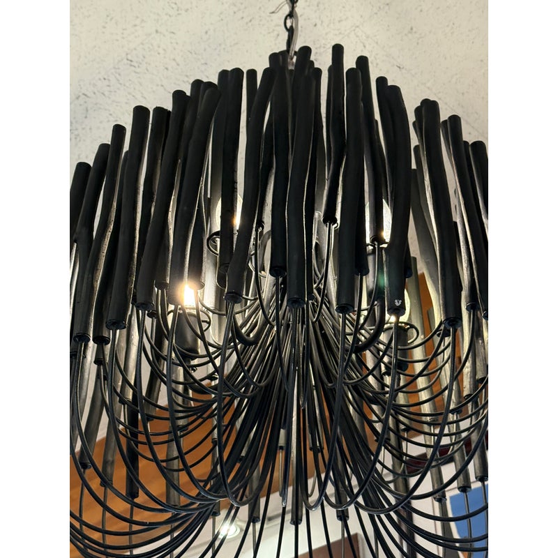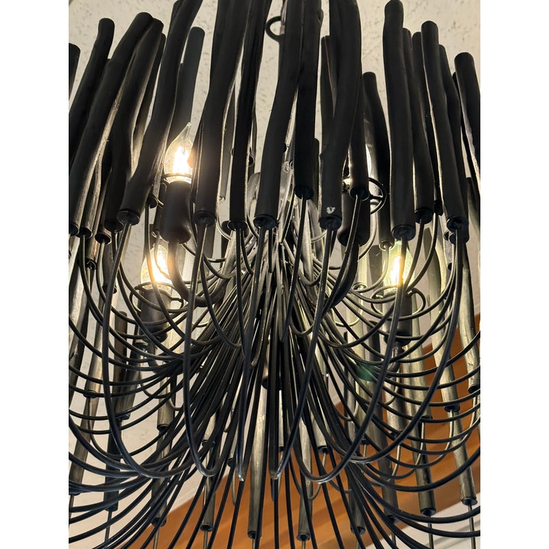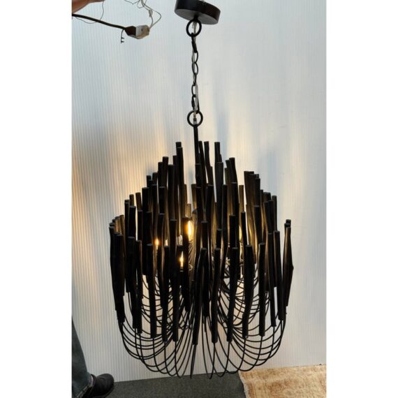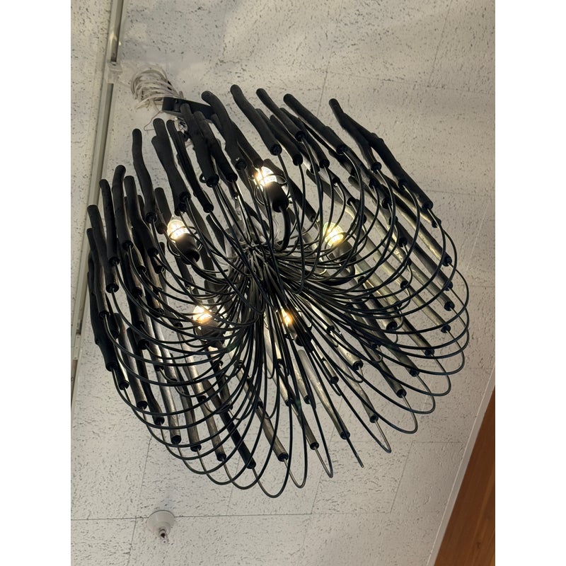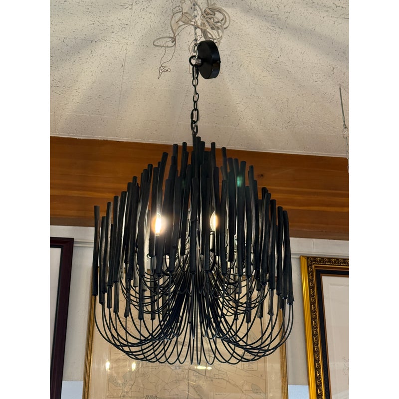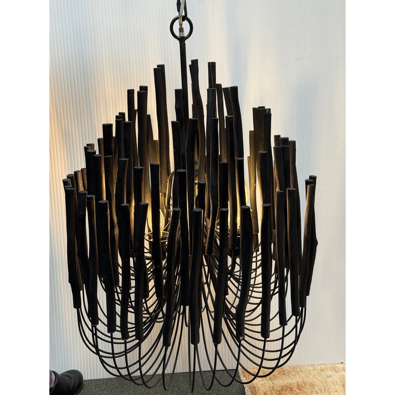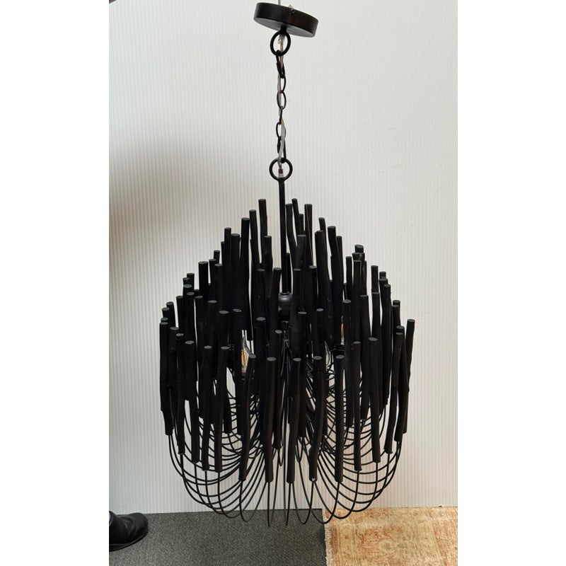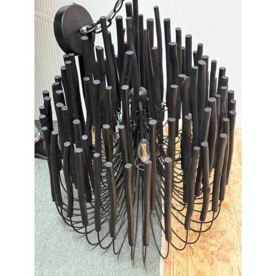 Design Plus Gallery presents the Tilda Chandelier from Arteriors. The pendant light is considered to be rustically refined with its multiple wooden dowels that curve upward on pliable iron arms. The iron is coated with black, allowing for this rustic piece to take on a hint of gothic appeal. Overall the light fixture is in good condition for its overall usage with minimal surface wear.
