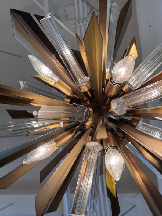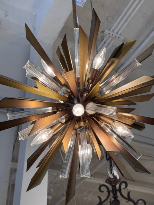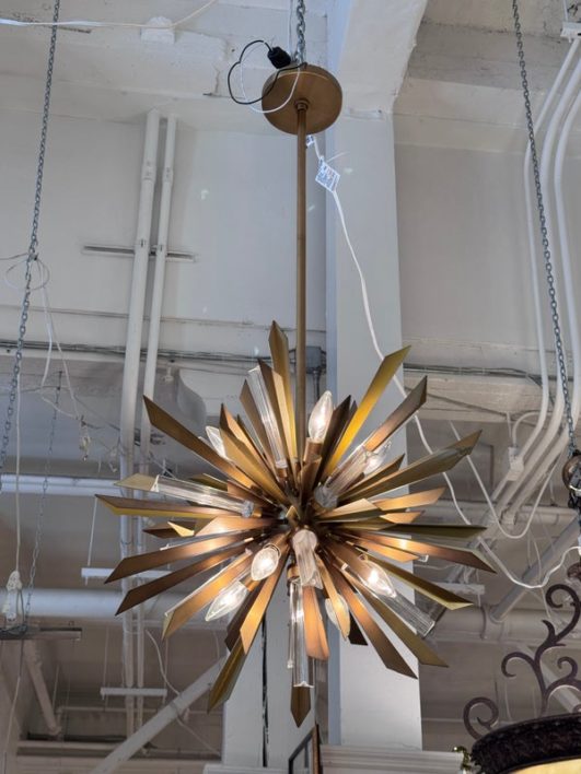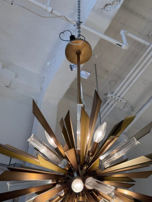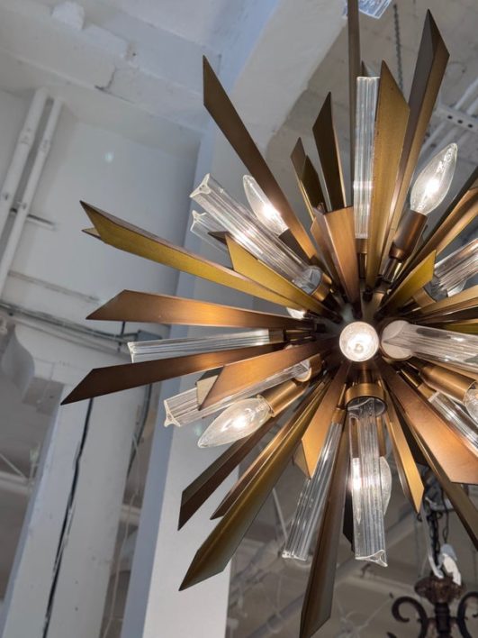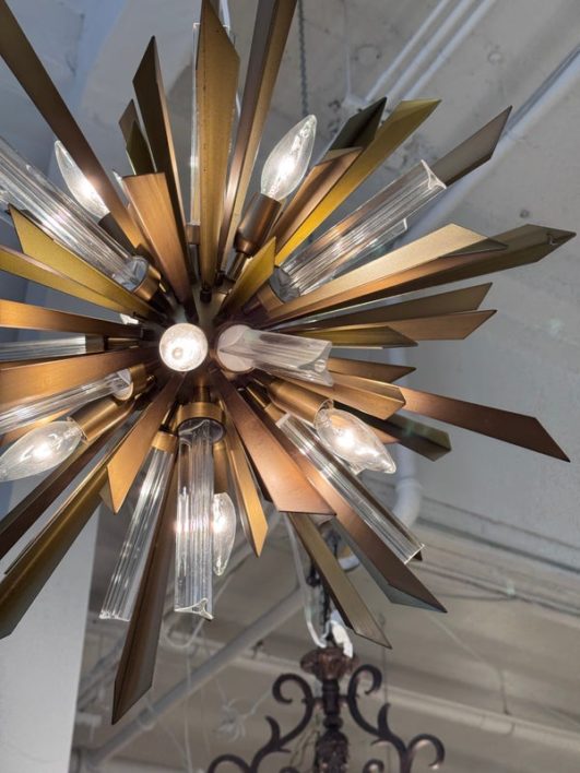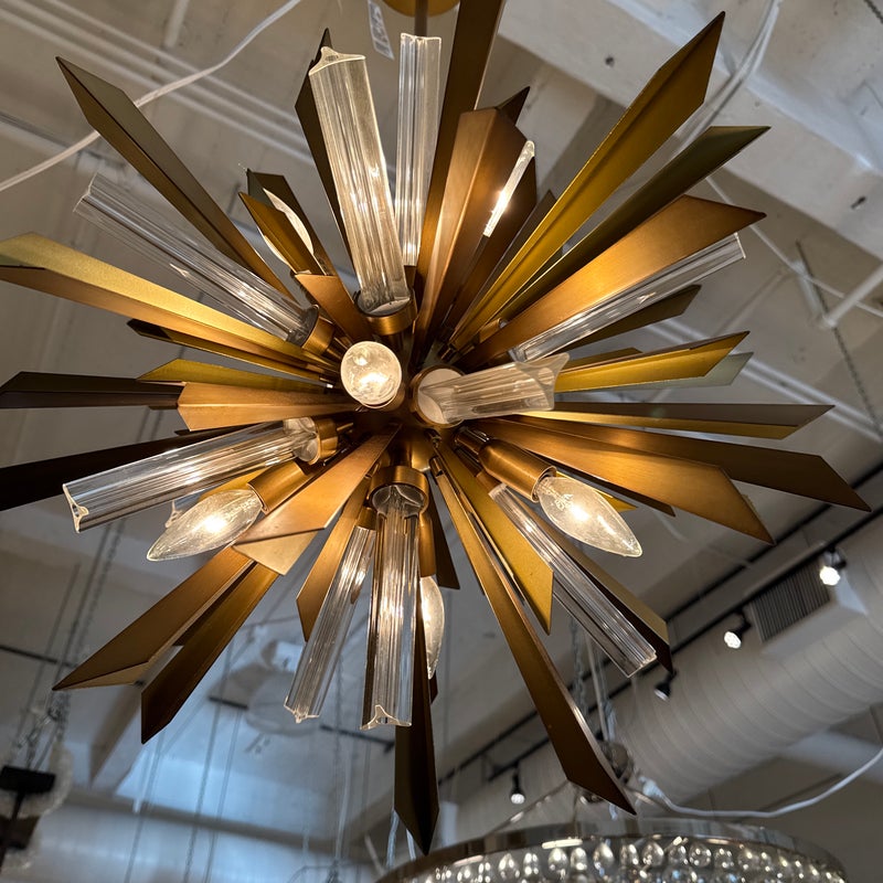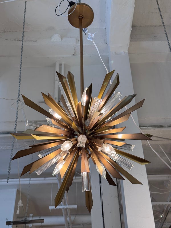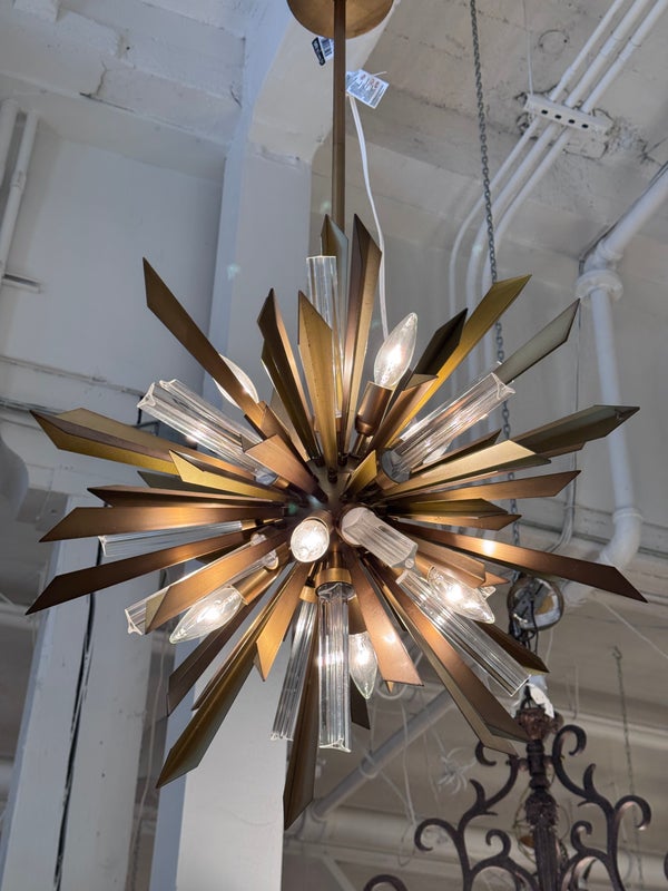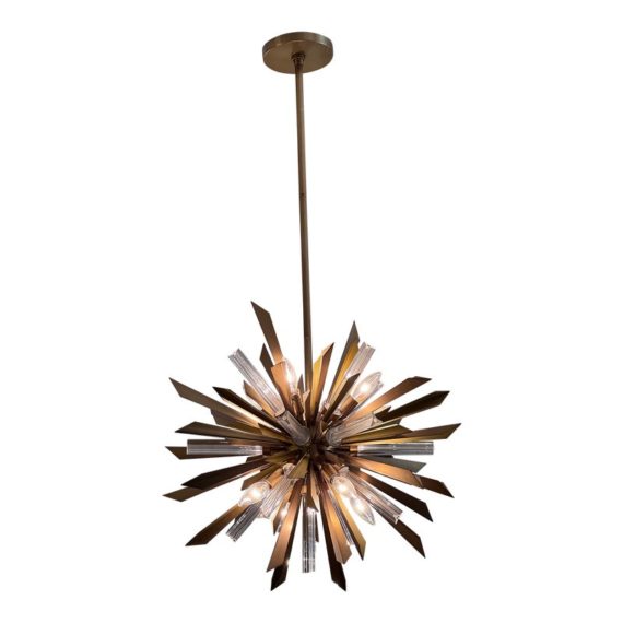 Design Plus Gallery presents the Antiqued Brass Sputnik Style Small Waldorf Chandelier from Arteriors. Depth and scale are transformative features in this eight-light chandelier. Angular steel shards in varying sizes extend from the center creating a vibrant form finished in antique brass. Clear glass rods are interspersed throughout adding a nice contrast from the metal.