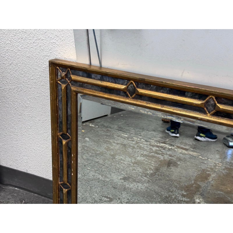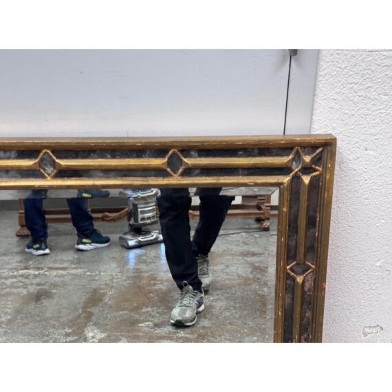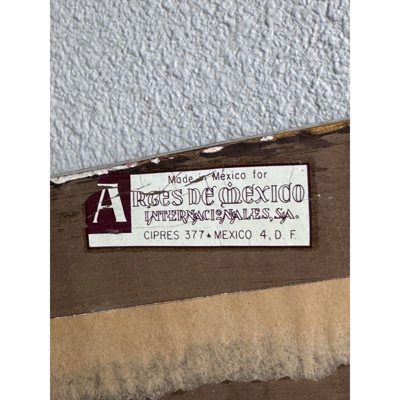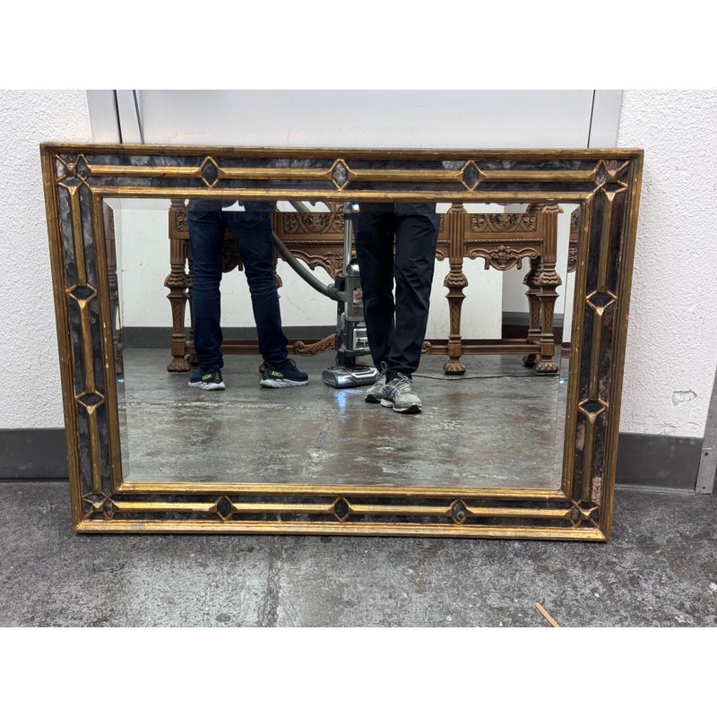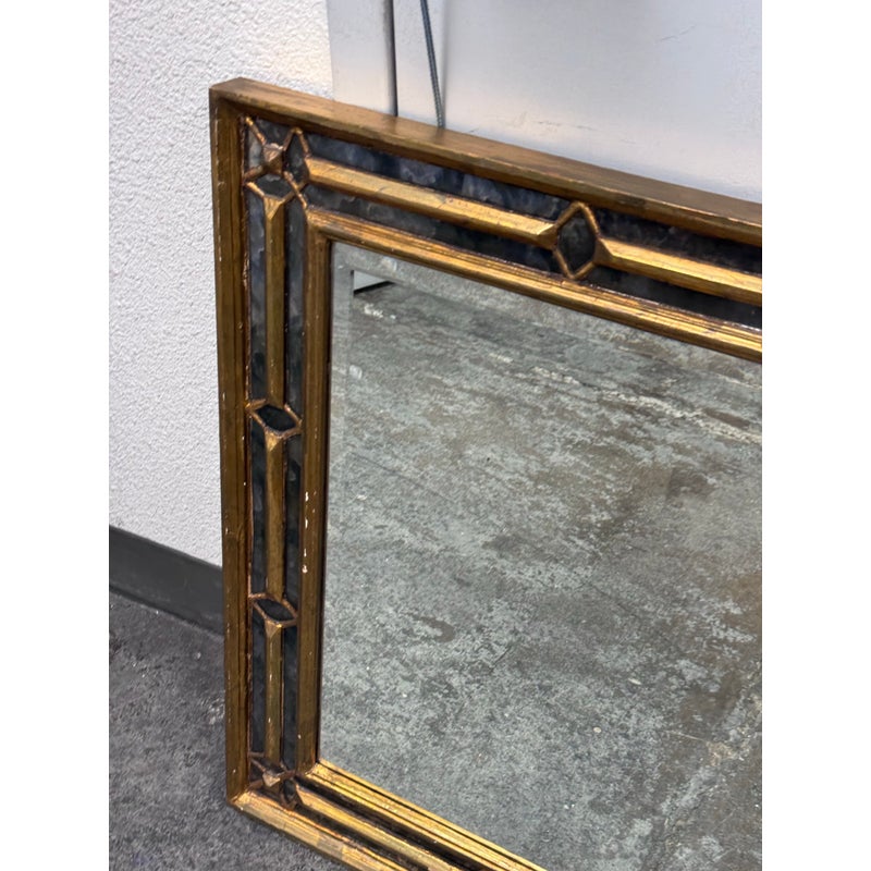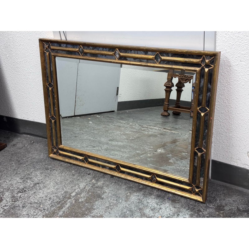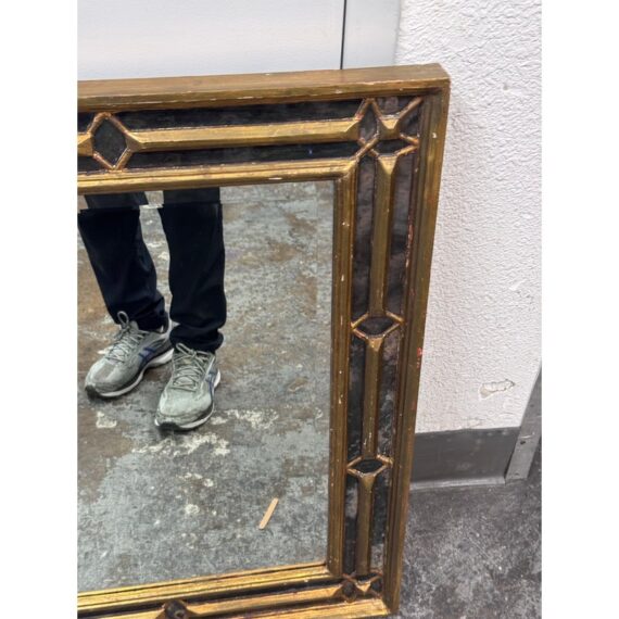Design Plus Gallery presents a Golden Wall Mirror by Artes De Mexico. This rare and vintage item, handcrafted by skilled artisans, boasts intricate work around the mirror frame. It features diamond and cross-hatched gold gilt molding that captivates the eye. The gold elements are interspersed with what appears to be painted tile on the beveled edge of the mirrors. A brand sticker on the backside ensures its authenticity. Visible wear is present and lend to its vintage age + distressed style.