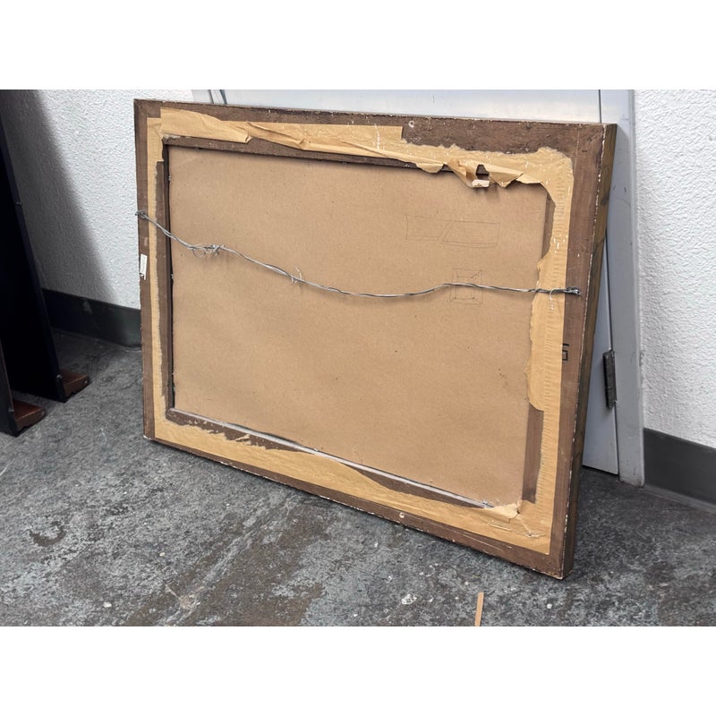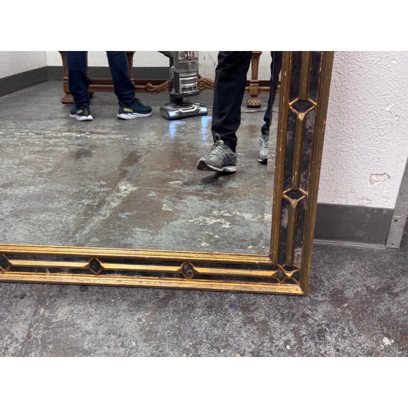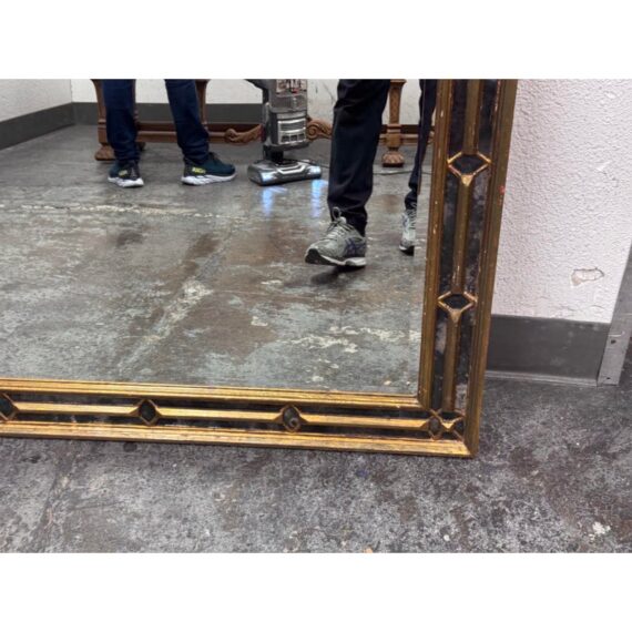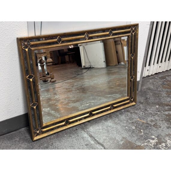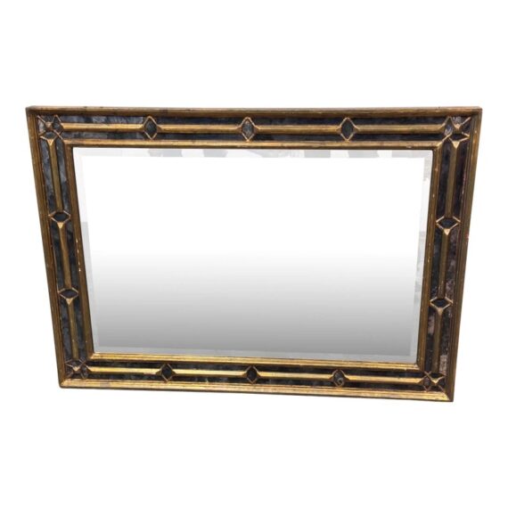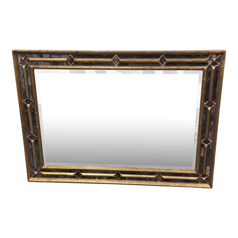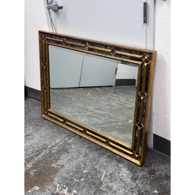 Design Plus Gallery presents a Golden Wall Mirror by Artes De Mexico. This rare and vintage item, handcrafted by skilled artisans, boasts intricate work around the mirror frame. It features diamond and cross-hatched gold gilt molding that captivates the eye. The gold elements are interspersed with what appears to be painted tile on the beveled edge of the mirrors. A brand sticker on the backside ensures its authenticity. Visible wear is present and lend to its vintage age + distressed style.