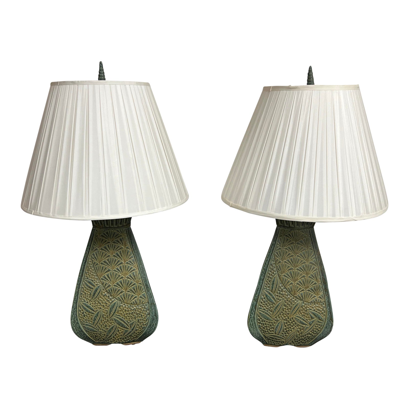 Design Plus Gallery presents a Pair of Celdon Table Lamps by Artful Home. The triangular prism-like bodies are constructed with ceramic and feature green botanical accents throughout. The finial is ribbed and conic. The shades are subtly conic and feature rolled edges. Minor wear from use; table lamps are in good condition.