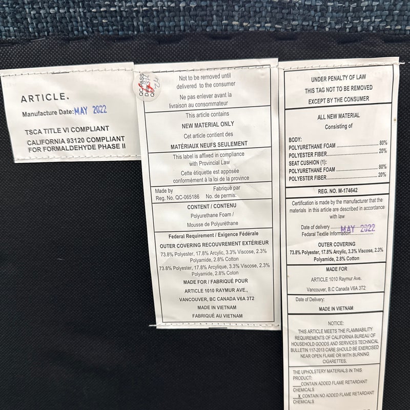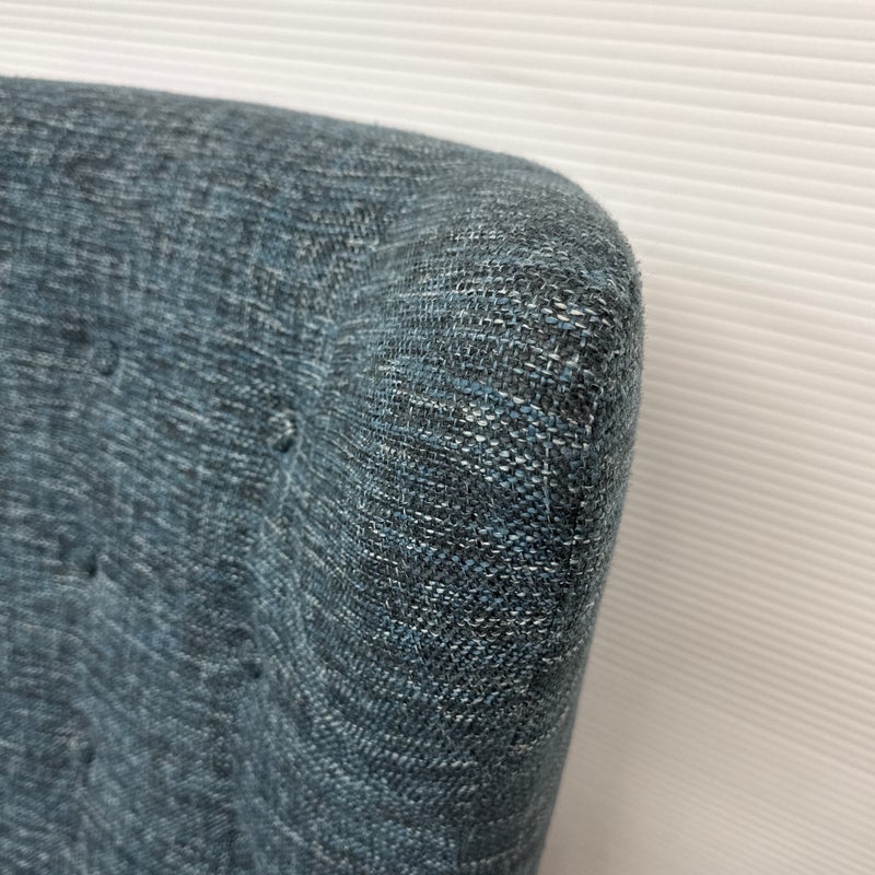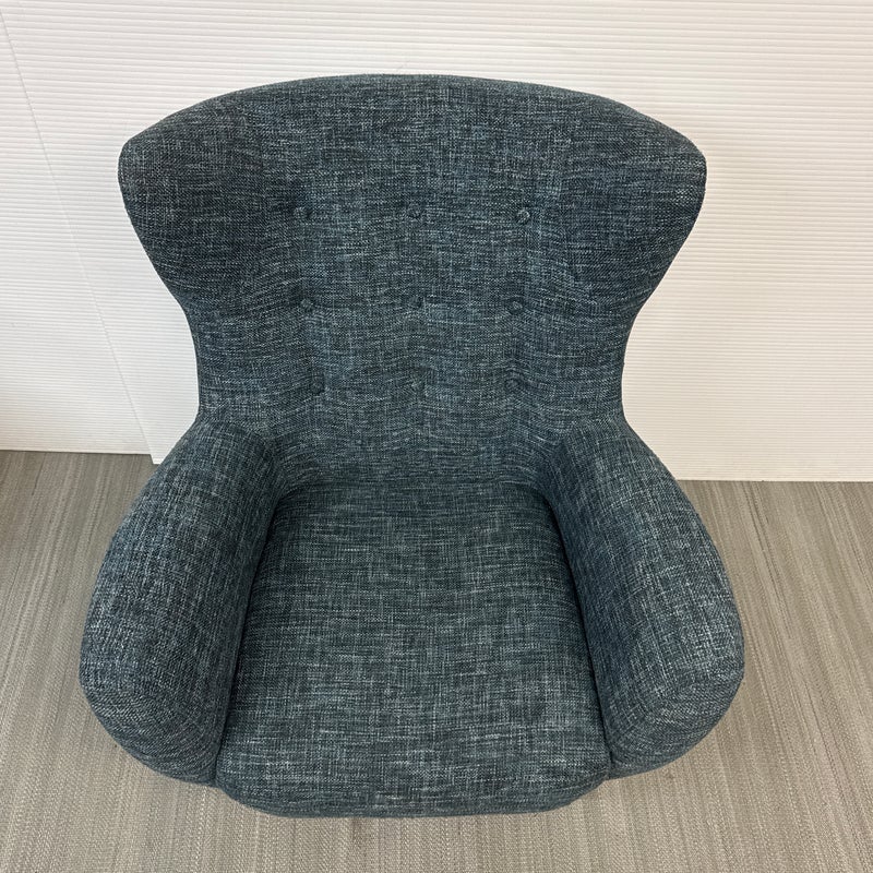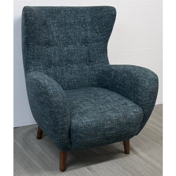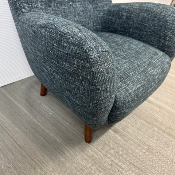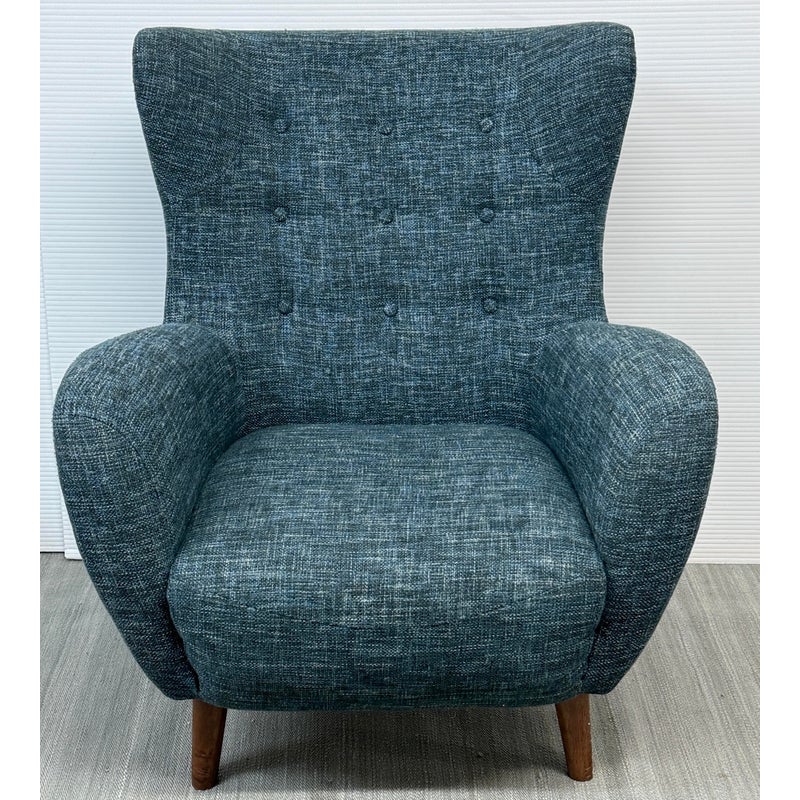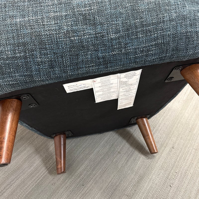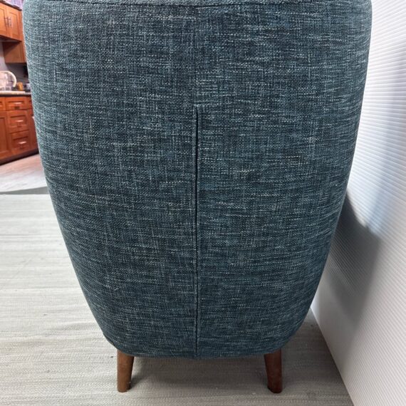 Design Plus Gallery presents The Mod Lounge Chair from Article. The mid-century-inspired Mod chair is the ideal destination for relaxation and rejuvenation. Crafted with comfort in mind, it features a generously cushioned backrest, a deep seat, and elegantly curved arms. The chair’s solid walnut stained wood legs elevate it slightly, and it has a unique tweed fabric in a deep, dark navy tone that they have name Blueberry. Little wear; condition is good.