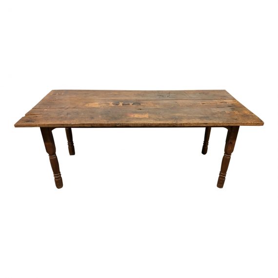 Design Plus Gallery presents a unique table + desk. Pegged construction, the piece is inlaid with primitive fish designs, the rough and rustic surface is intriguing. Narrow depth and turned legs, the table would work as an inspirational desk.