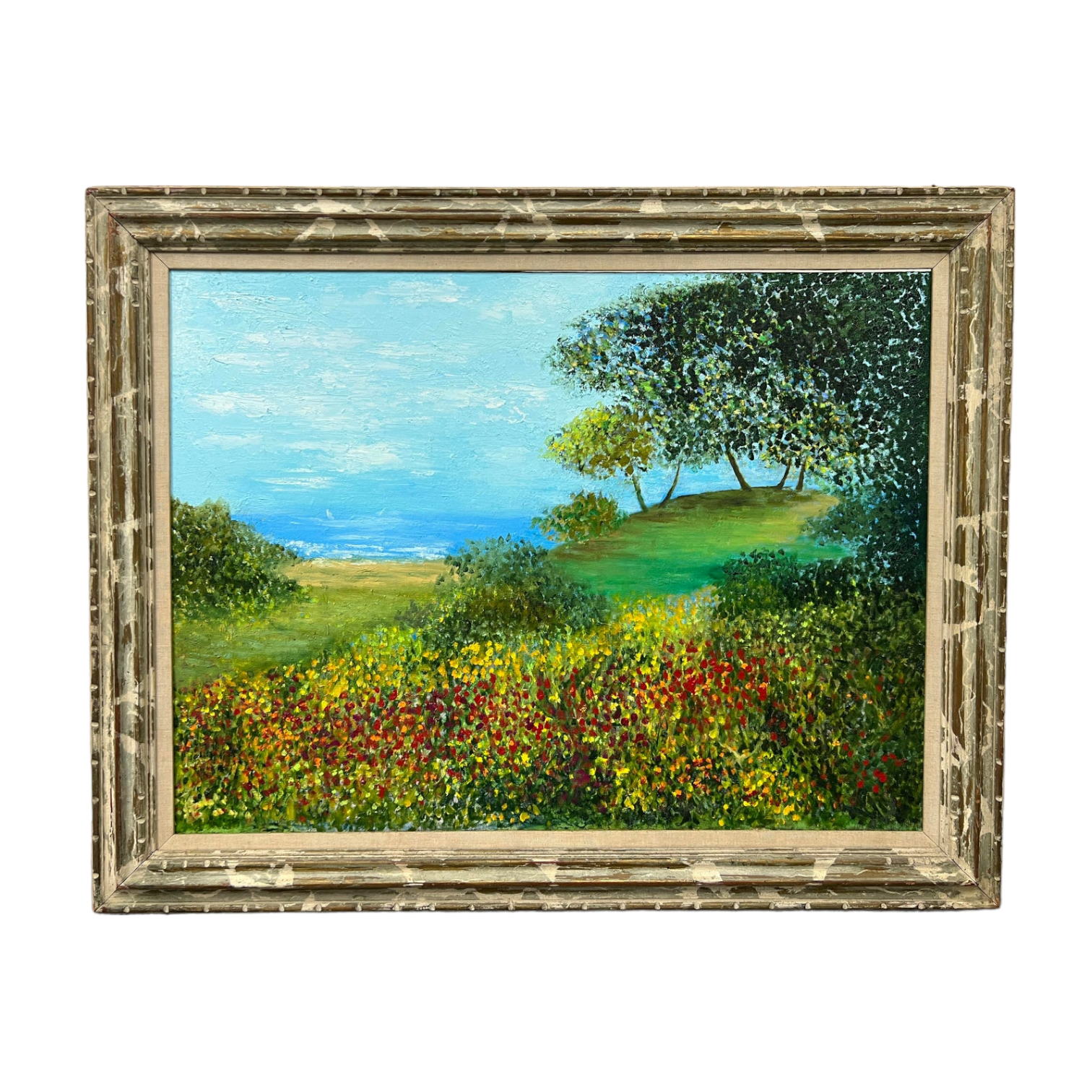 Design Plus Gallery presents a Vintage Oil on Canvas by Artist B. Clark. The artistic presence of this painting is in an ocean in the background with a flowering meadow in the forefront of the frame. The brilliant blue sea is shown in either in the brilliance of summertime with an abundance of beautiful flowers blooming. In good condition, frame and painting has minor wear. Natural distress. Mill Valley, California.USA.