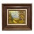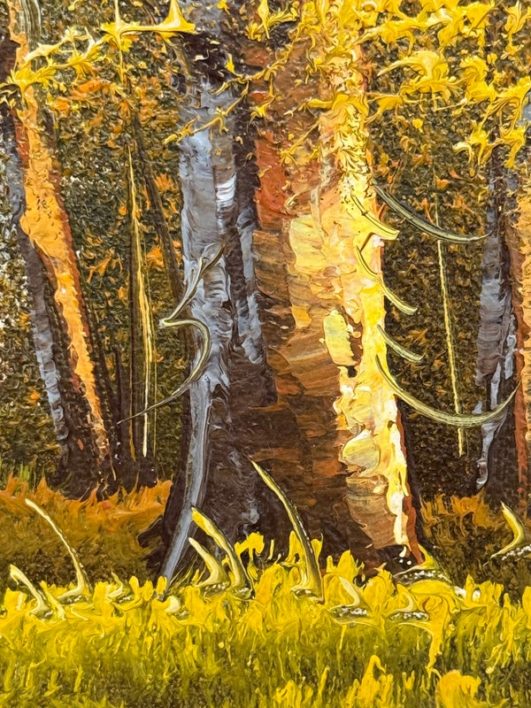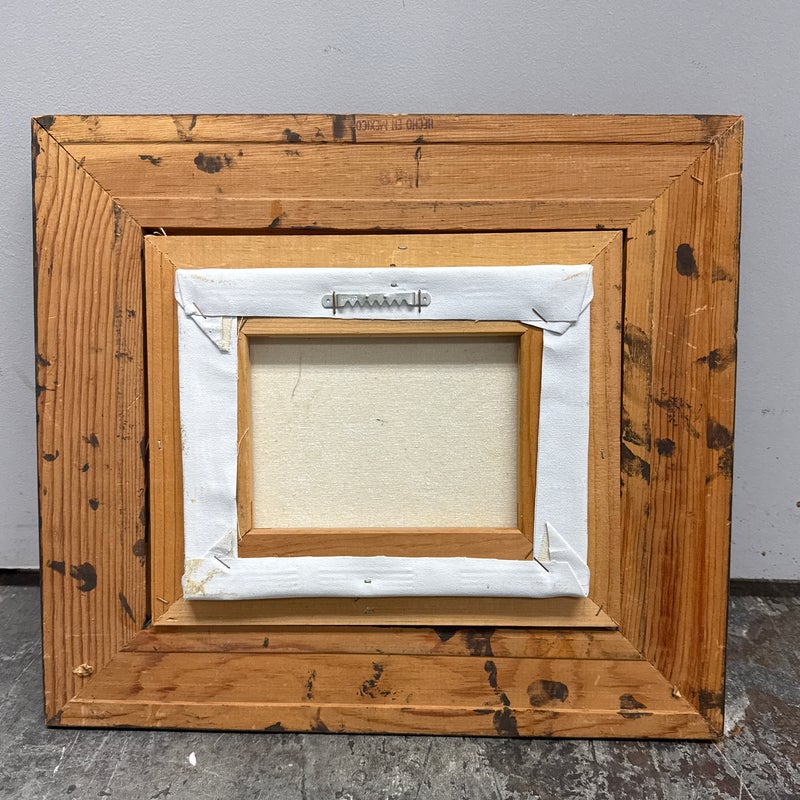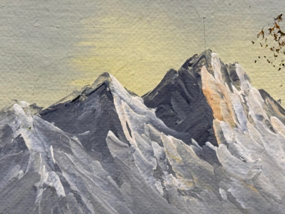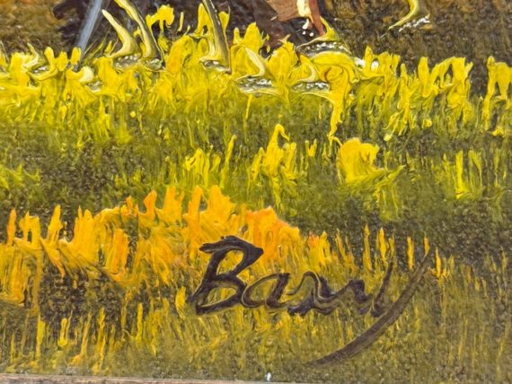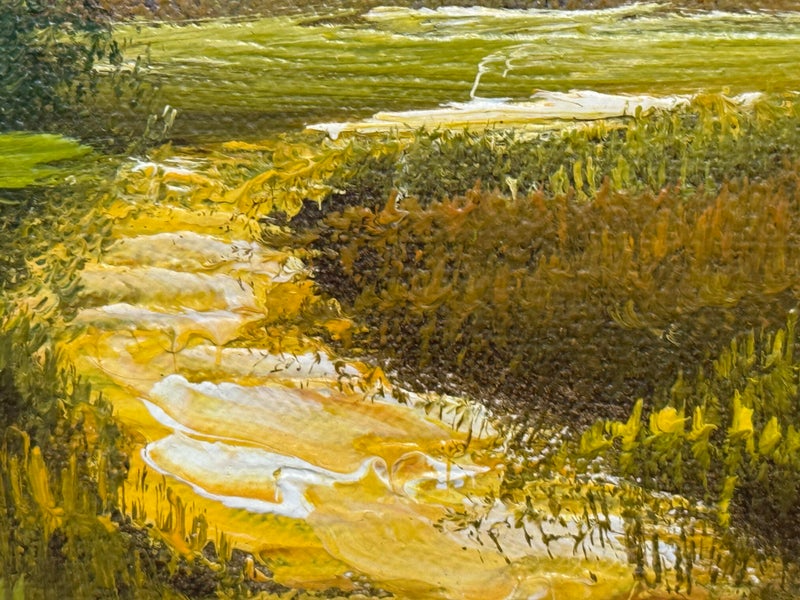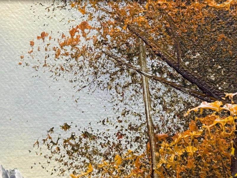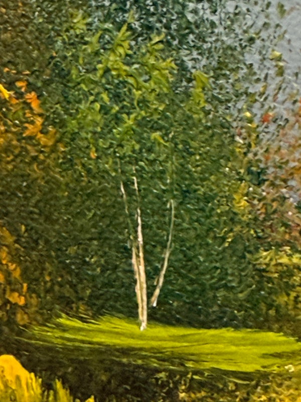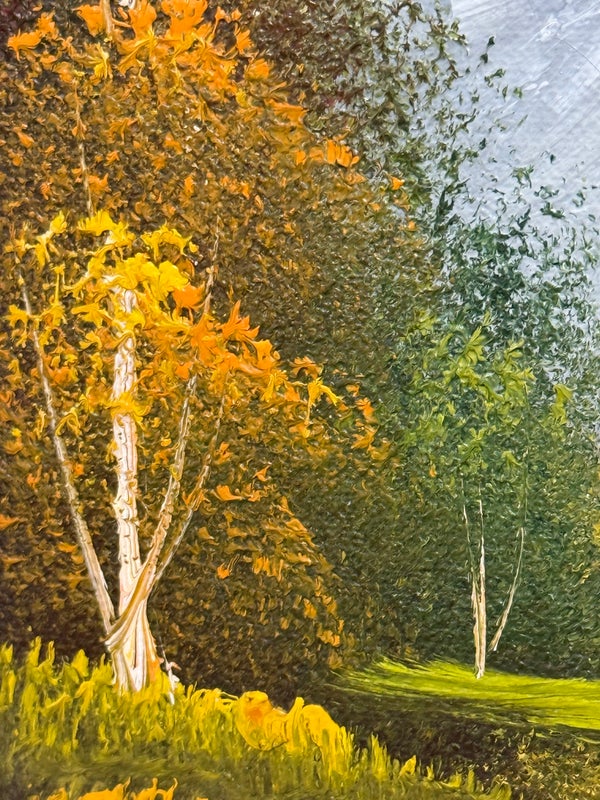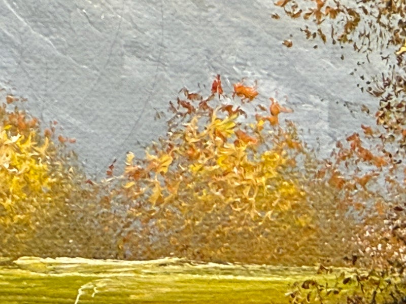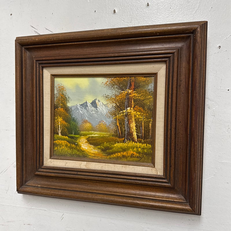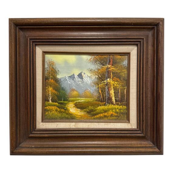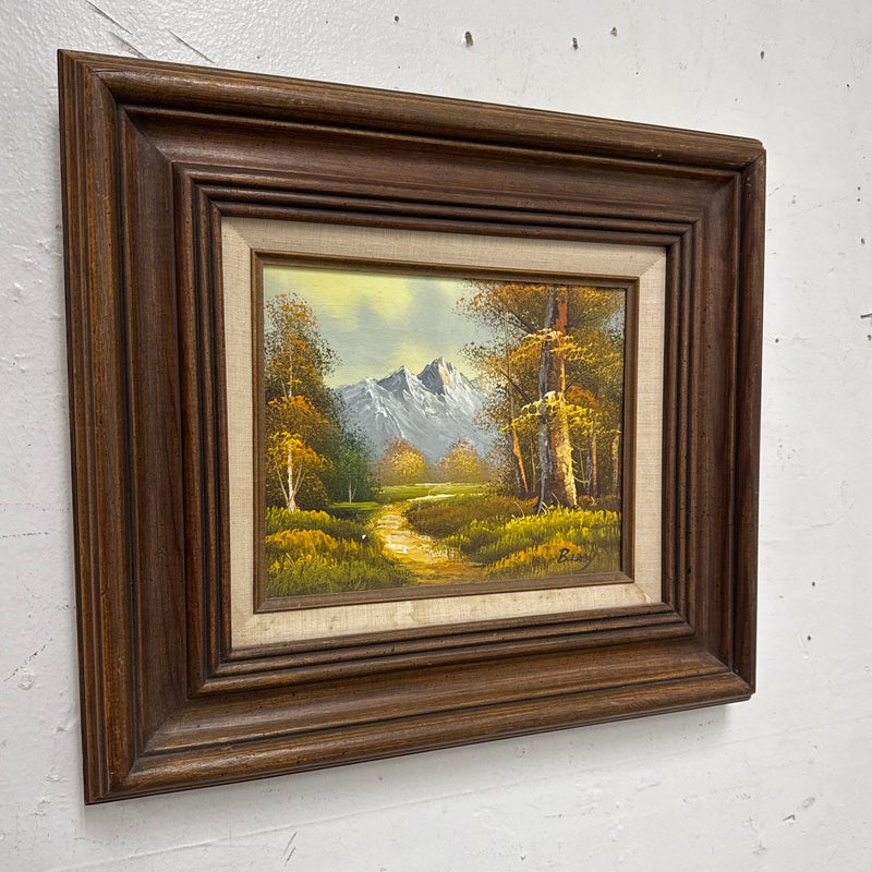 Design Plus Gallery presents a Framed + Linen Matte Landscape Painting, Signed by Artist Barry. The scene shows an autumn day with the leaves changing colors, clear sky above a pathway leading to a Mountain Range. Is in good condition for its usage.