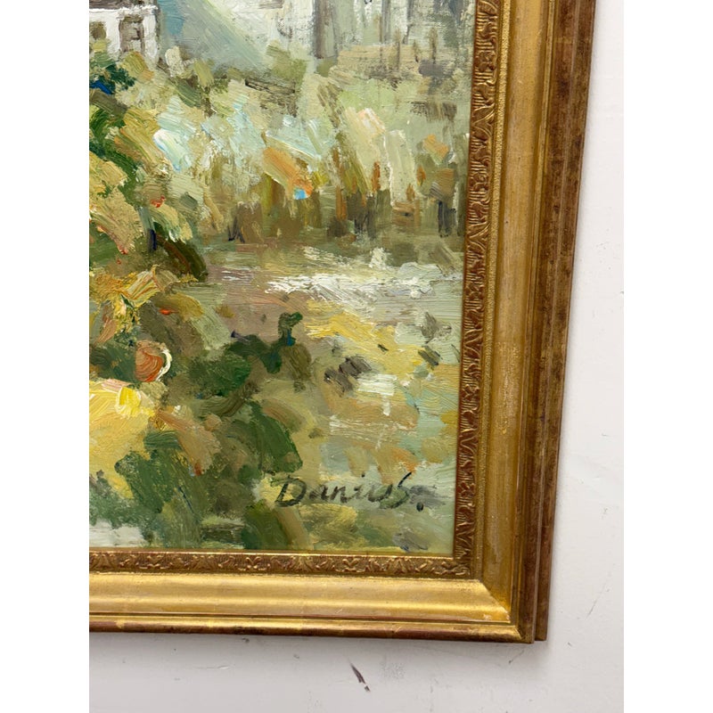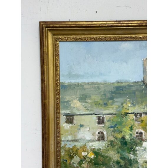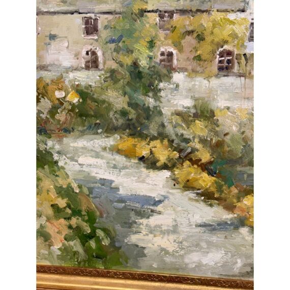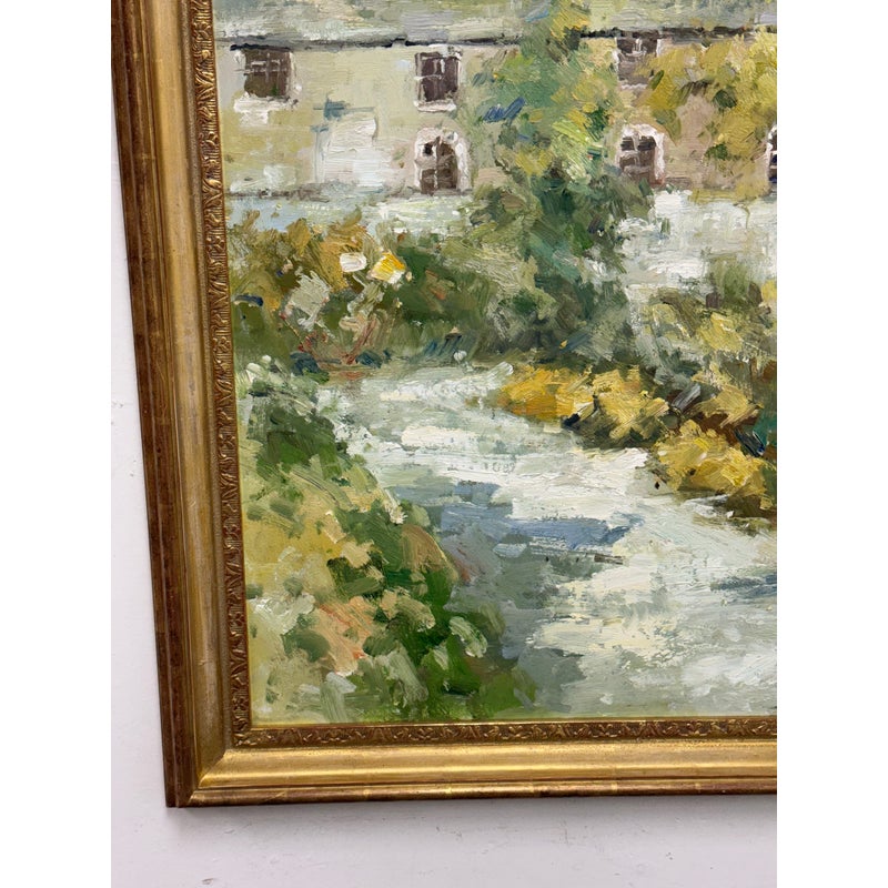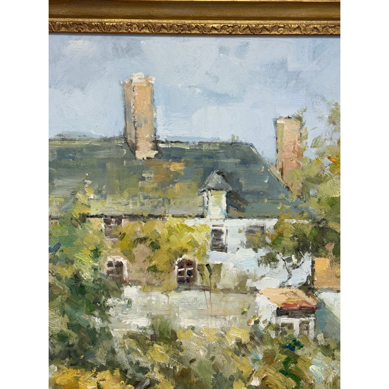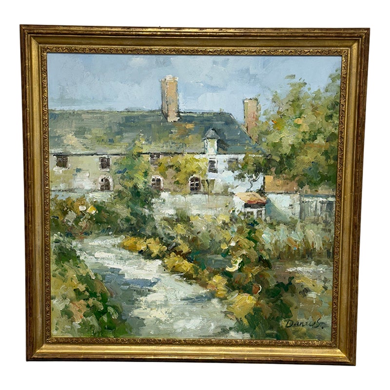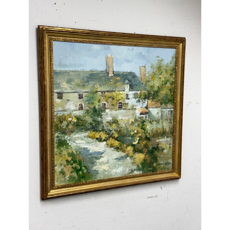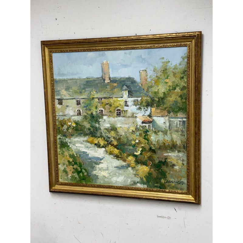 Designn Plus Gallery presents a Signed Original Oil Painting by Artist Darius. A fresh painting of crisp white of the Tudor home, light blue sky, green flowering shrubs with yellowing flowers just gives off a beautiful texture and tone to brighten up any room. Gorgeous golden frame. Is in good condition overall with minimal signs of wear.