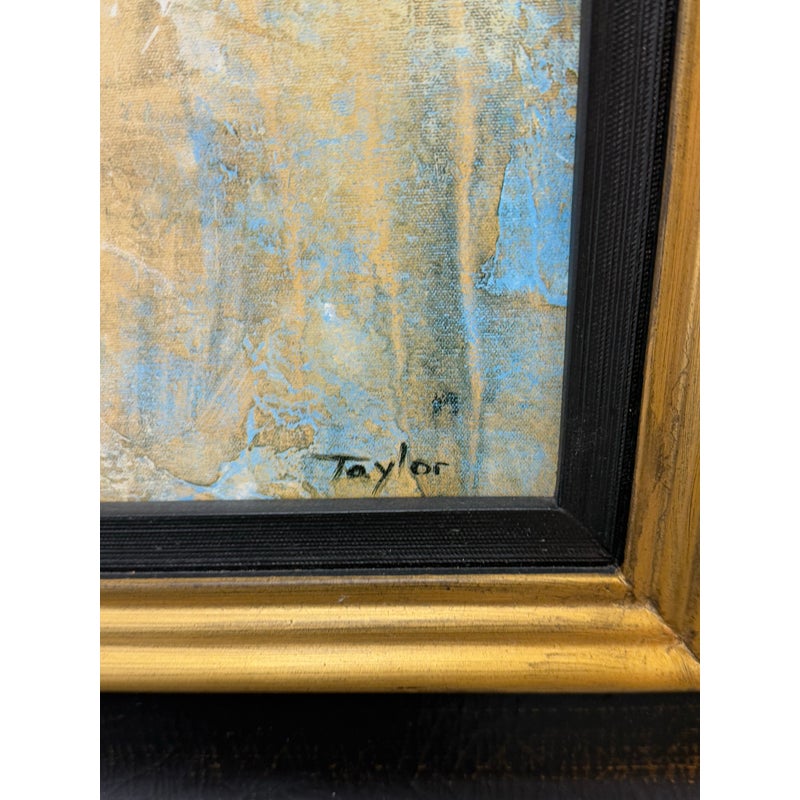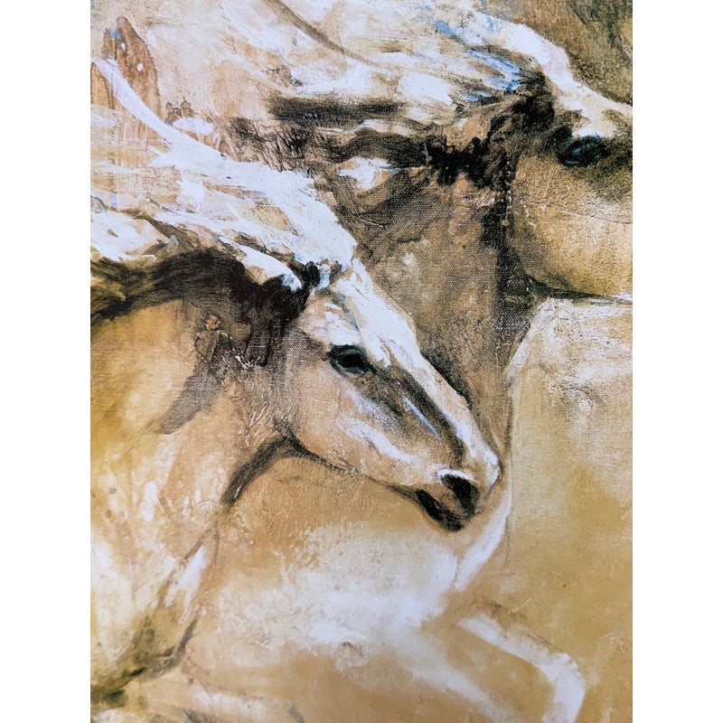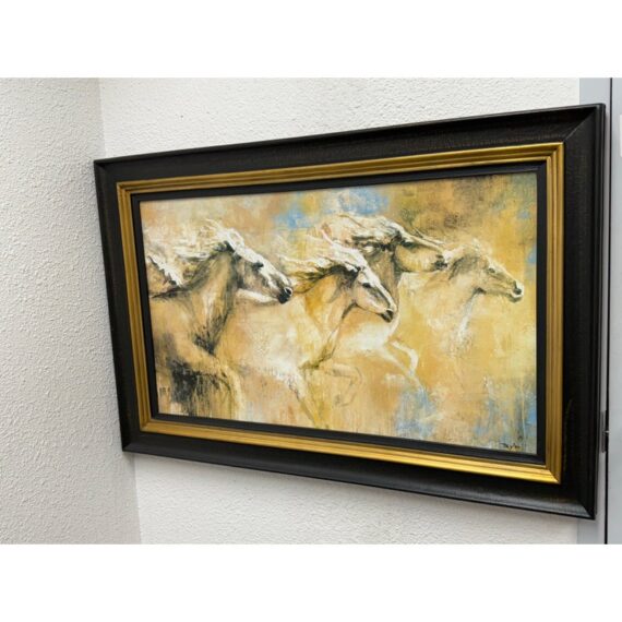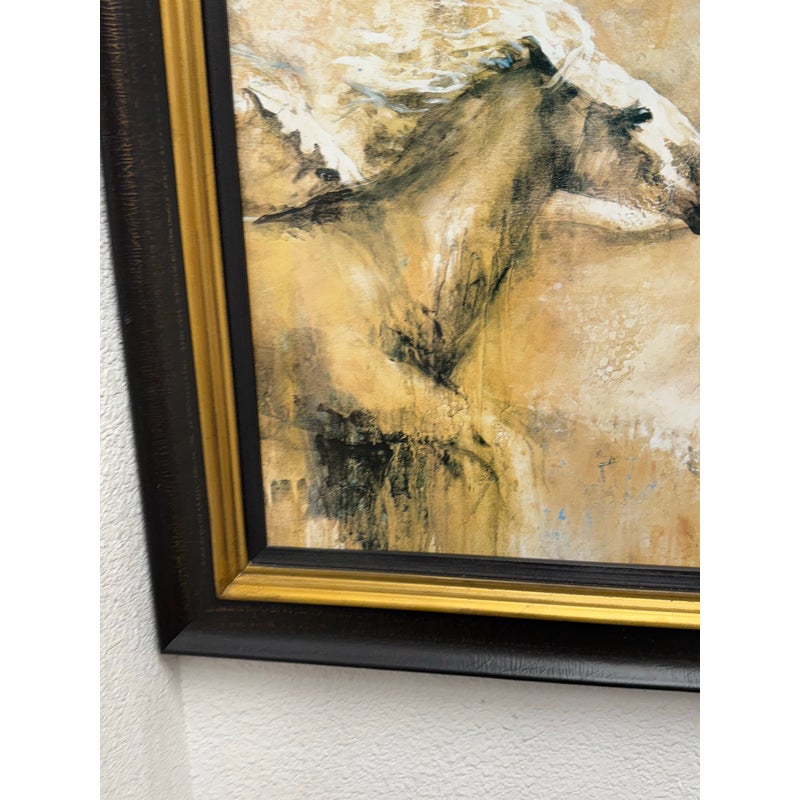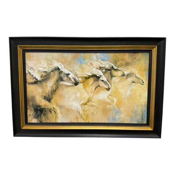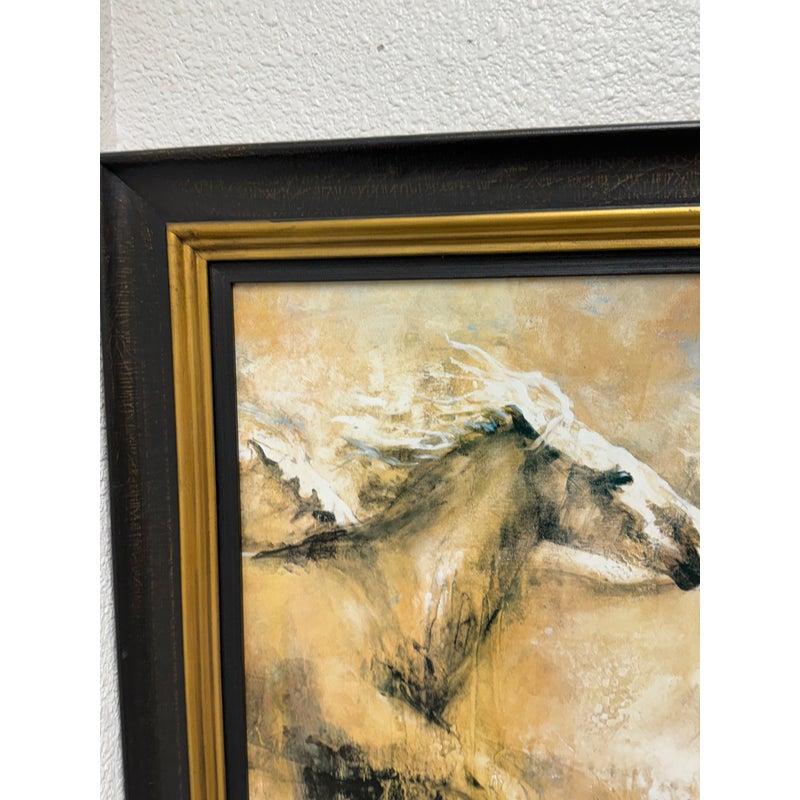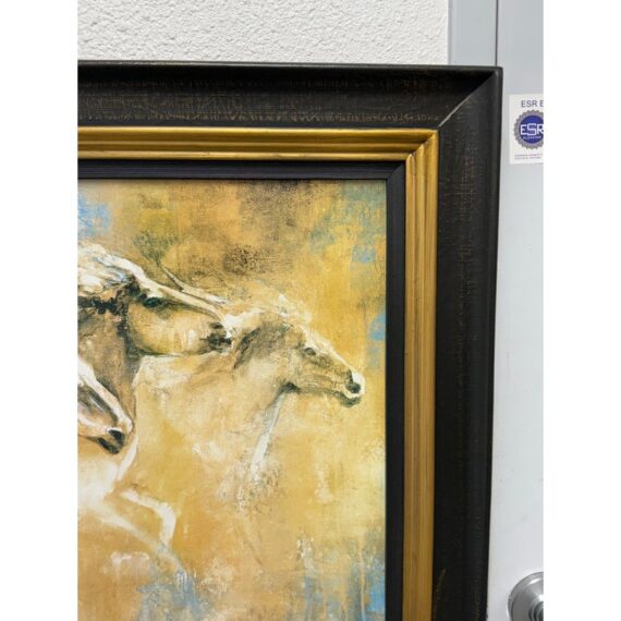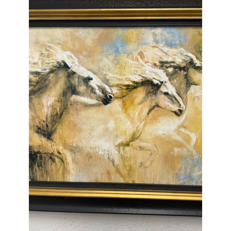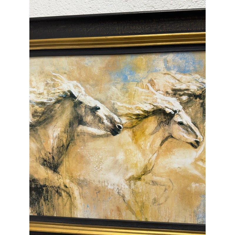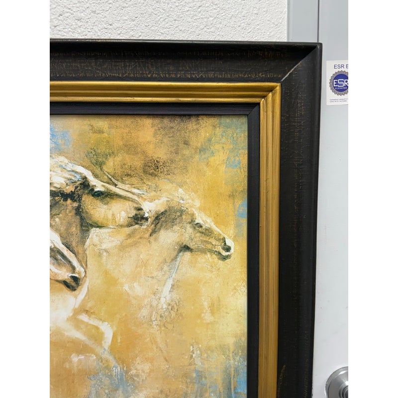 Design Plus Gallery presents a Reproduction Print signed by artist Taylor for the Bombay Company. Titled “Boundless Beauty Ardentes Cavales”. Features set of four majestic horses in motion. Custom framed with a dark and gold finish trim. Warm golds, whites, blacks and blue creates soothing art piece. In good condition, minimal wear from usage. Made in USA.