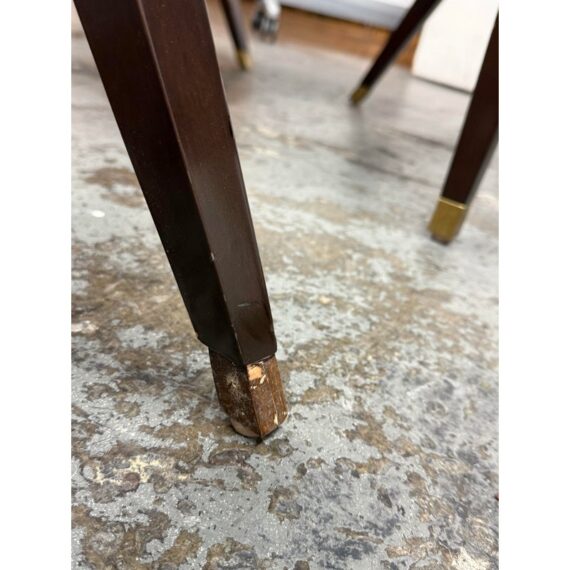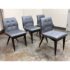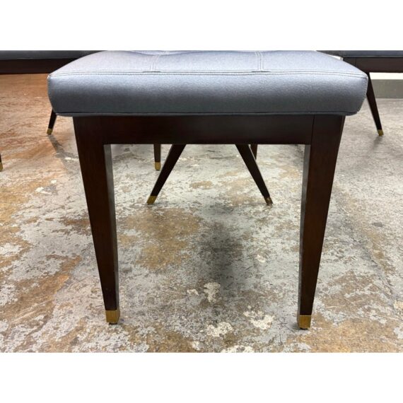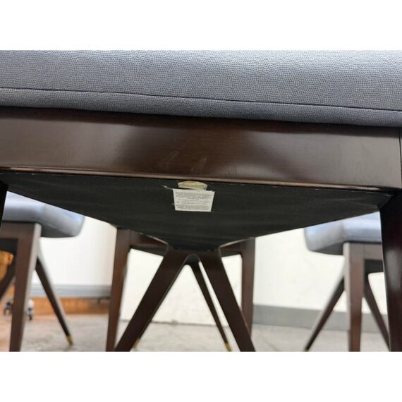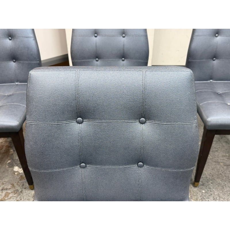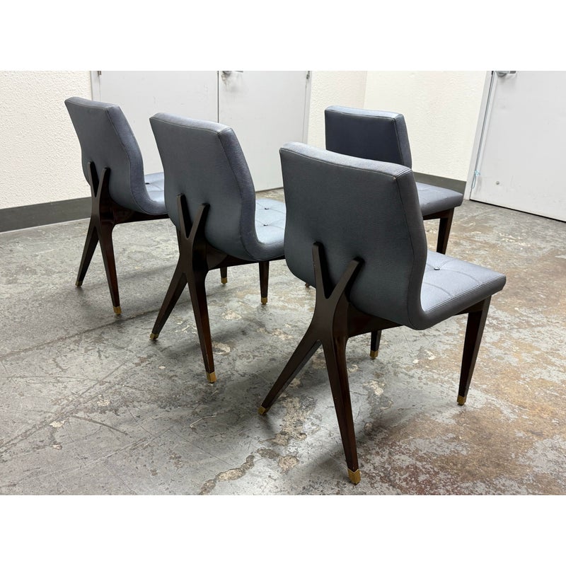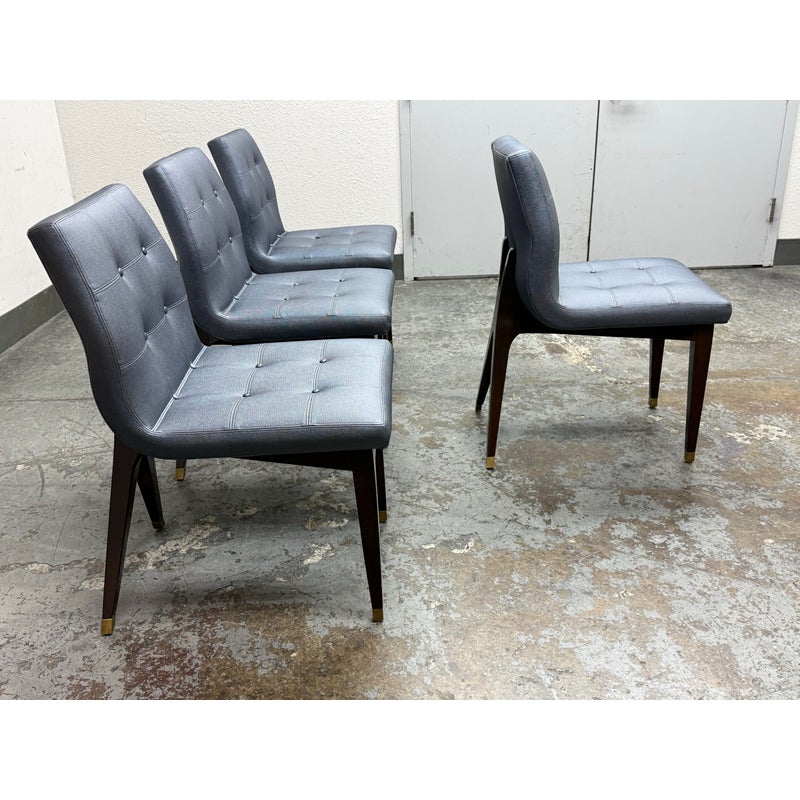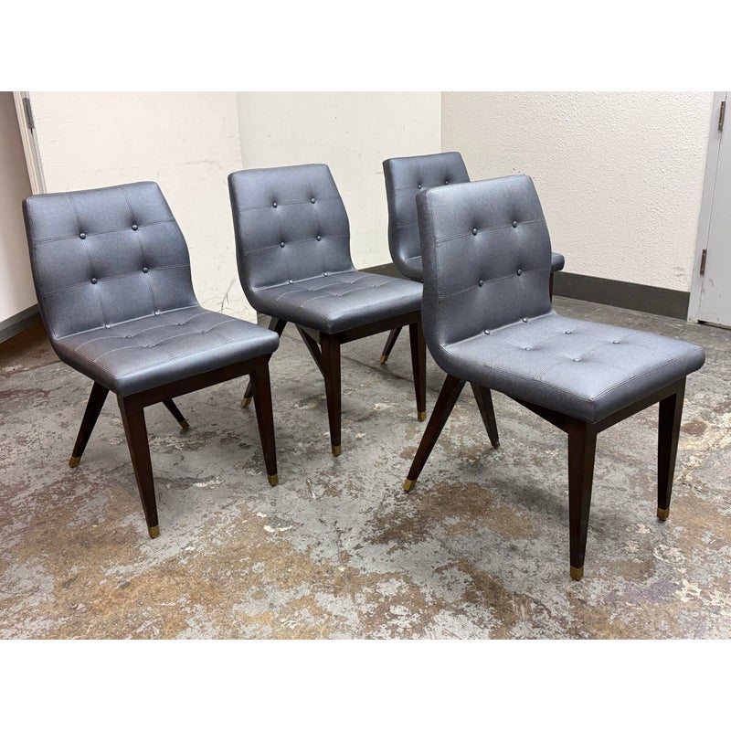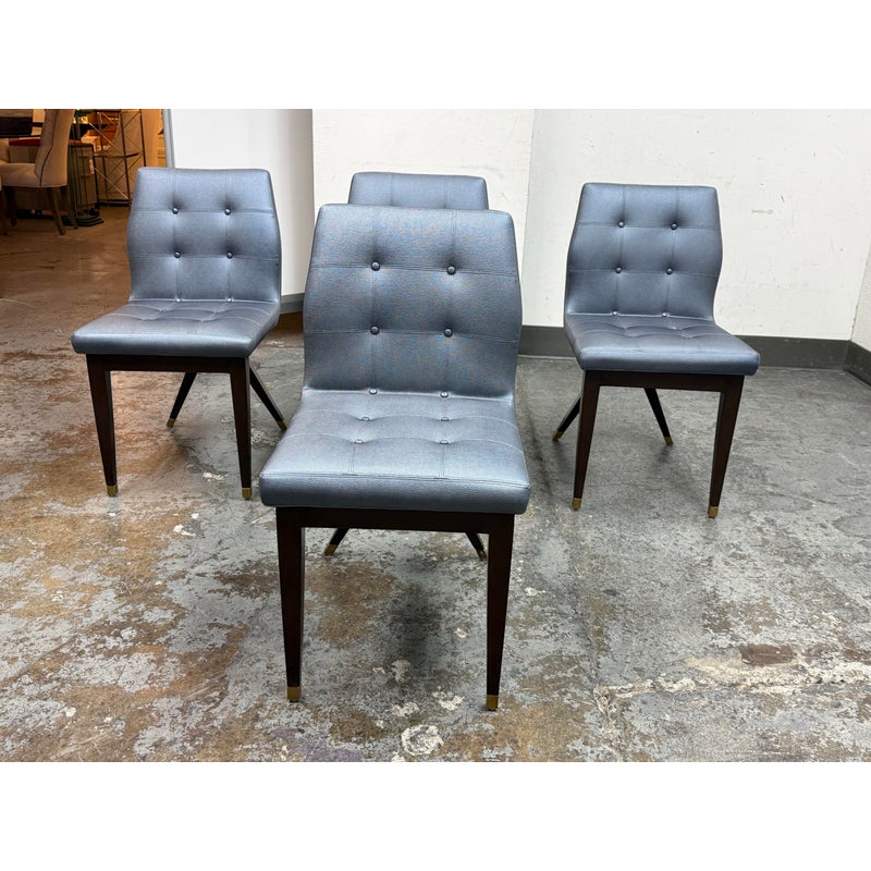 Design Plus Gallery presents a Set of Four X Back Side Chairs from Artistic Frame. The X Back chair has a contoured back, adding to its comfort and style. The boxed upholstery sits on a triangular wood apron support that attaches to a nicely executed X back. They are in a steely, if not, silvery blue with button tufted box stitched inside back and seat. They have contemporary mahogany stained legs with brass capped feet. The brand stamp is on each base and Artistic Frame has been in business since 1927. One chair has a button missing, another chair has a missing brass foot cap. aThere is visible scratches to the wood but overall they are in good condition. Made in the USA.